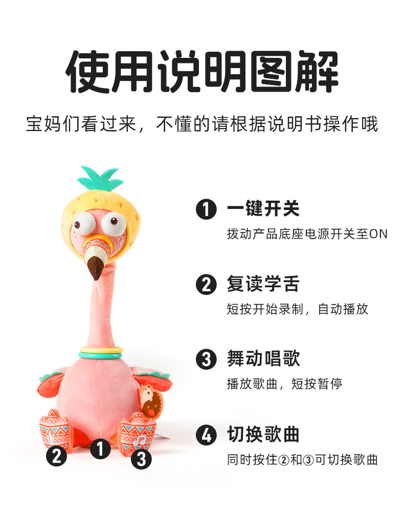 • 큰 눈의 귀여운 트위스트 뮤직 인형 - 파인애플 여장 플라밍고