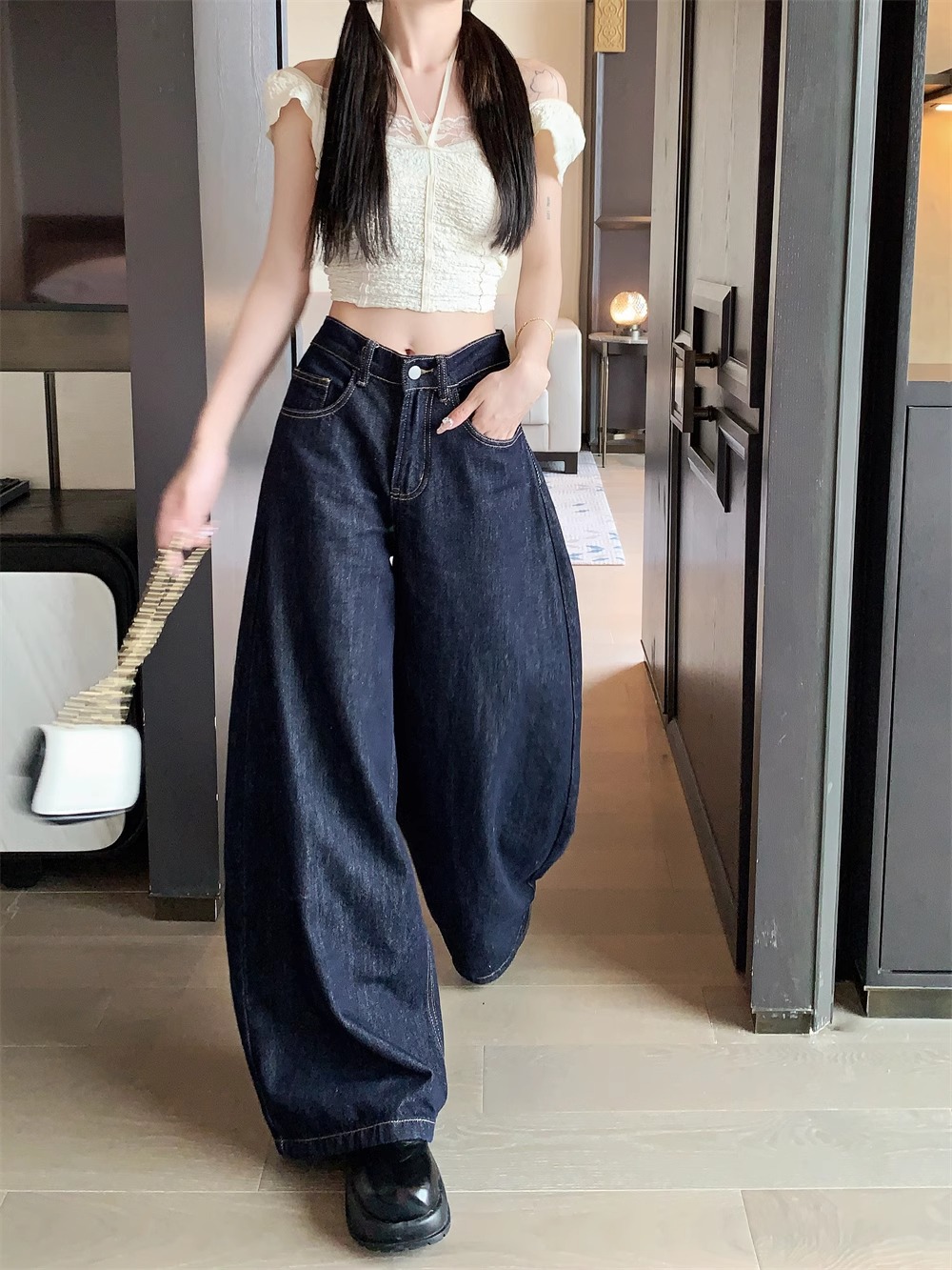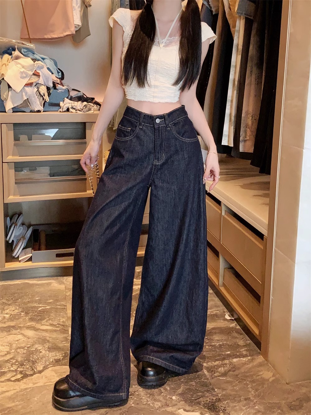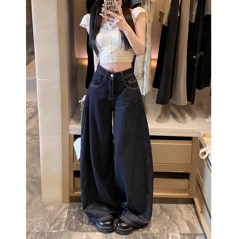 플러스 사이즈 아메리칸 스타일 하이 스트리트 바이브 세탁 데님 넓은 다리 바지 여성용 여름 높은 허리 느슨한 다리 바지 유행 걸레 바지스토어 가기