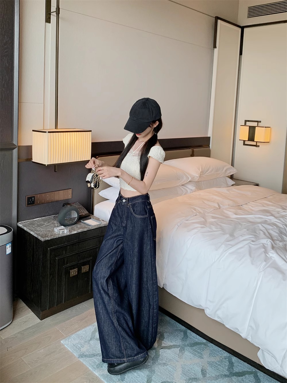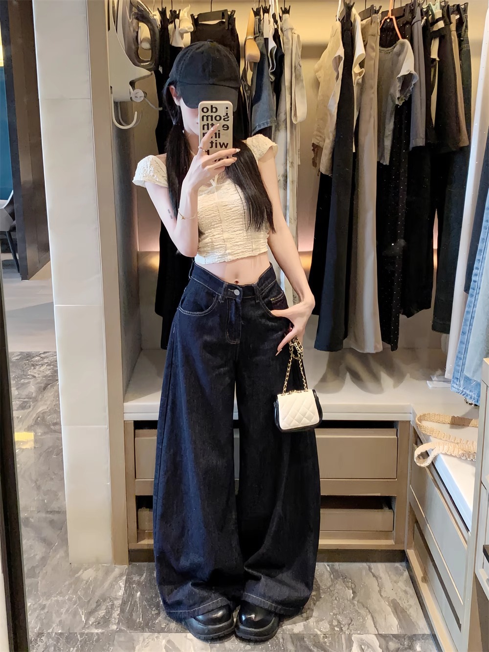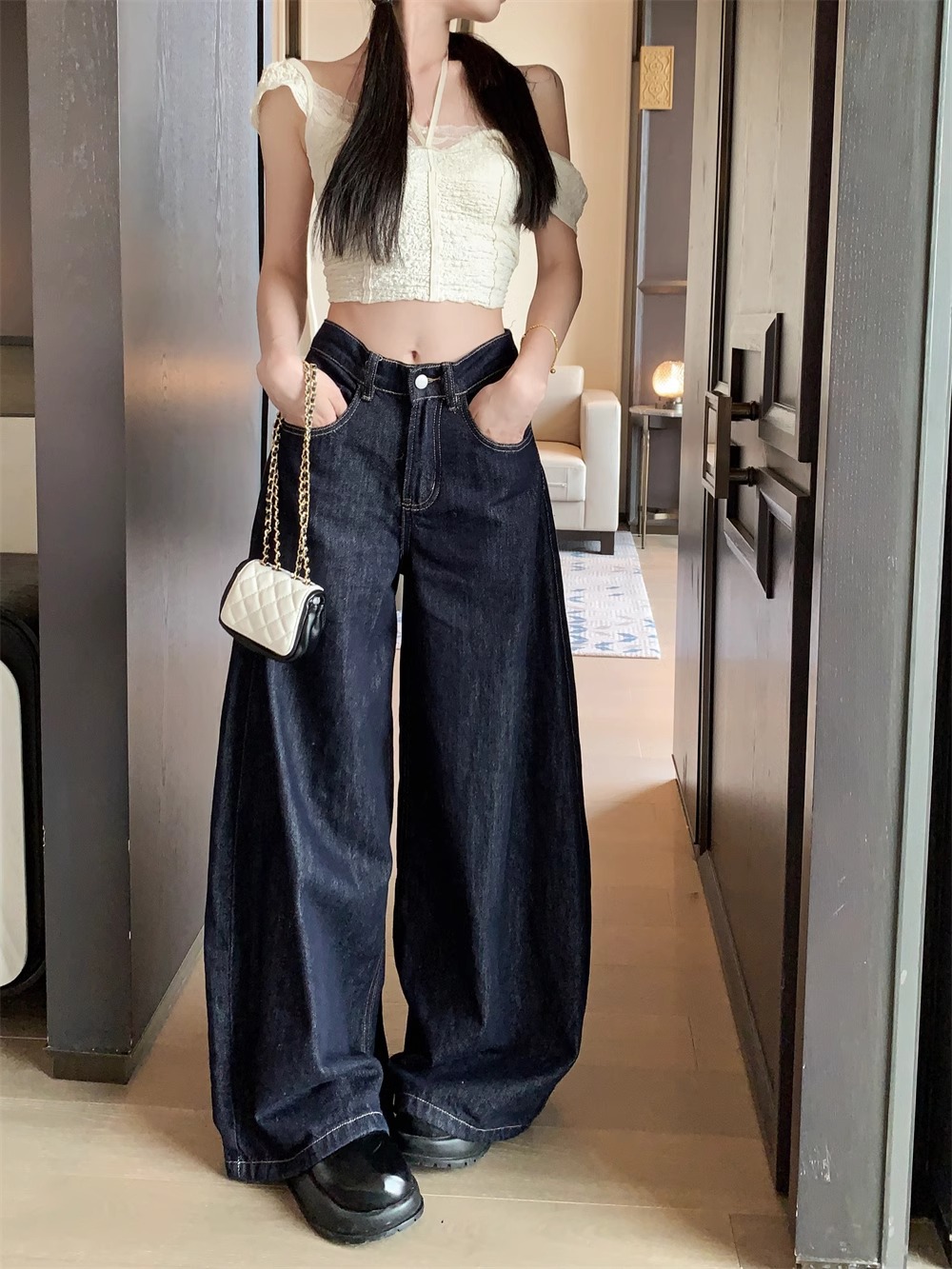 플러스 사이즈 아메리칸 스타일 하이 스트리트 바이브 세탁 데님 넓은 다리 바지 여성용 여름 높은 허리 느슨한 다리 바지 유행 걸레 바지스토어 가기