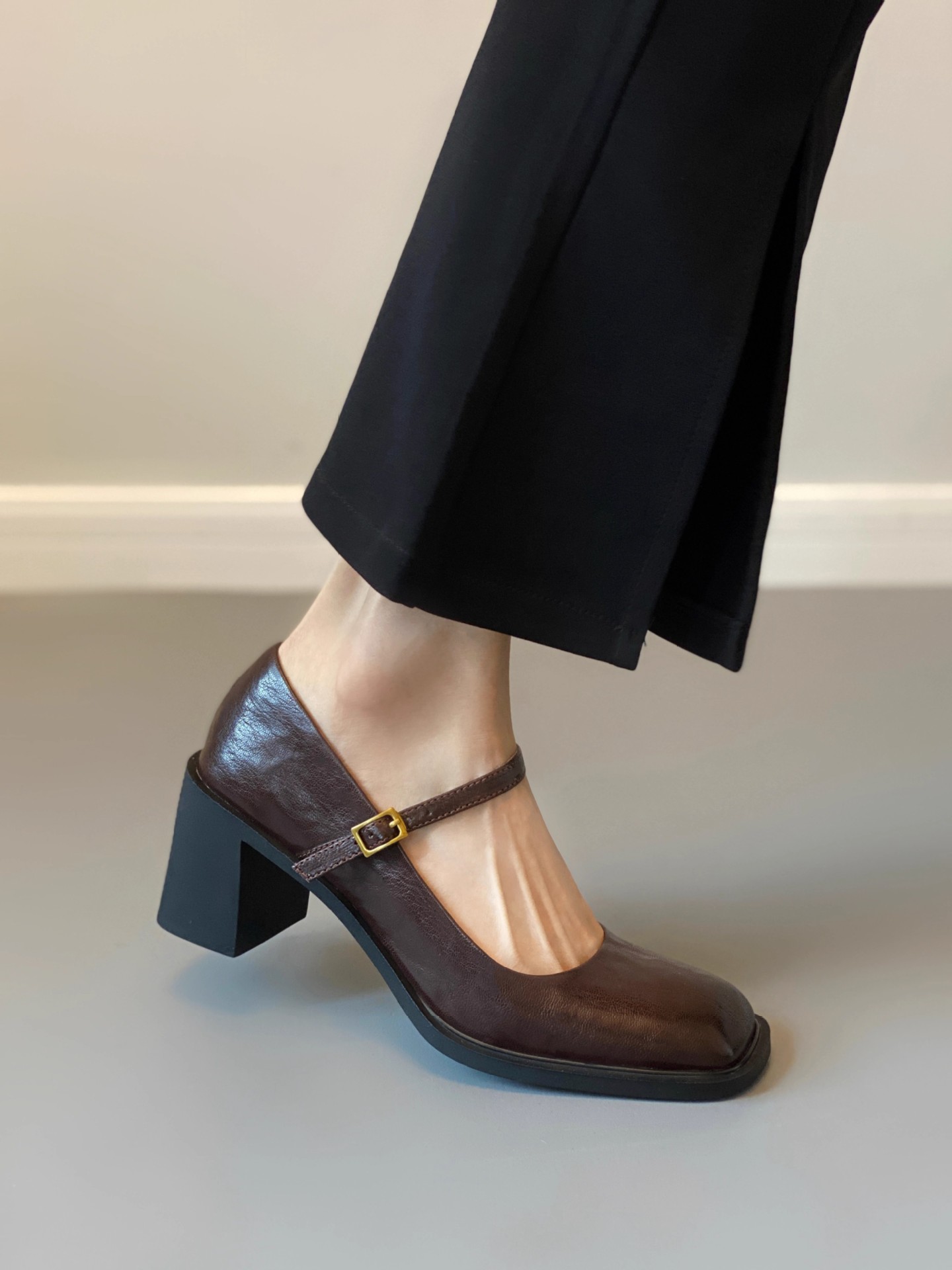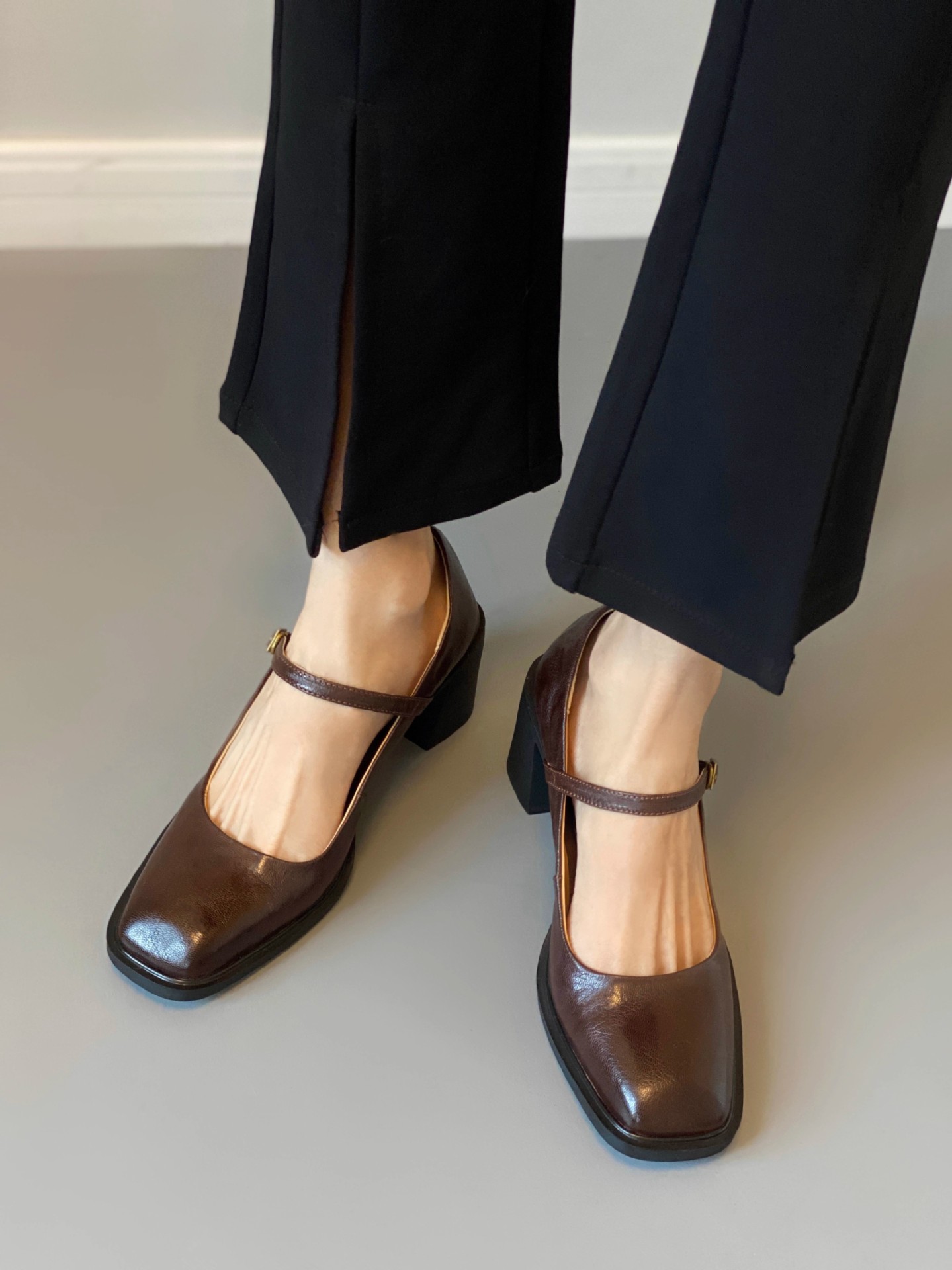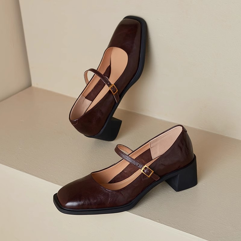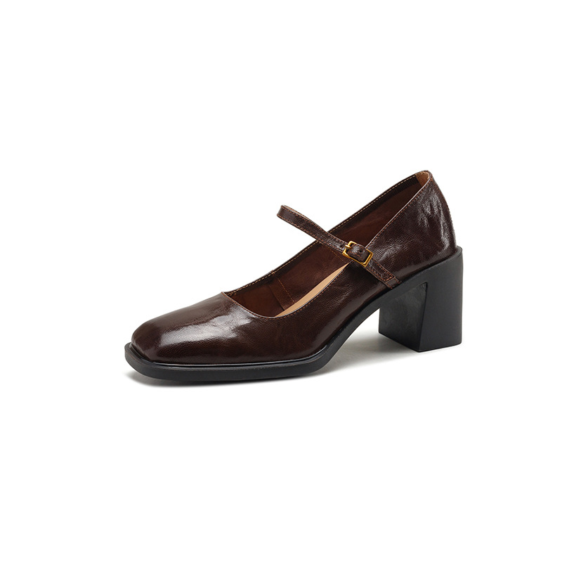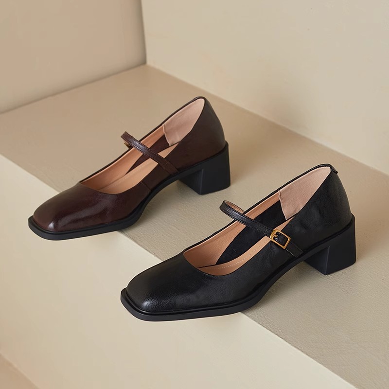 조용한 두꺼운 굽 가죽 신발 여성용 하이힐 메리 제인 얕은 입 버클 메리 제인 신발 가을 새 통근 신발스토어 가기