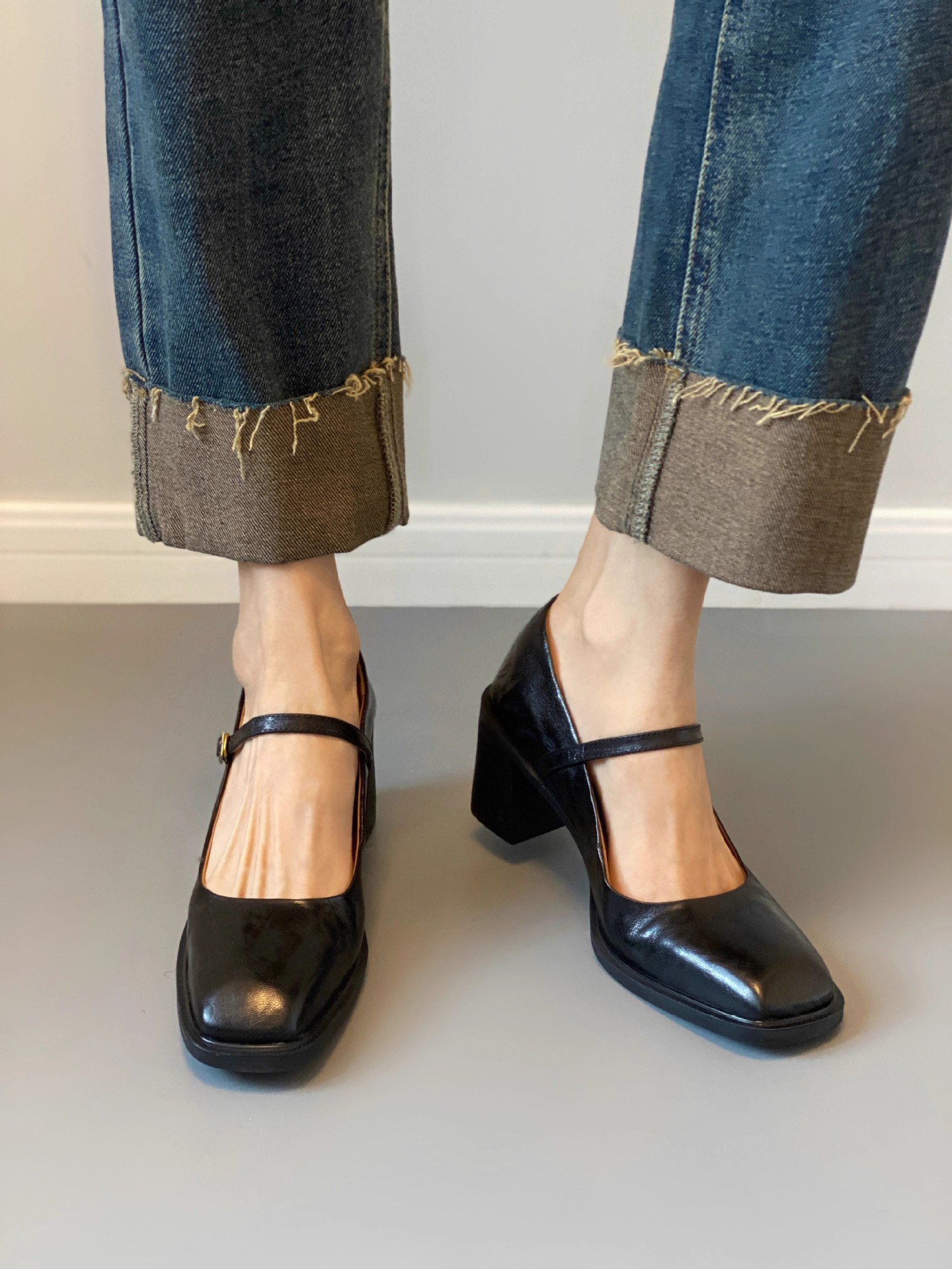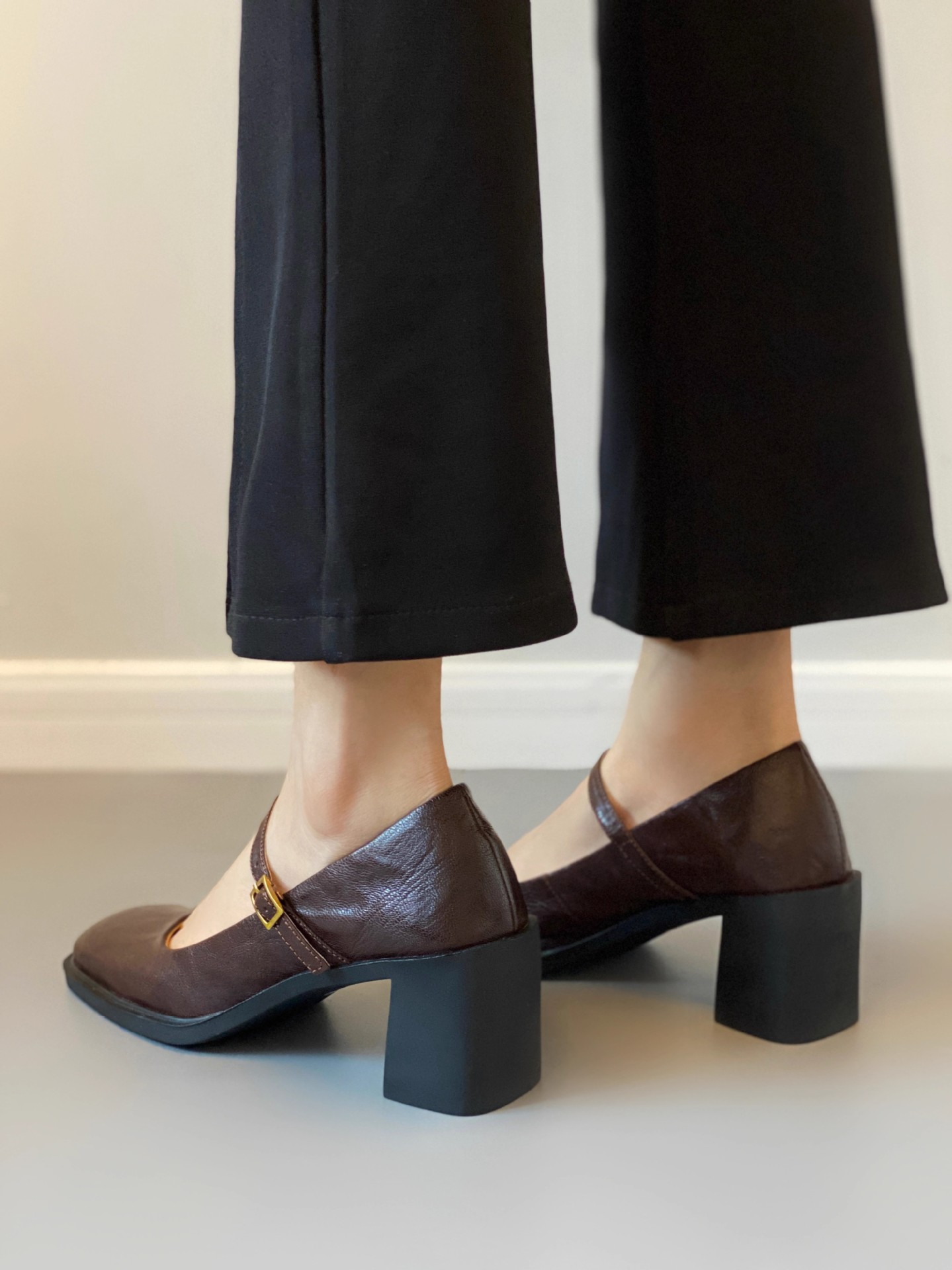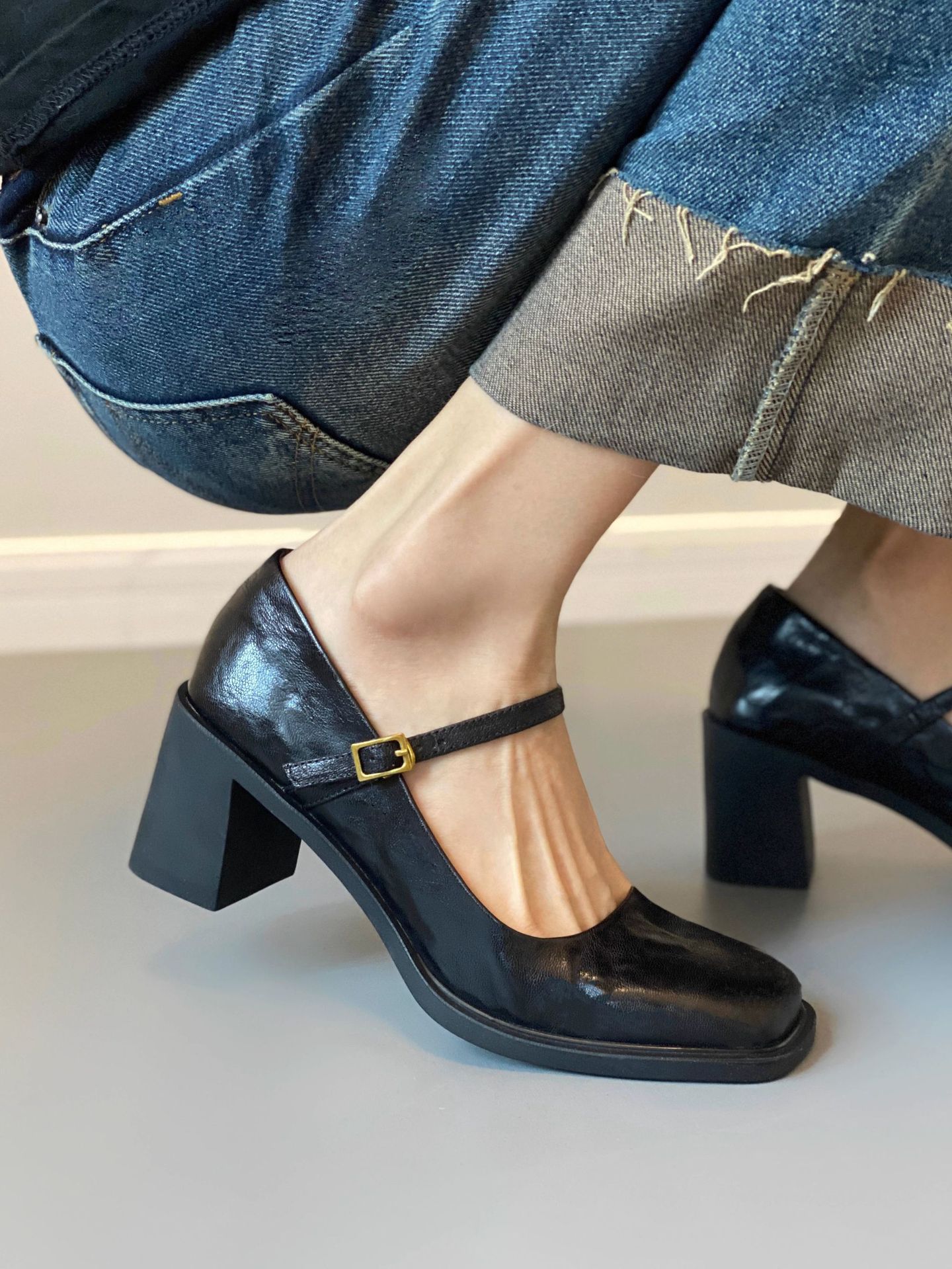 조용한 두꺼운 굽 가죽 신발 여성용 하이힐 메리 제인 얕은 입 버클 메리 제인 신발 가을 새 통근 신발스토어 가기