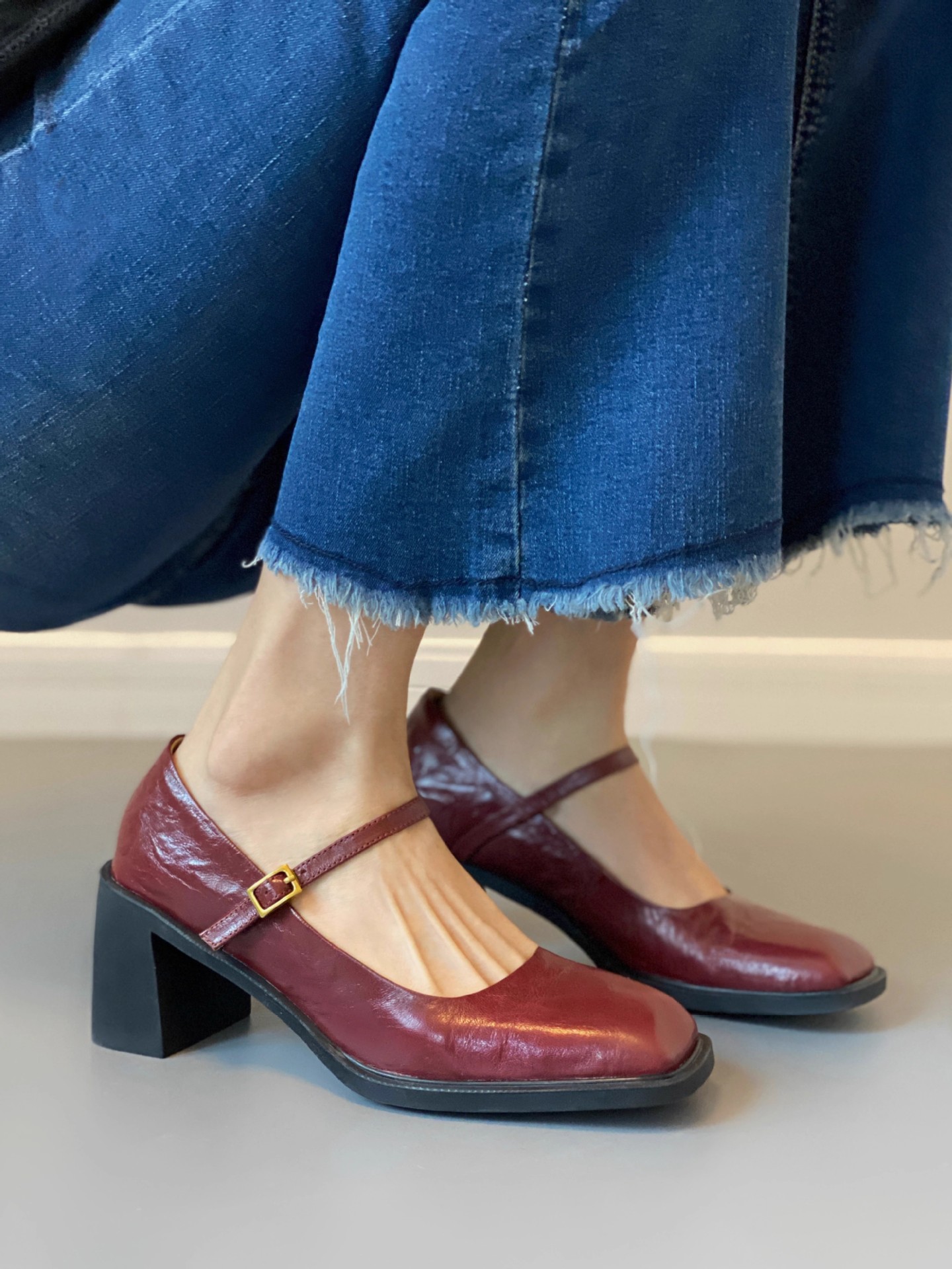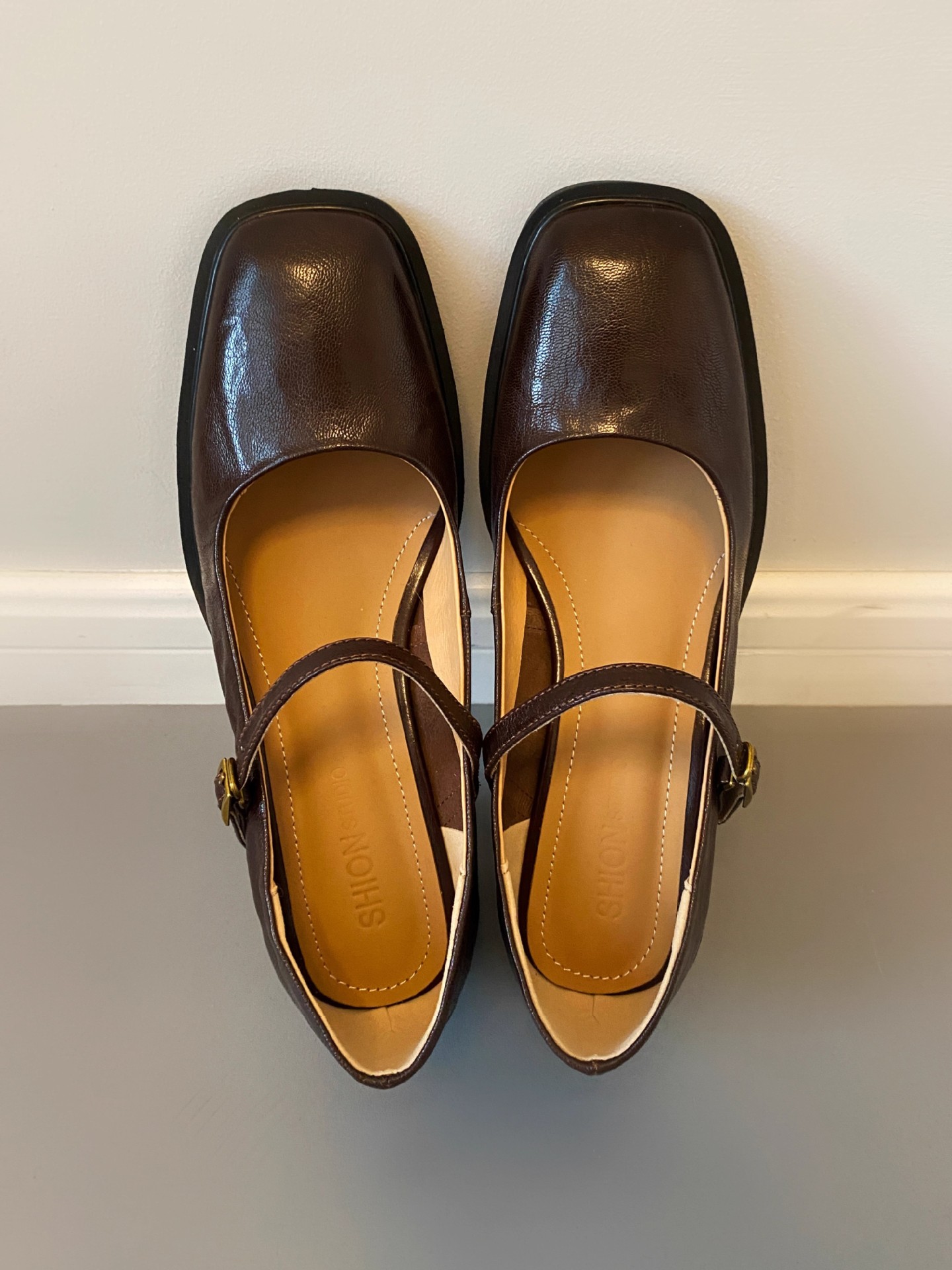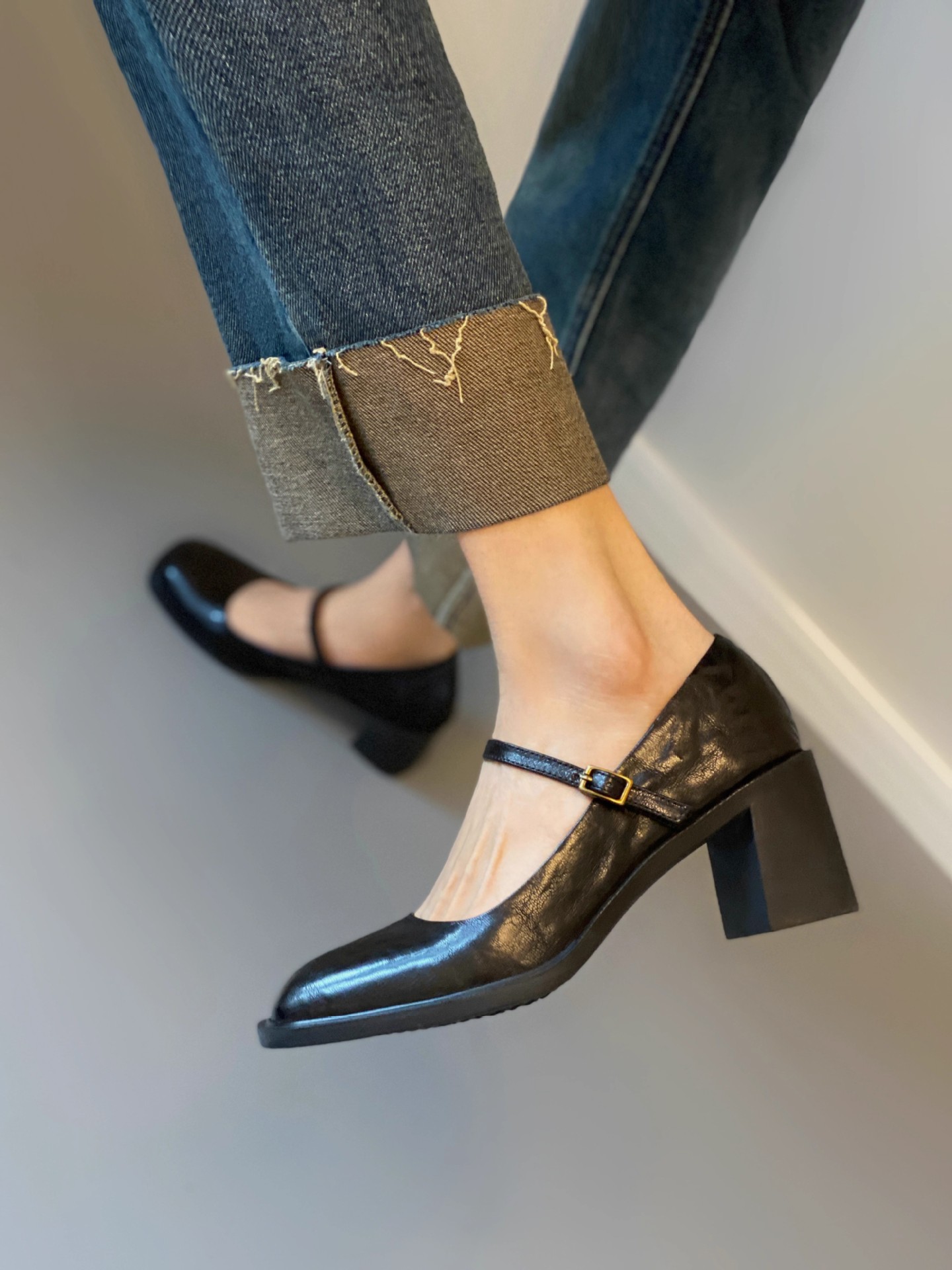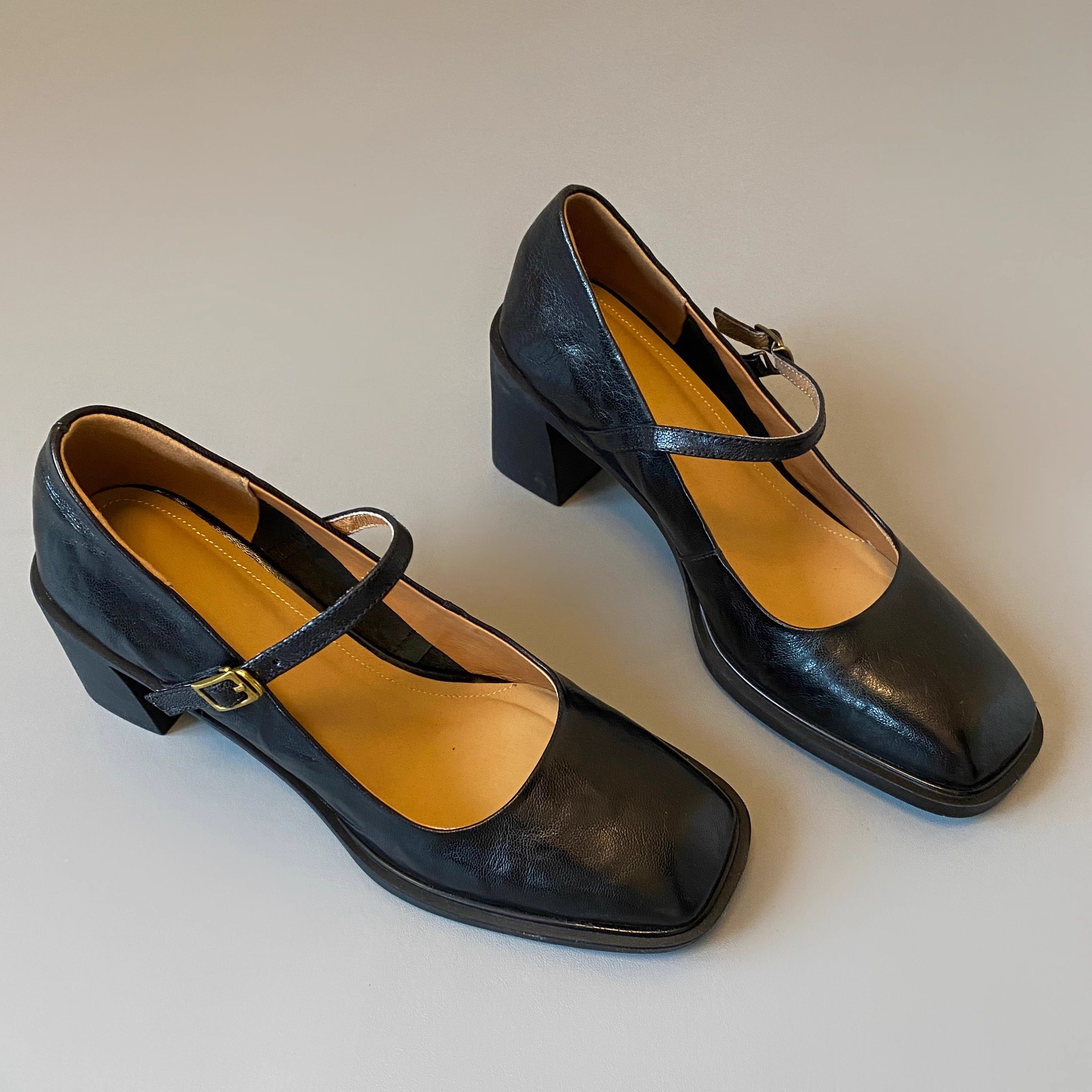 조용한 두꺼운 굽 가죽 신발 여성용 하이힐 메리 제인 얕은 입 버클 메리 제인 신발 가을 새 통근 신발스토어 가기