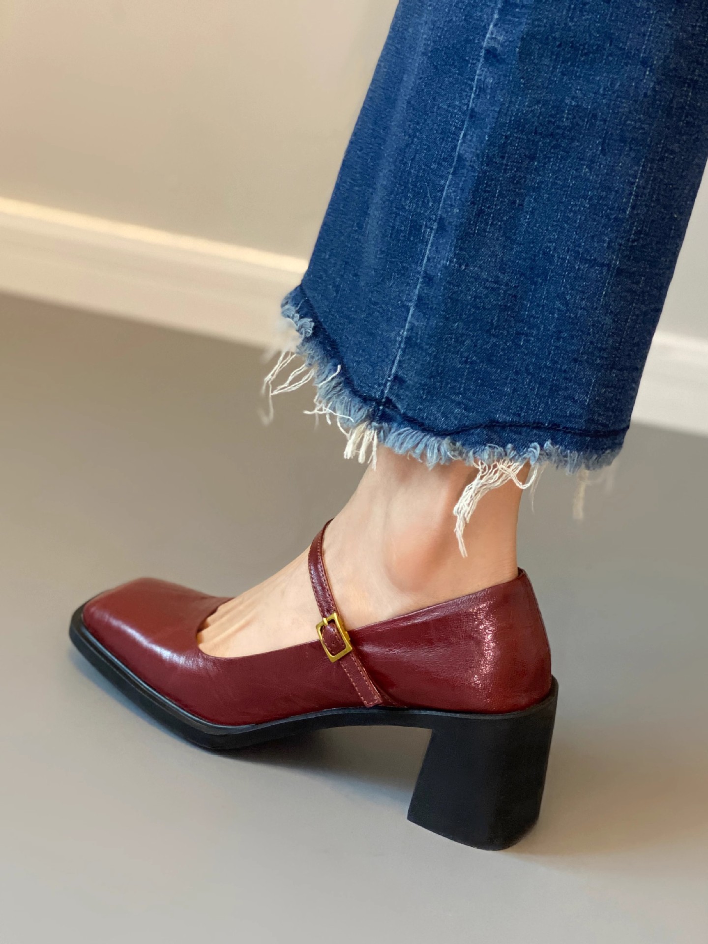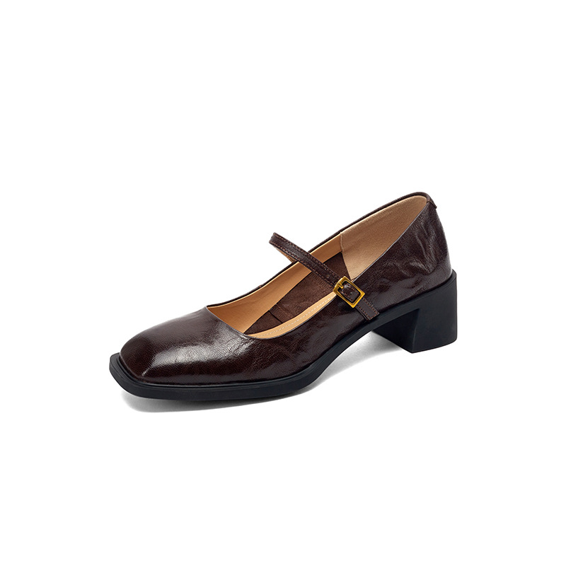 조용한 두꺼운 굽 가죽 신발 여성용 하이힐 메리 제인 얕은 입 버클 메리 제인 신발 가을 새 통근 신발