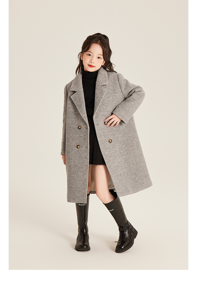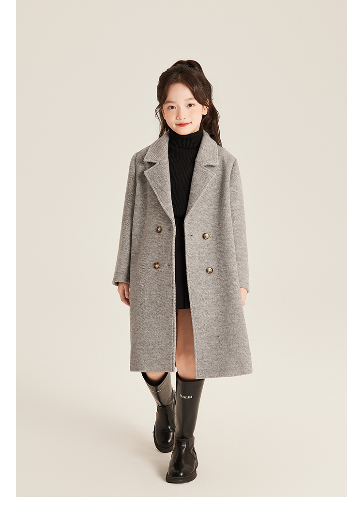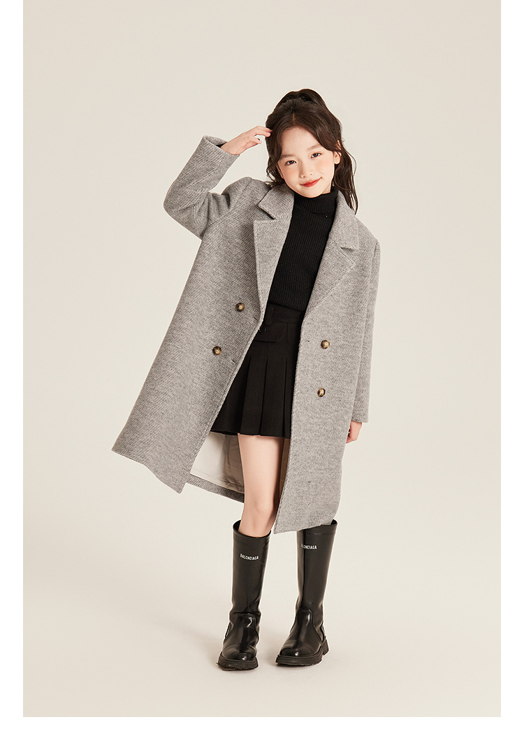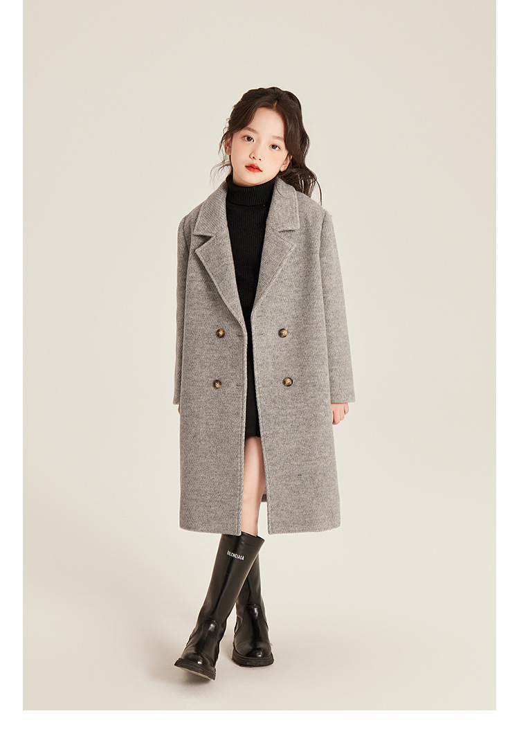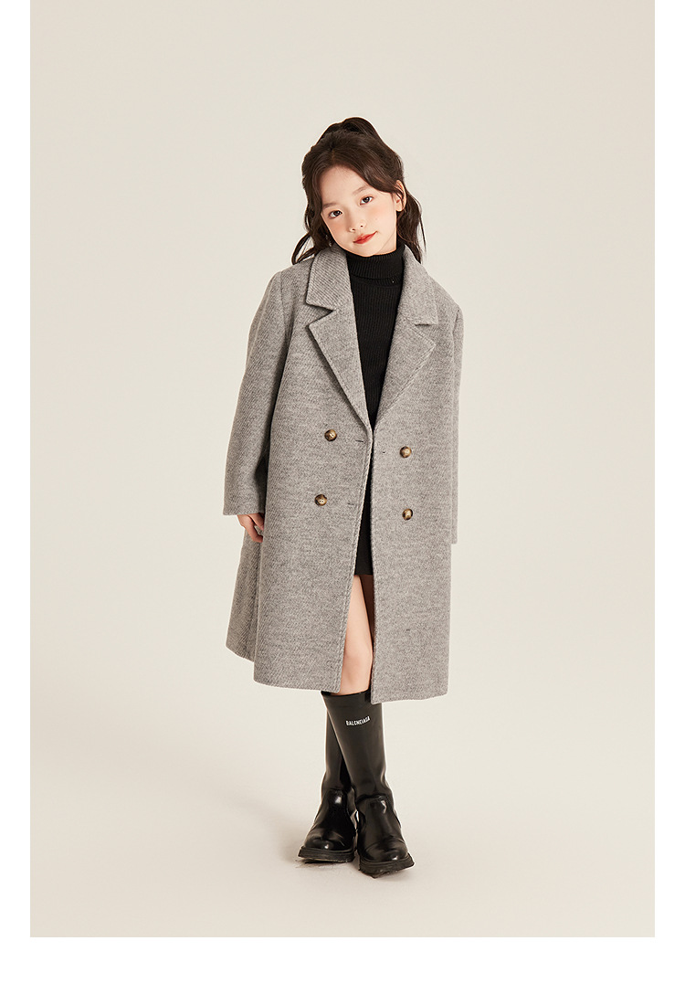Amybaby Girl's Coat Winter 2024 새로운 클래식 그레이 더블 브레스트 옷깃 모직 코트