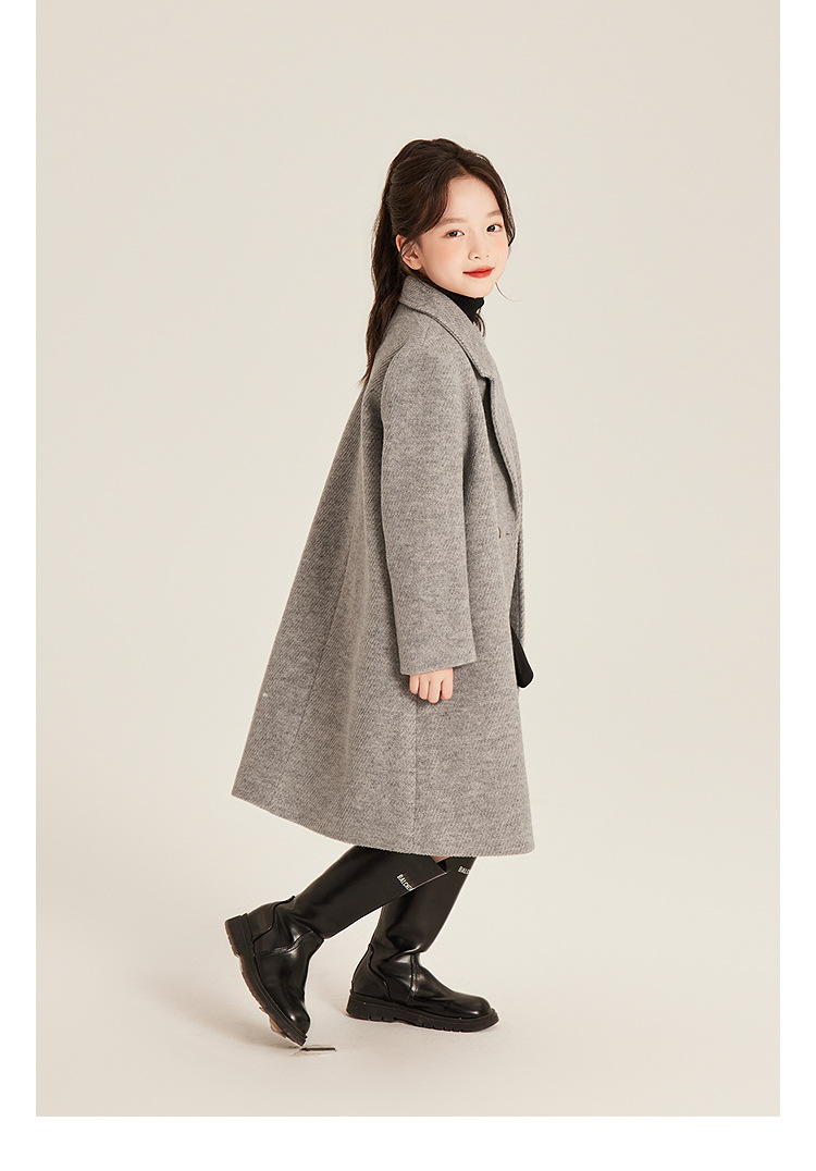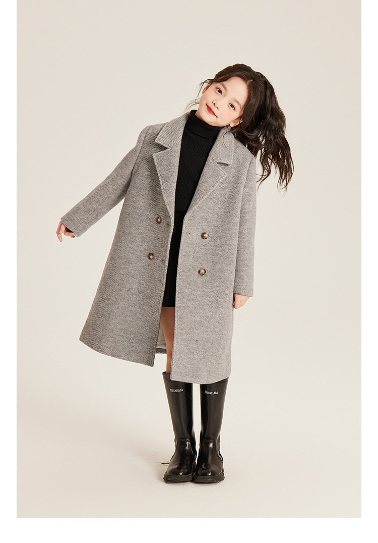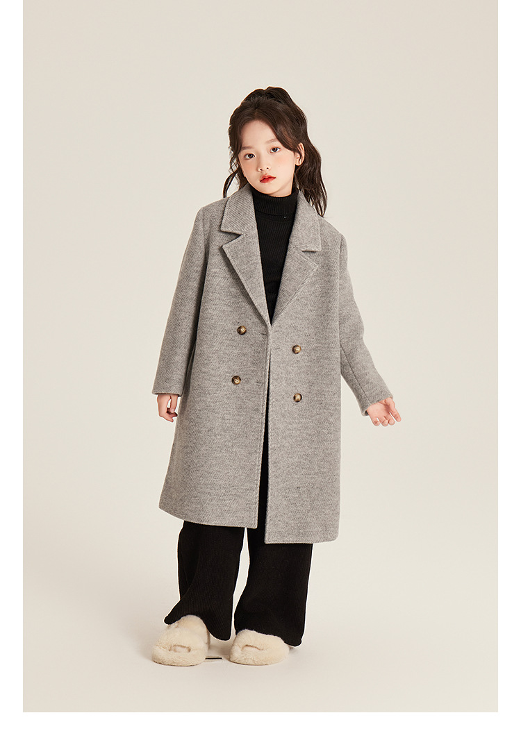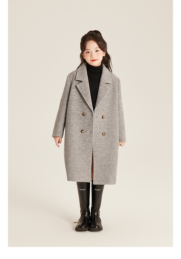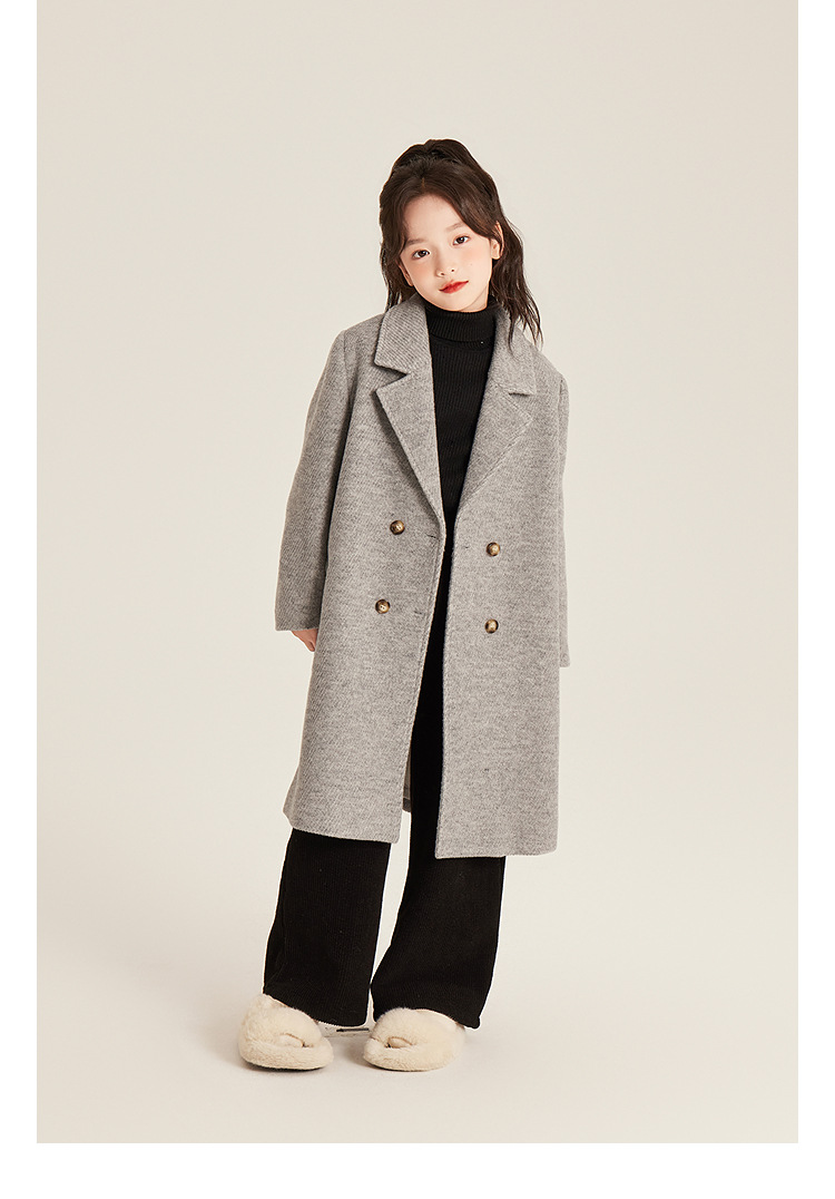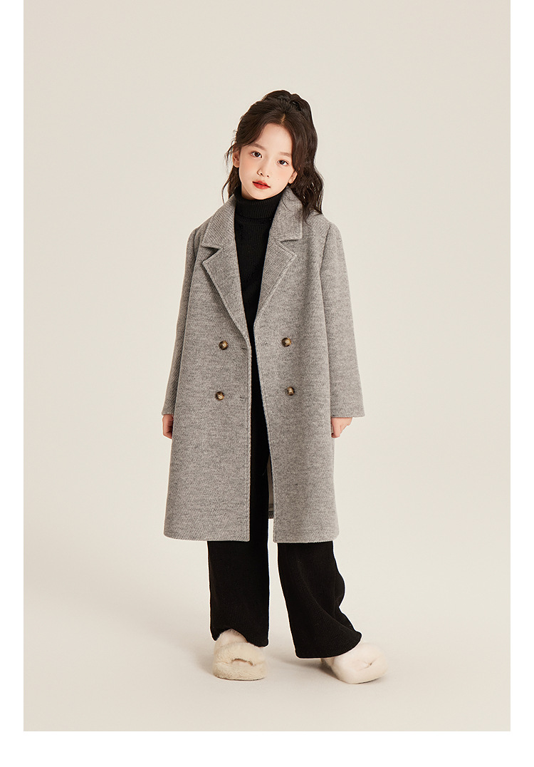 Amybaby Girl's Coat Winter 2024 새로운 클래식 그레이 더블 브레스트 옷깃 모직 코트