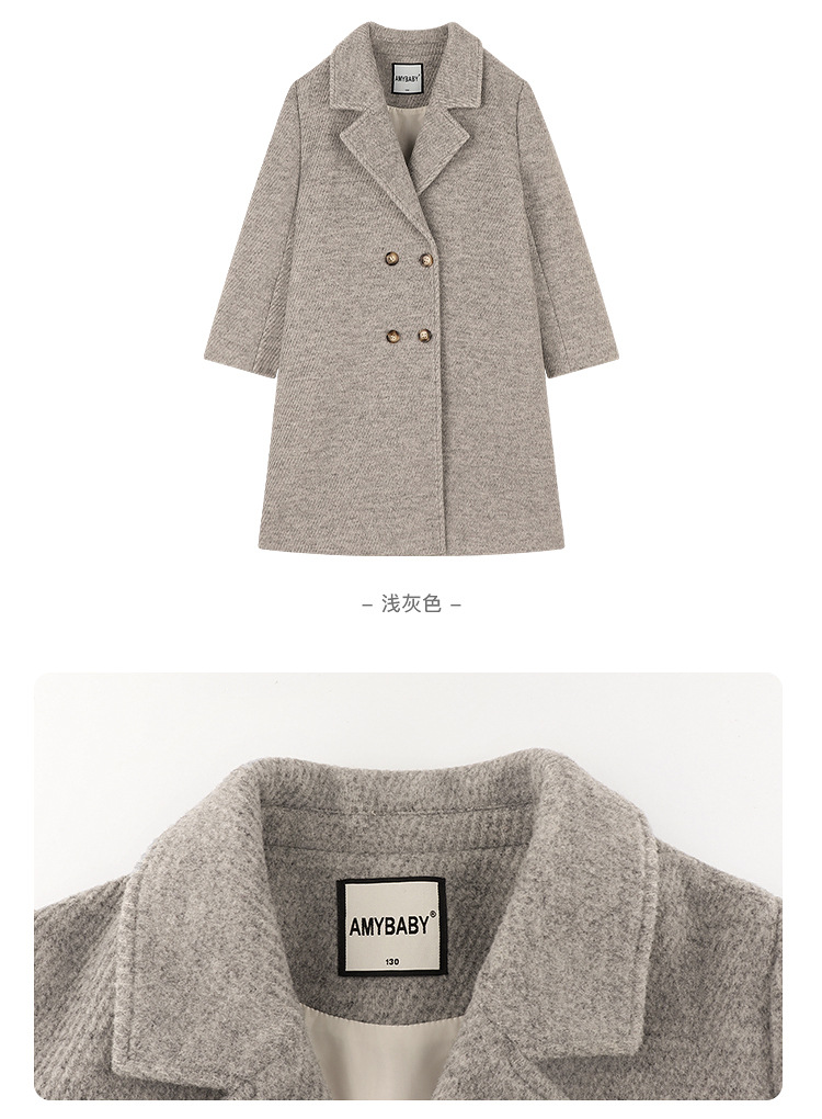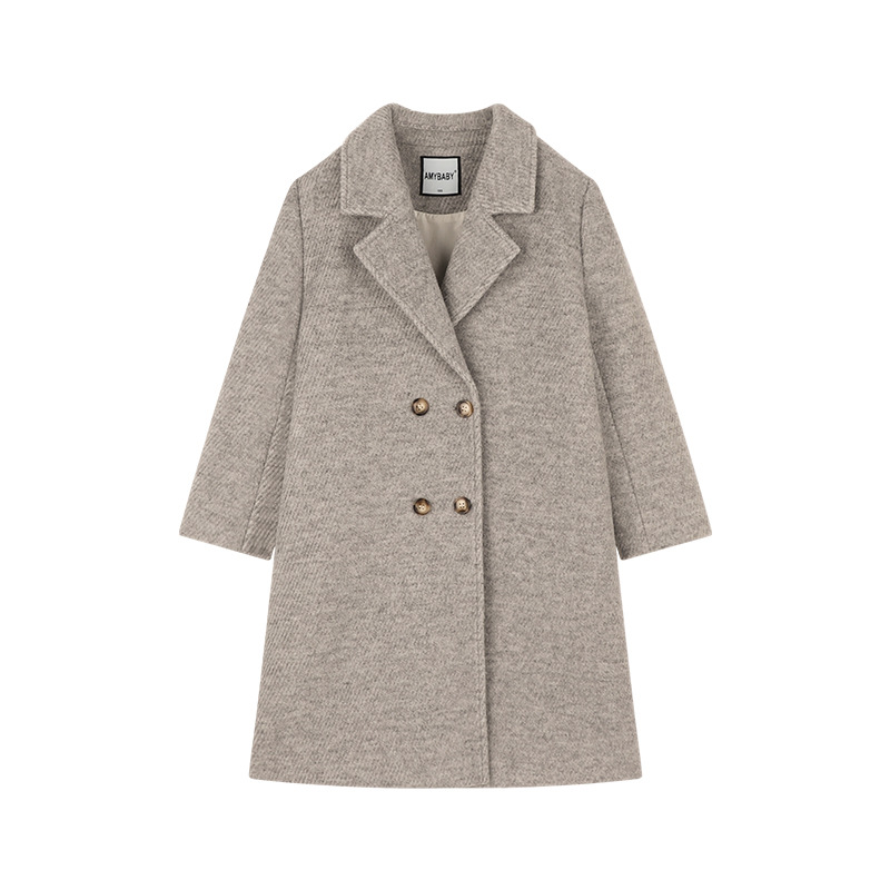 Amybaby Girl's Coat Winter 2024 새로운 클래식 그레이 더블 브레스트 옷깃 모직 코트스토어 가기