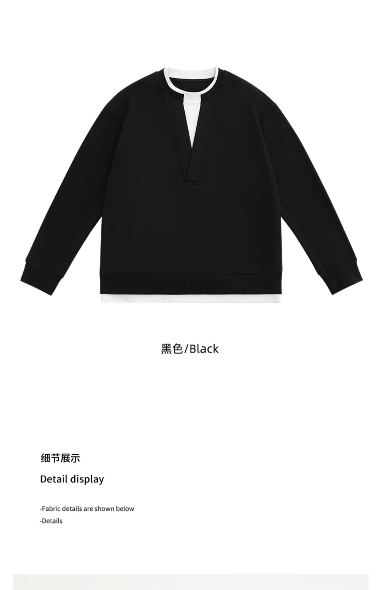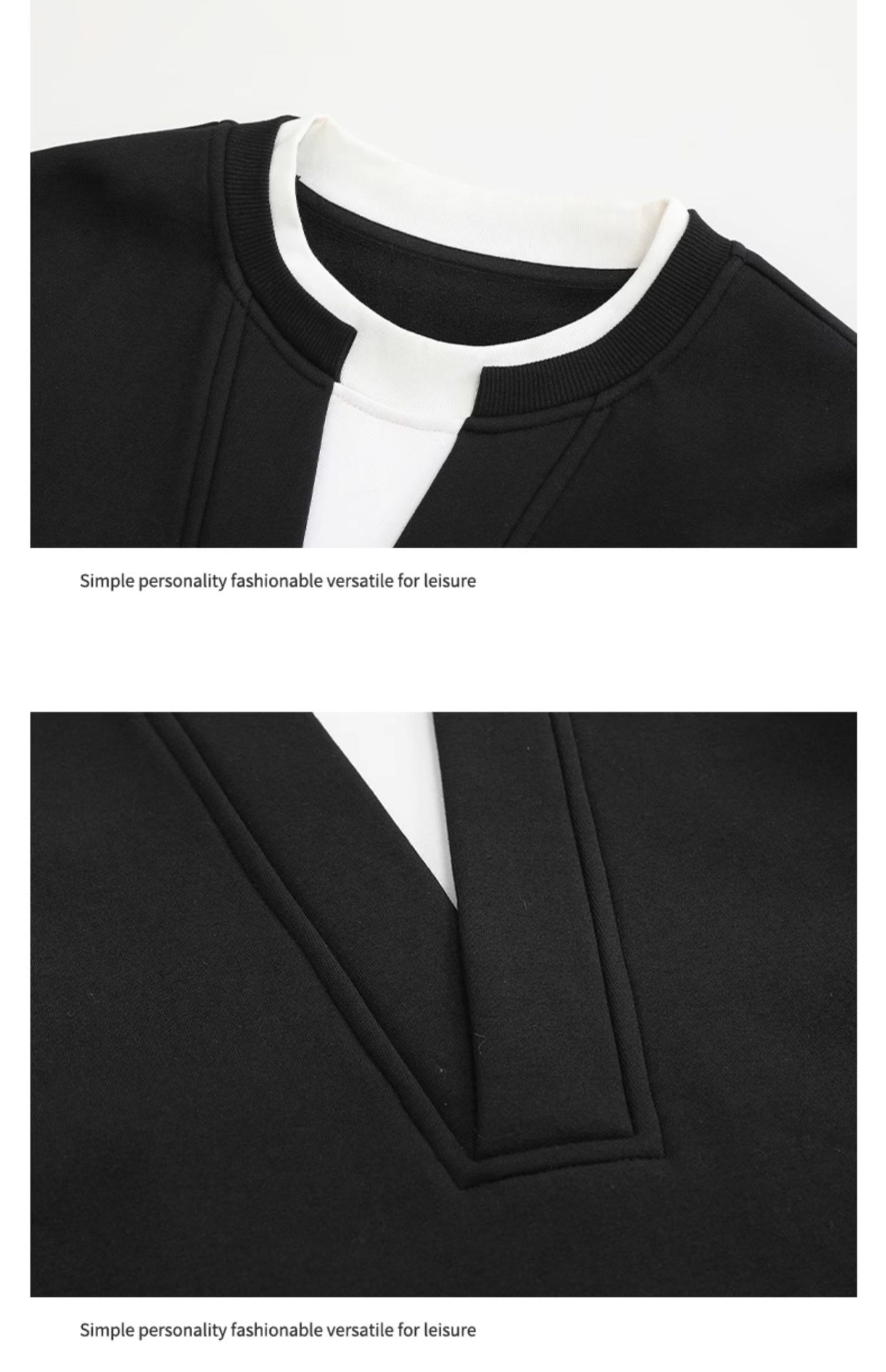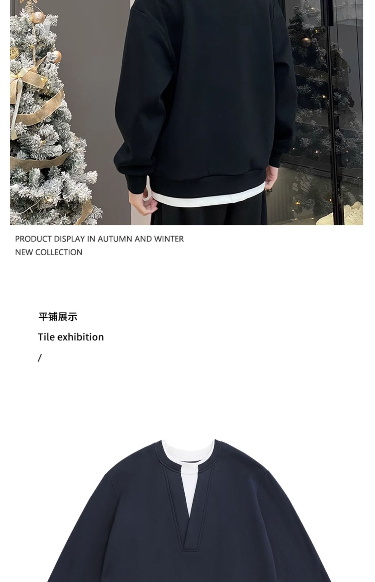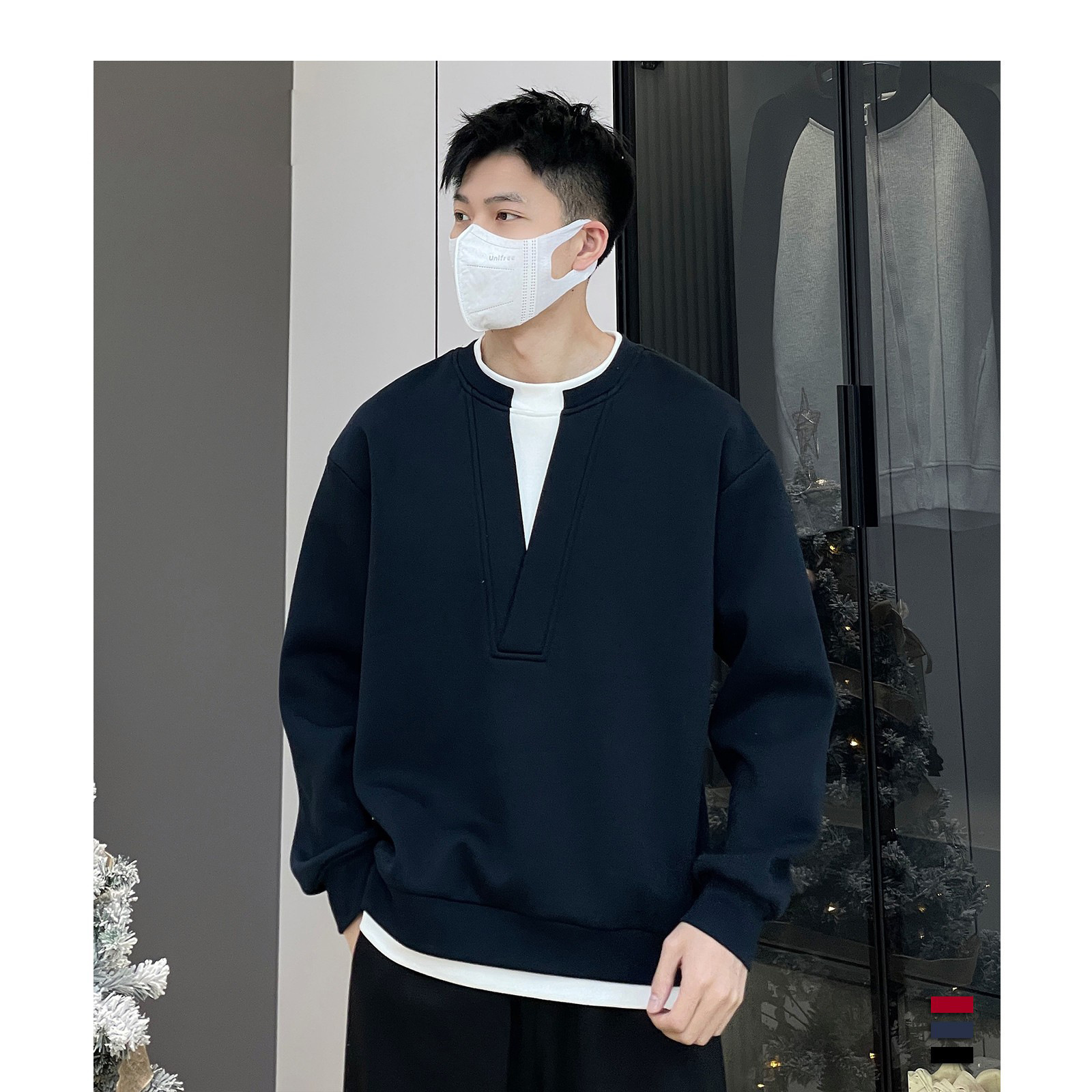 [후리스 안감 추가] 페이크 투피스 디자인 긴팔 브이넥 스웨트셔츠 남녀공용 캐주얼 루즈 심플