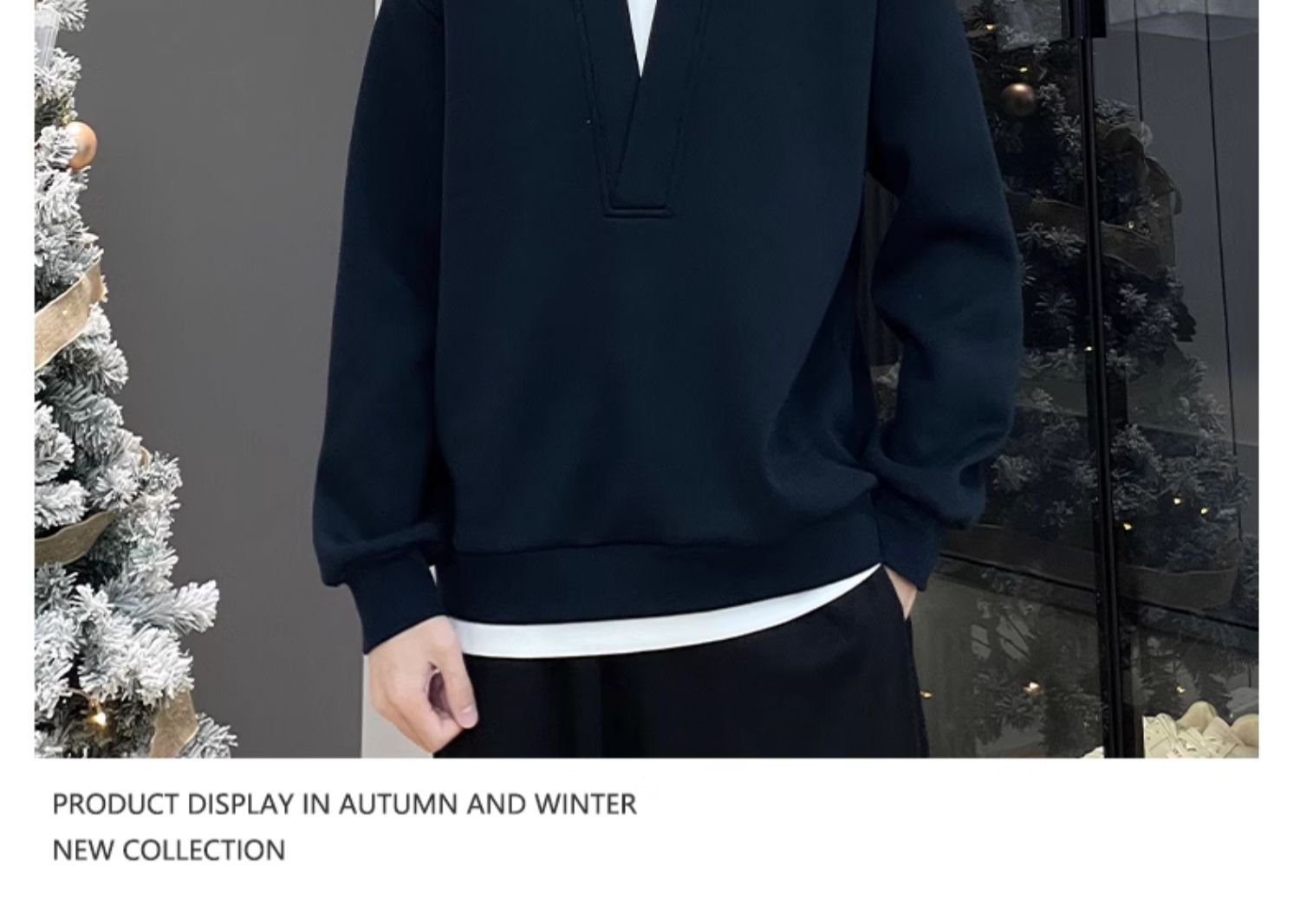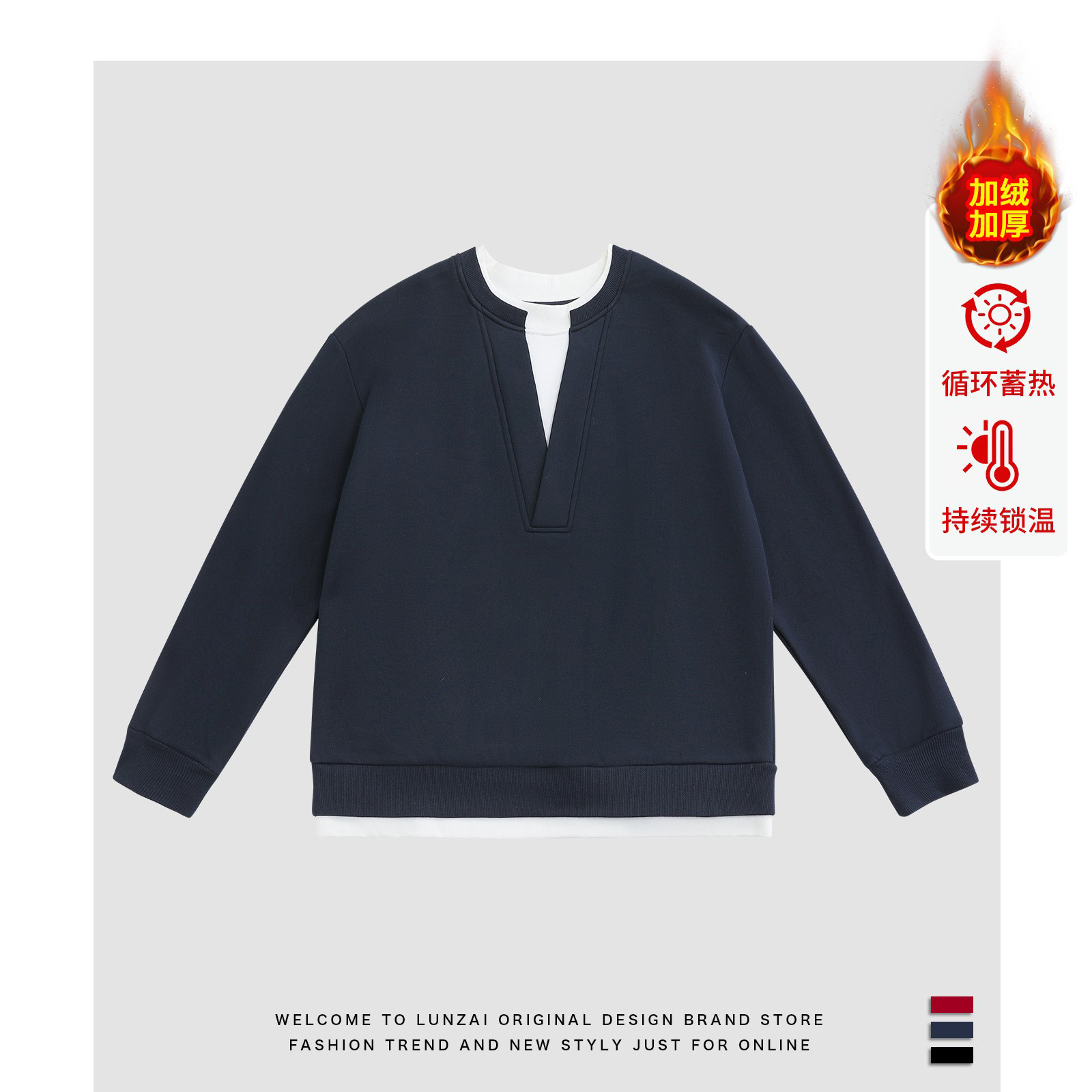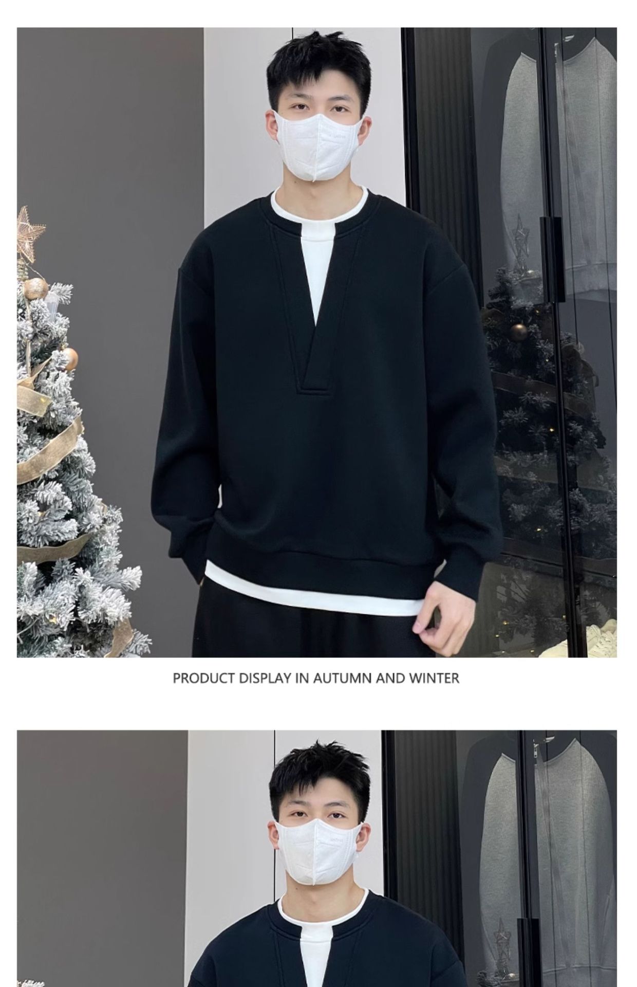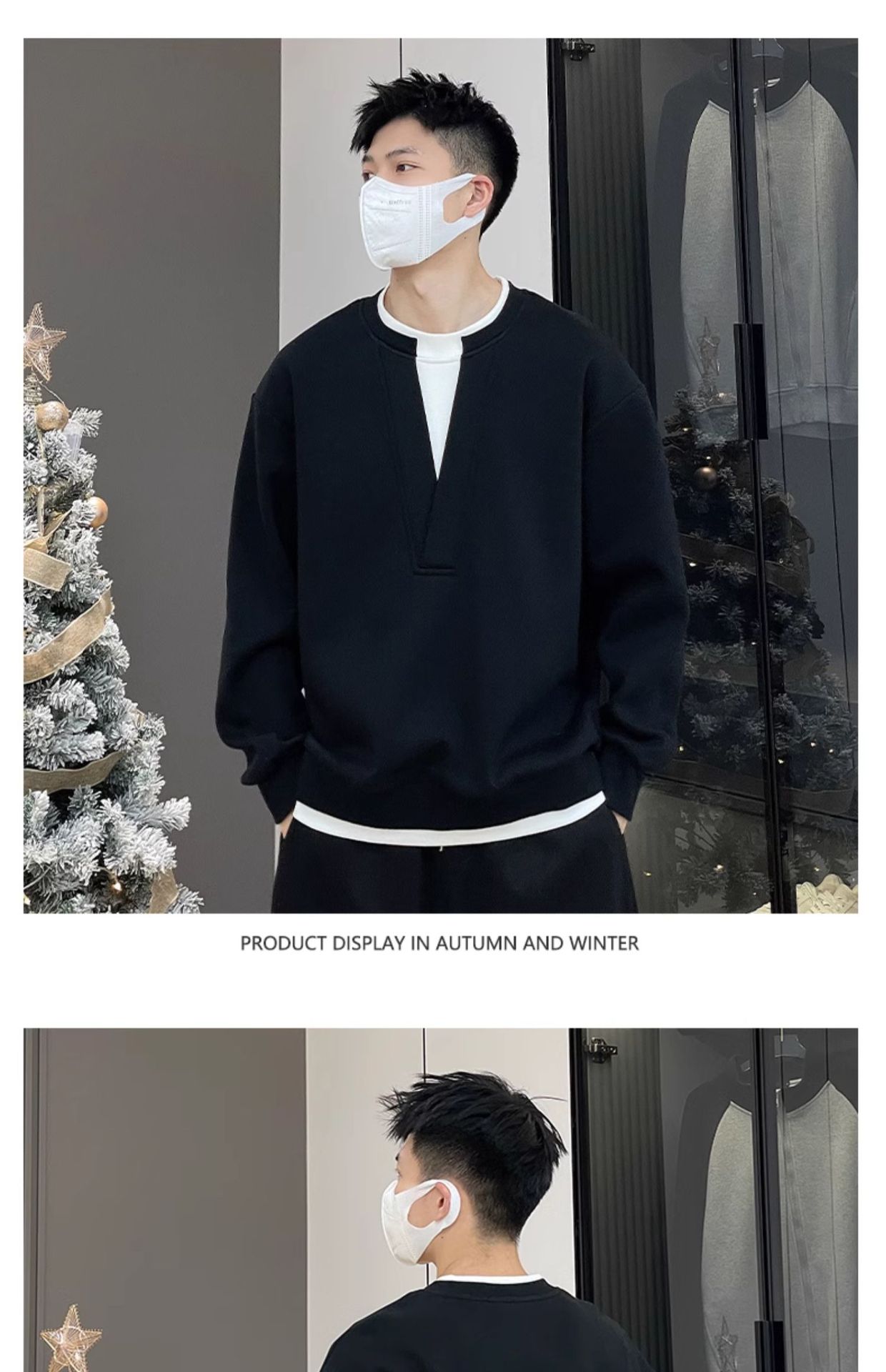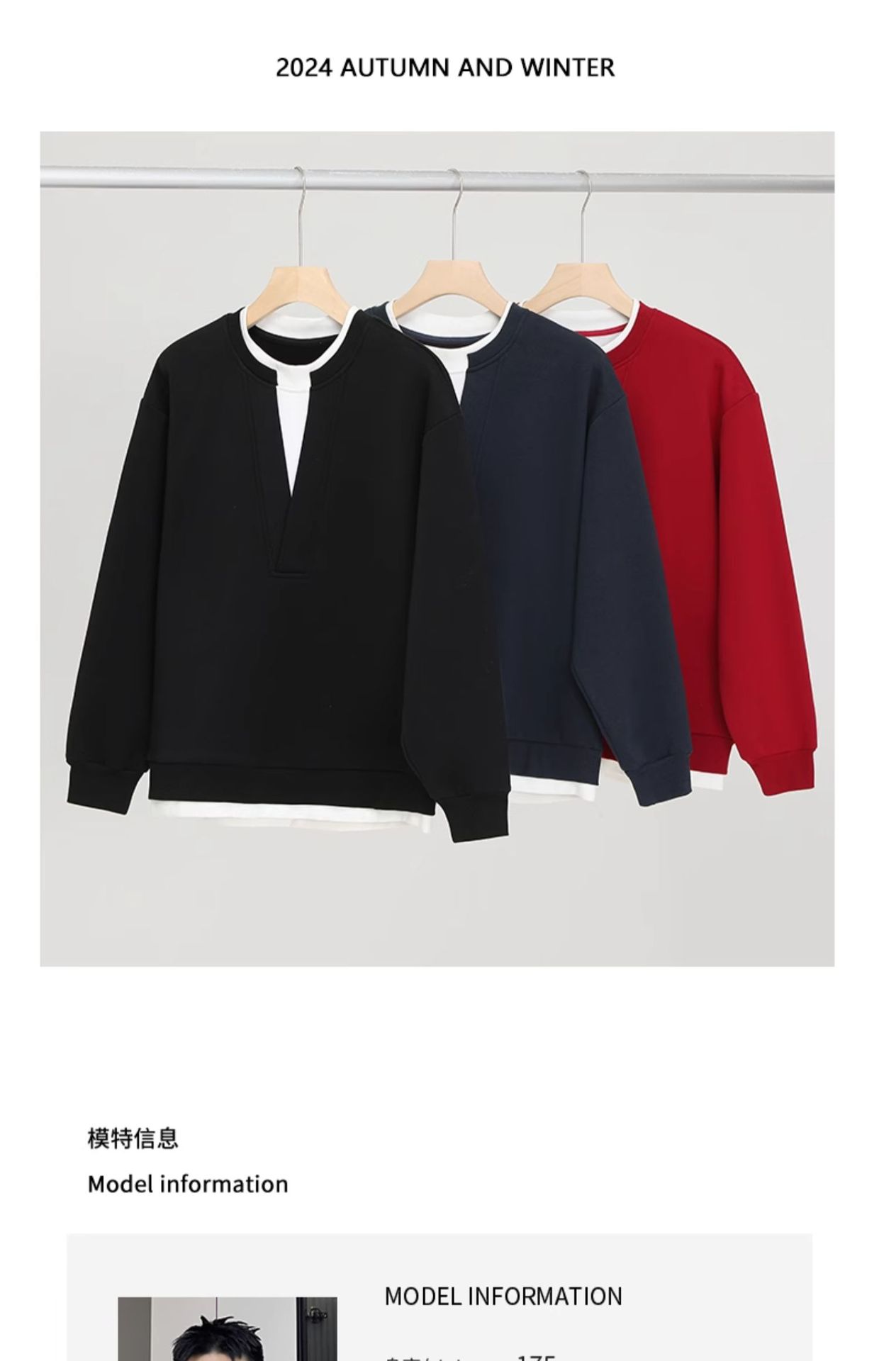 [후리스 안감 추가] 페이크 투피스 디자인 긴팔 브이넥 스웨트셔츠 남녀공용 캐주얼 루즈 심플
