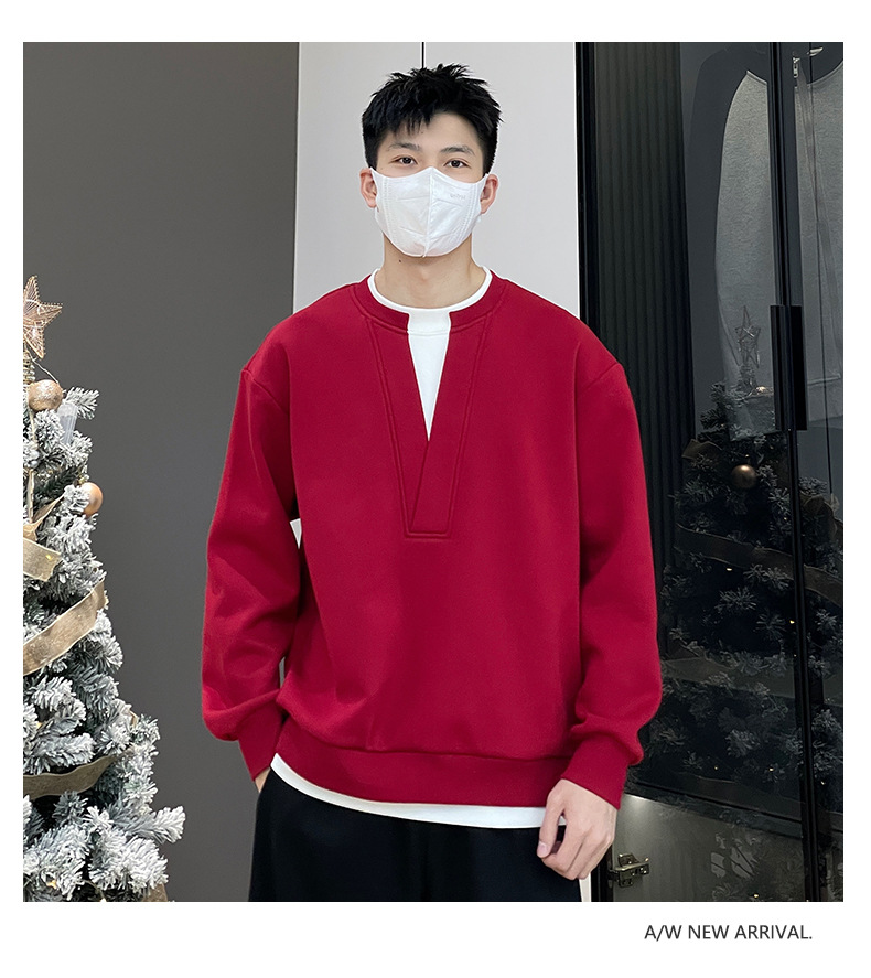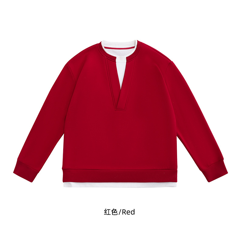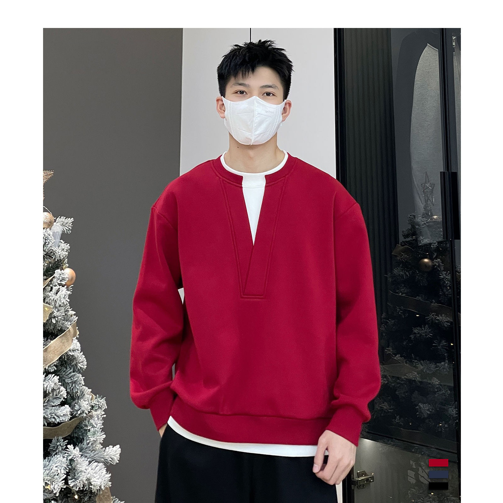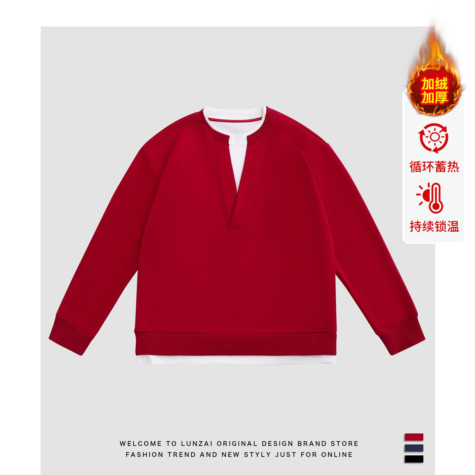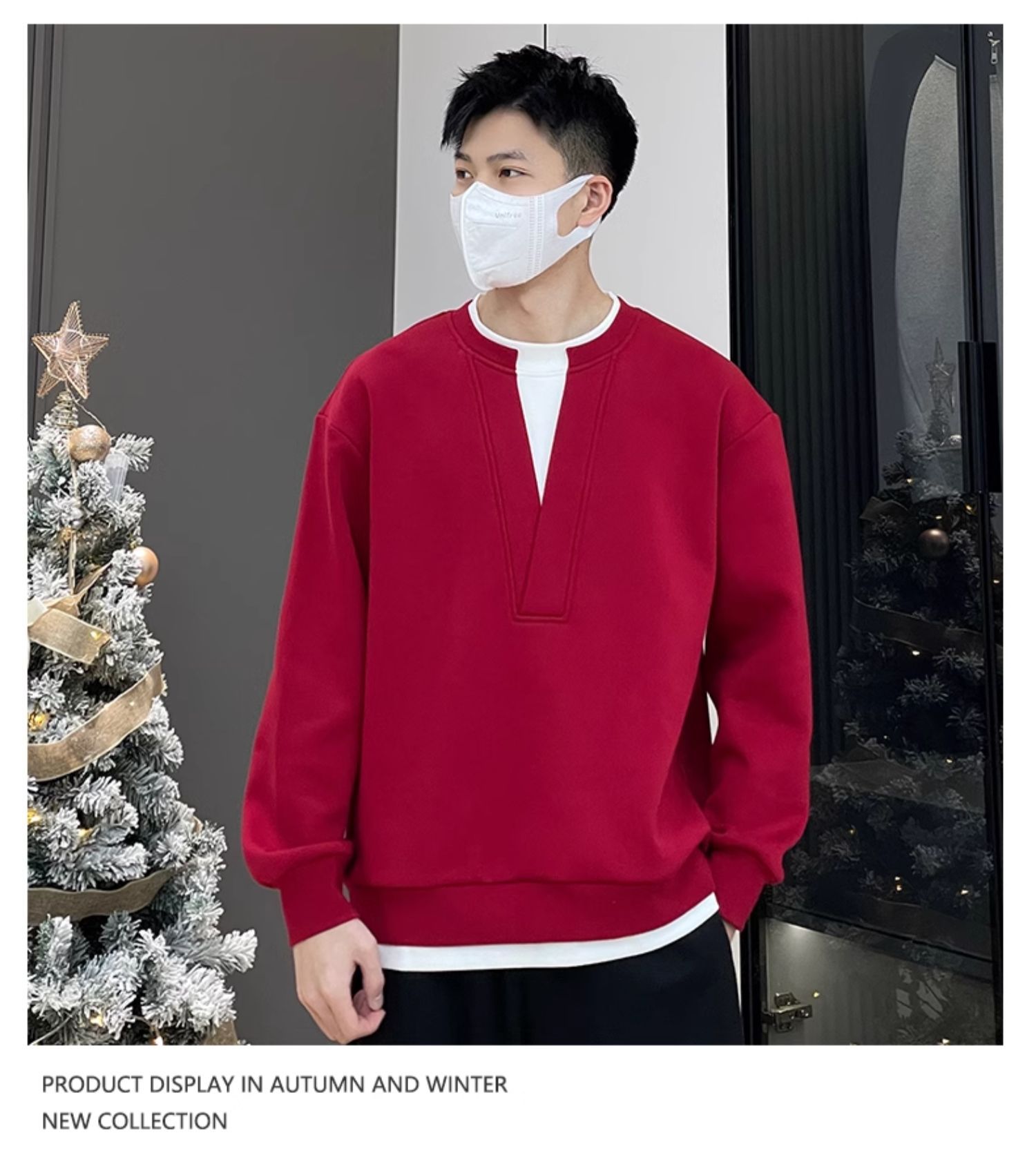 [후리스 안감 추가] 페이크 투피스 디자인 긴팔 브이넥 스웨트셔츠 남녀공용 캐주얼 루즈 심플