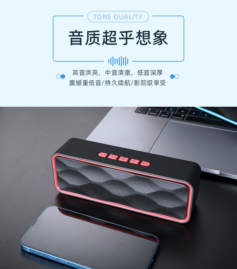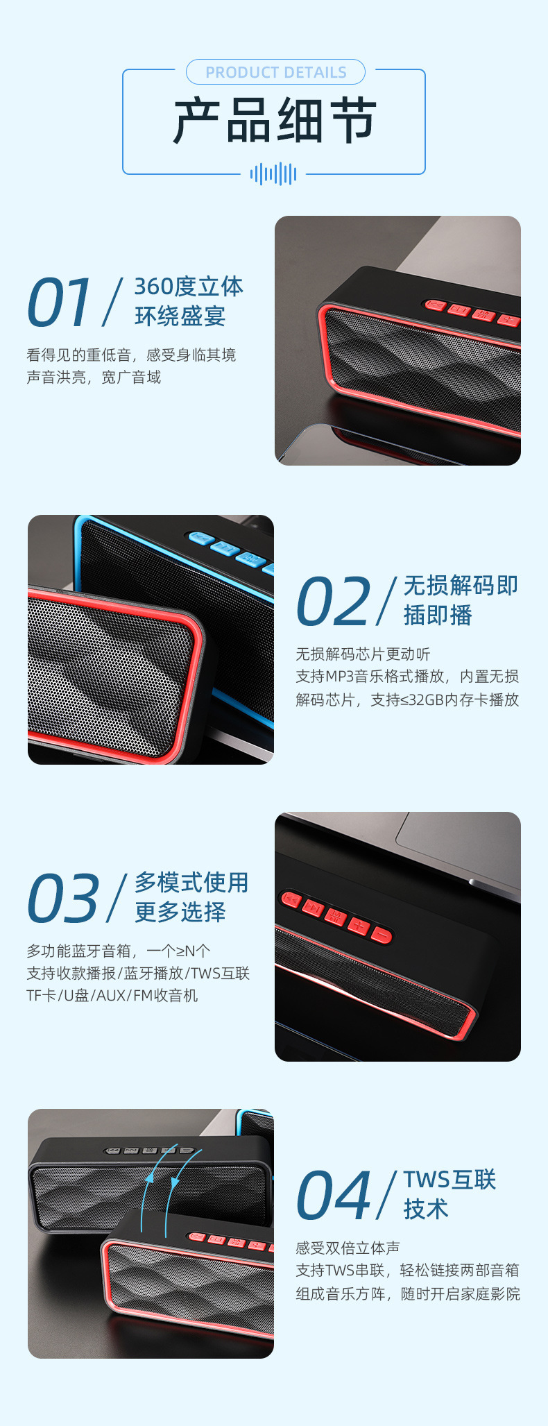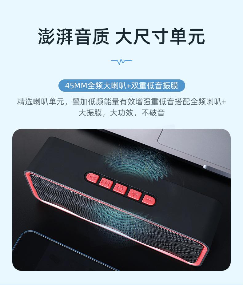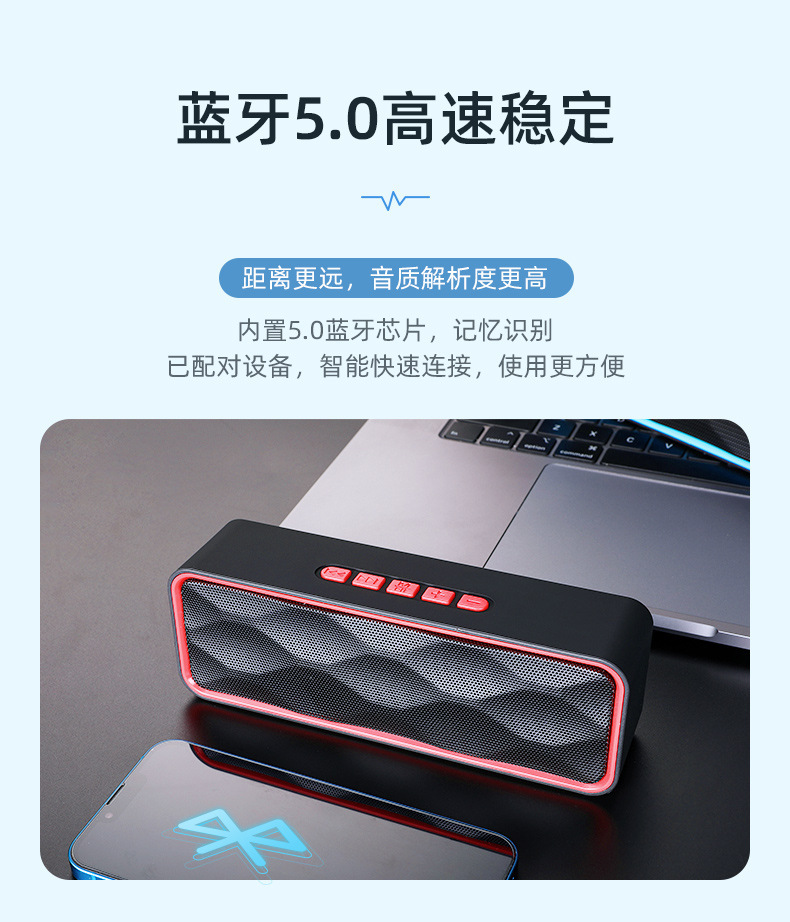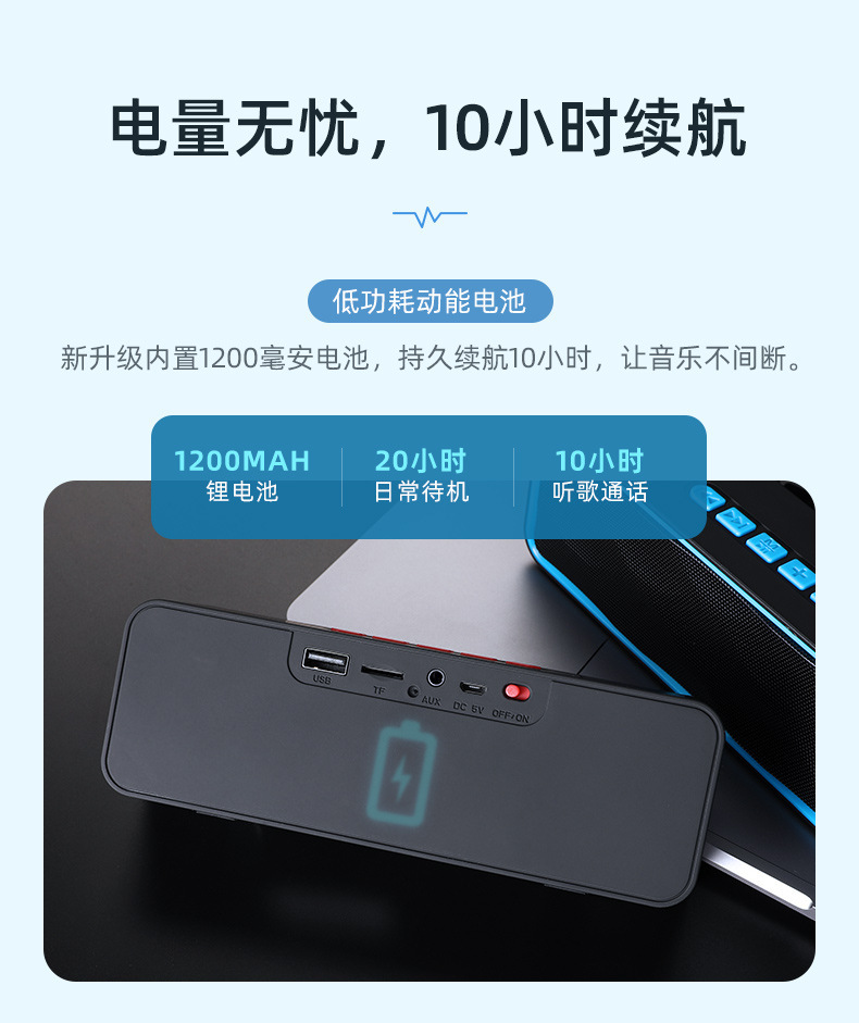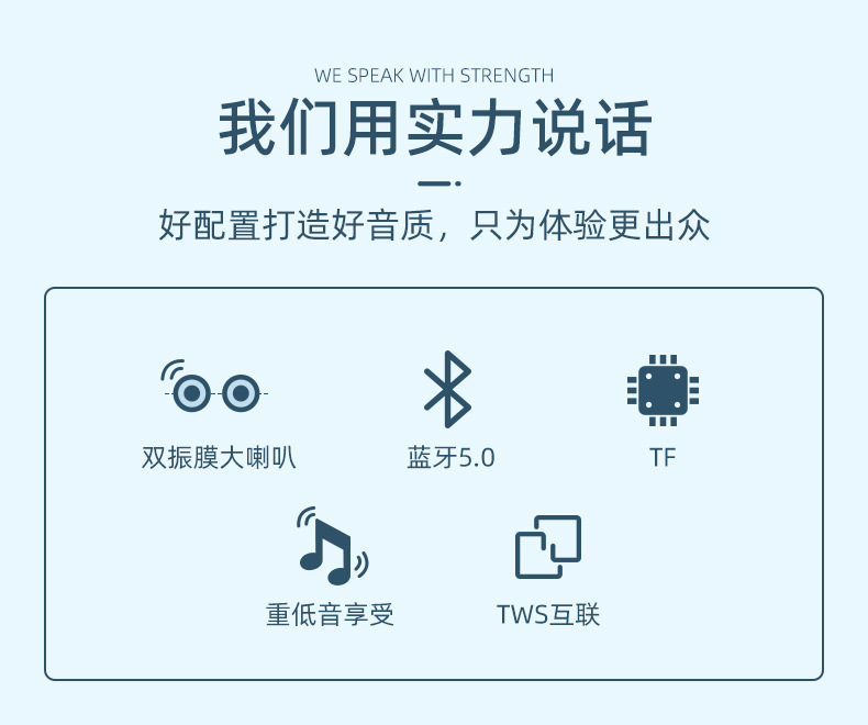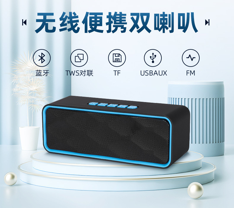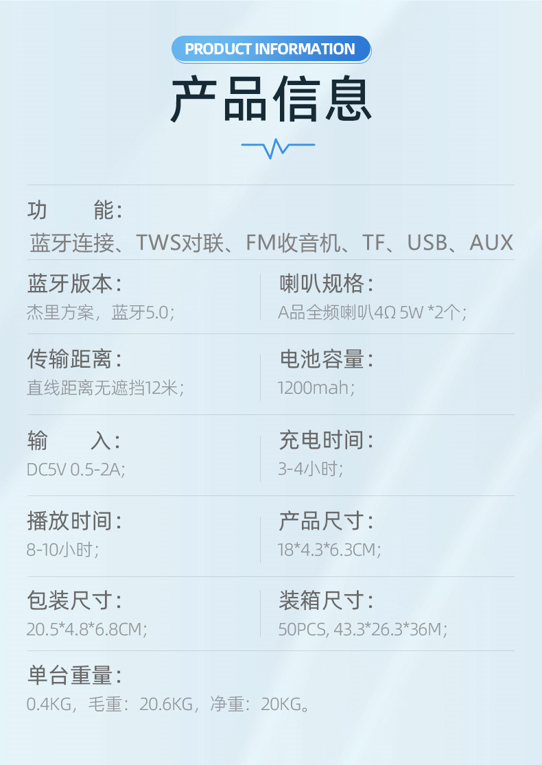 功 能:支持蓝牙连接、免提通话、TWS对联、TF卡、USB、FM收音、音频输入;