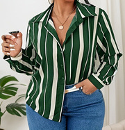 유럽과 미국의 플러스 사이즈 여자 2025 봄 새로운 V 넥 버튼 줄무늬 셔츠 긴 소매 블라우스