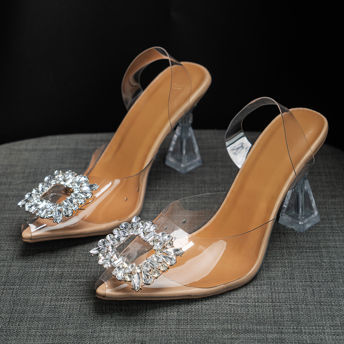 하이힐 샌들 여성 2025 여름 새로운 PVC 플러스 사이즈 라인스톤 스퀘어 버클 뾰족한 숙녀 힐 투명스토어 가기