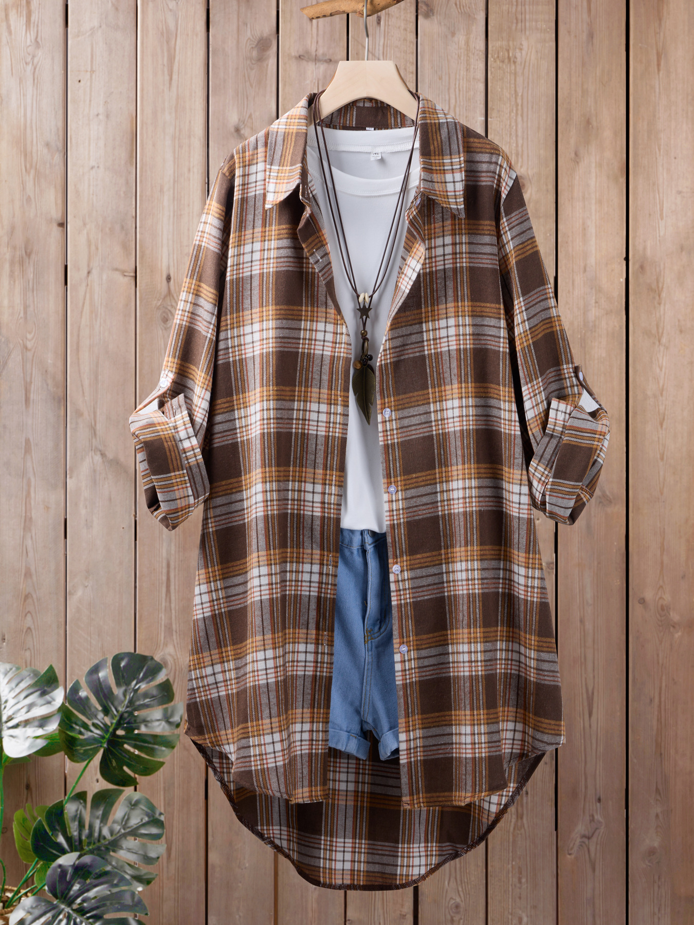 유럽과 미국의 플러스 사이즈 여자 2025 봄 긴 느슨한 탑 코트 여성용 셔츠 다크 브라운 격자 무늬 셔츠스토어 가기