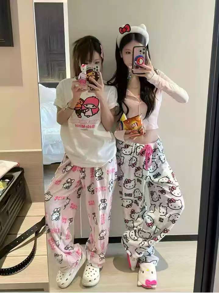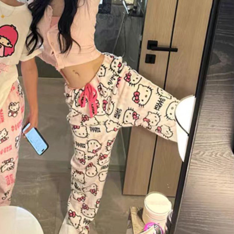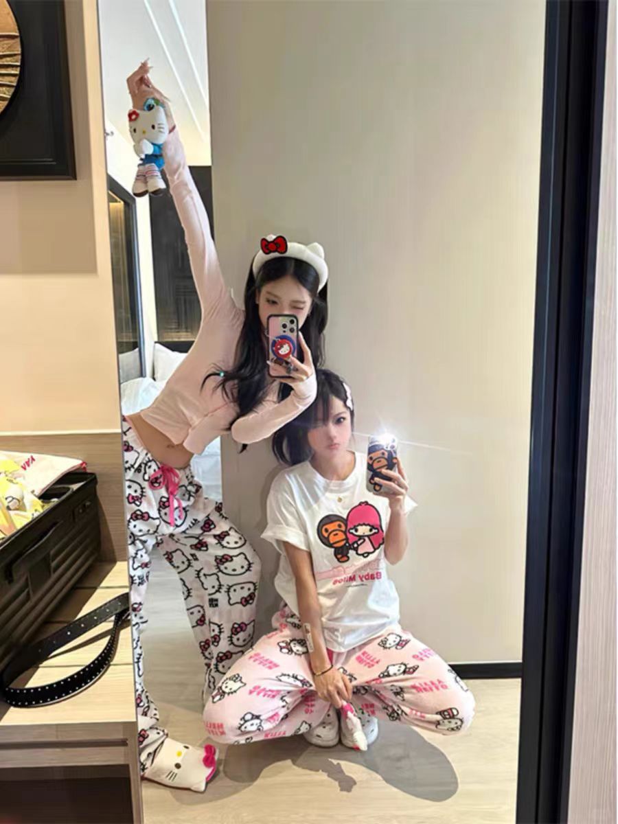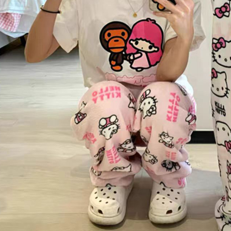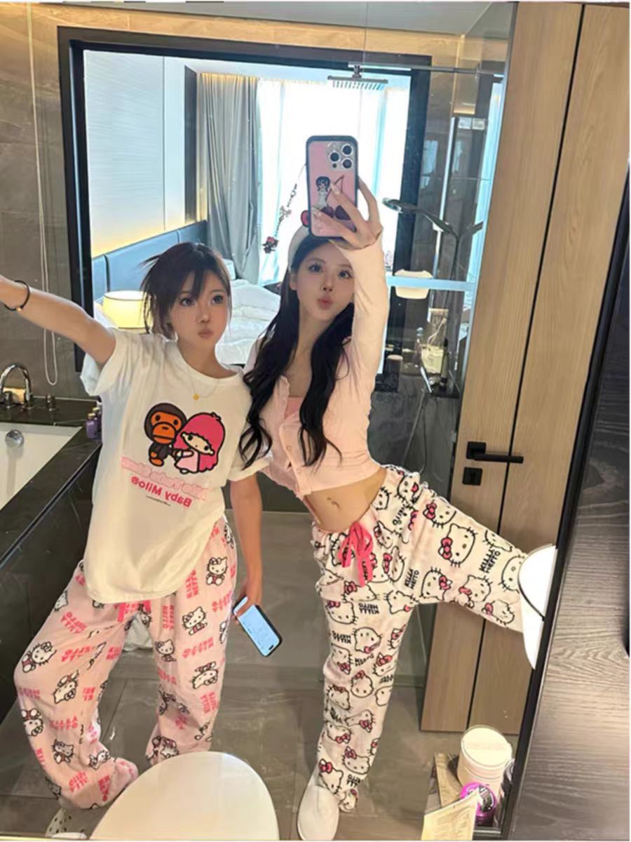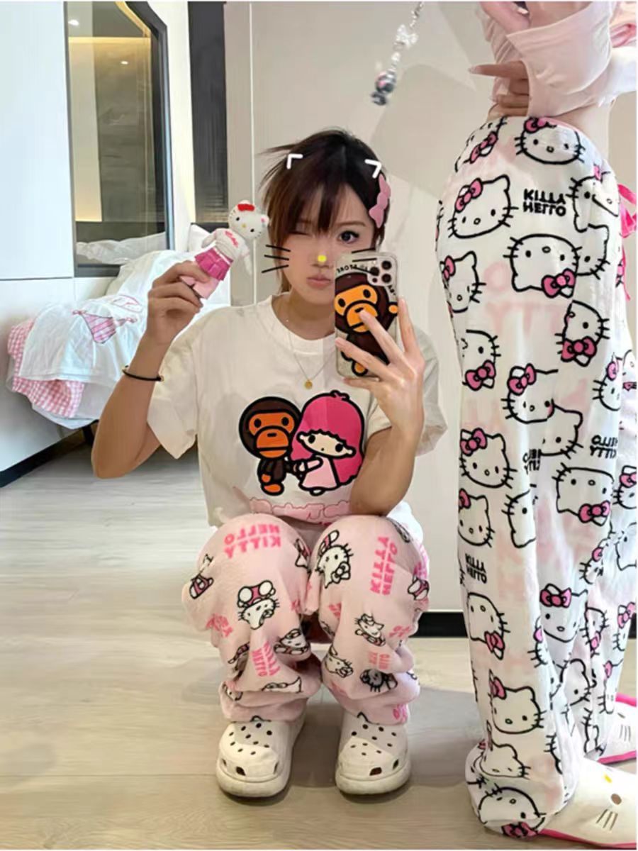 플러스 대형 새로운 도착 잠옷 세트 여성의 느슨한 여름 반팔 최고 만화 귀여운 캐주얼 긴 바지스토어 가기
