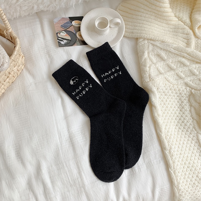 양말 여성용 호주 벨벳 기모 두꺼운 따뜻한 미드 튜브 양말 수납 부드러운 왁스 홈 문 양말 귀여운 강아지 수면 양말