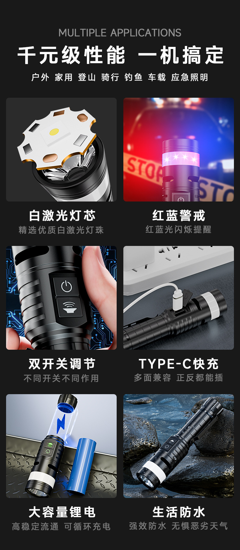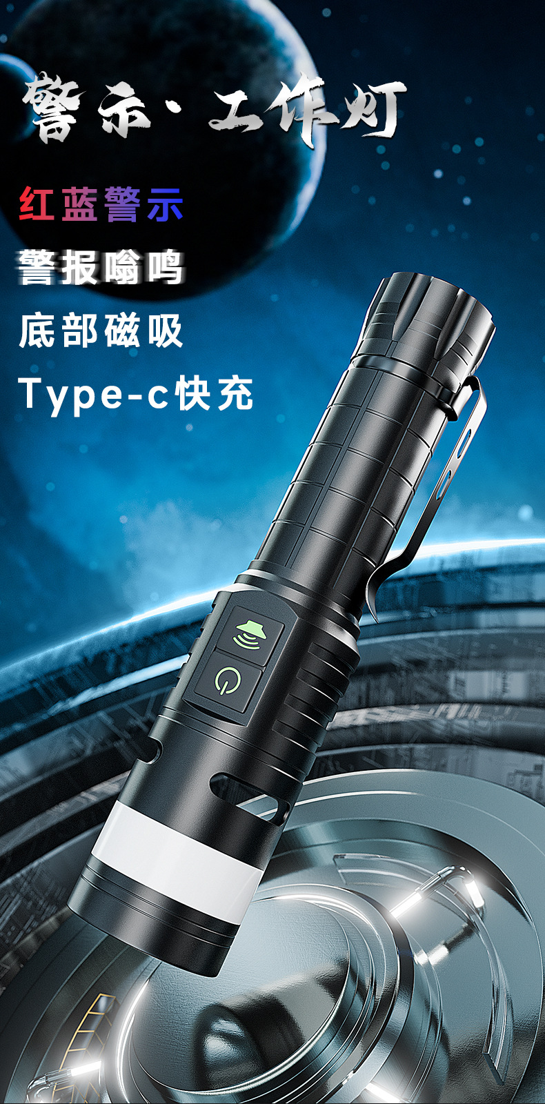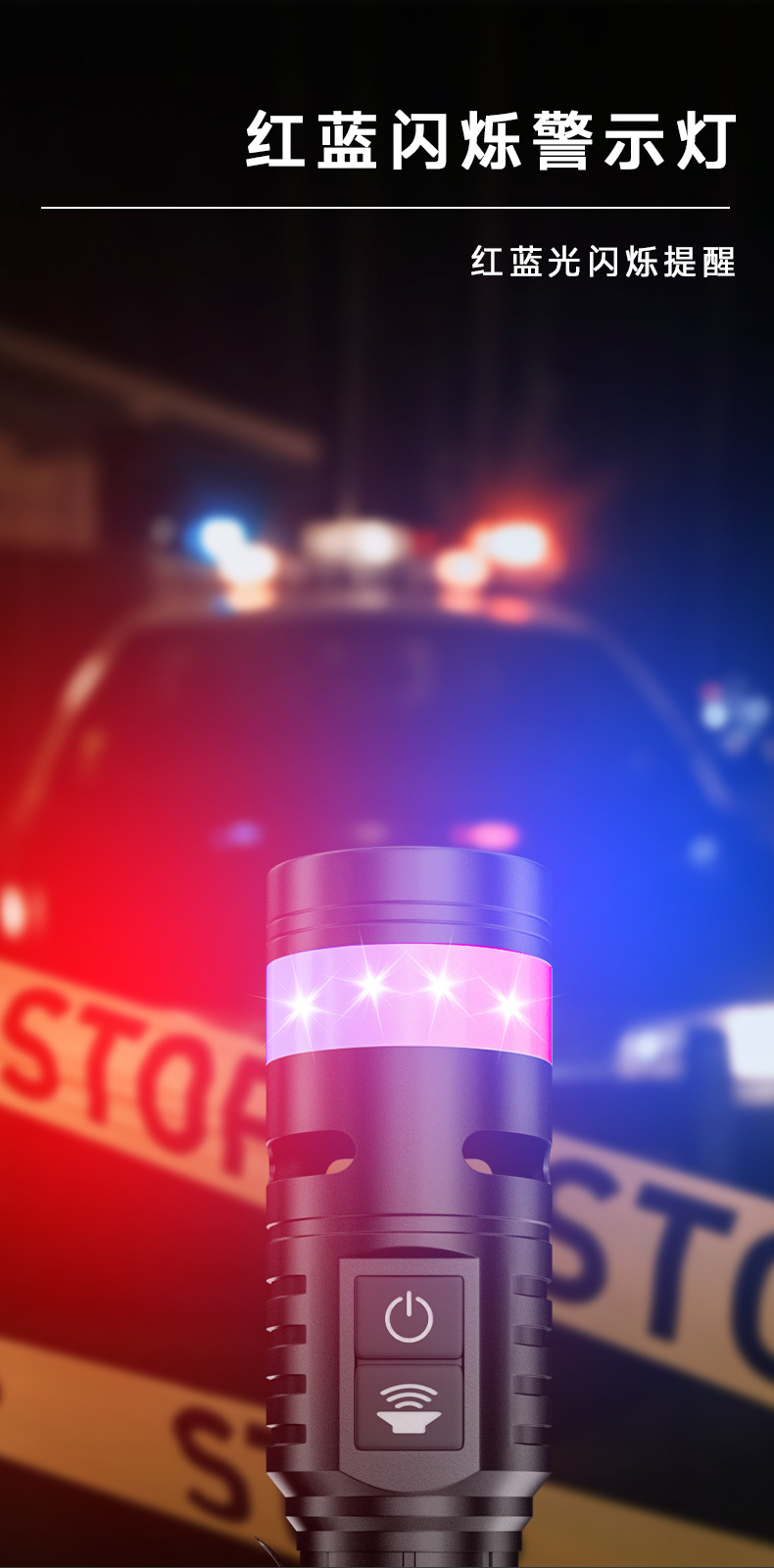 Ruibao 강한 빛 버스트 손전등 다기능 측면 충전식 빨간색과 파란색 경고등 작업 조명 야외 손전등