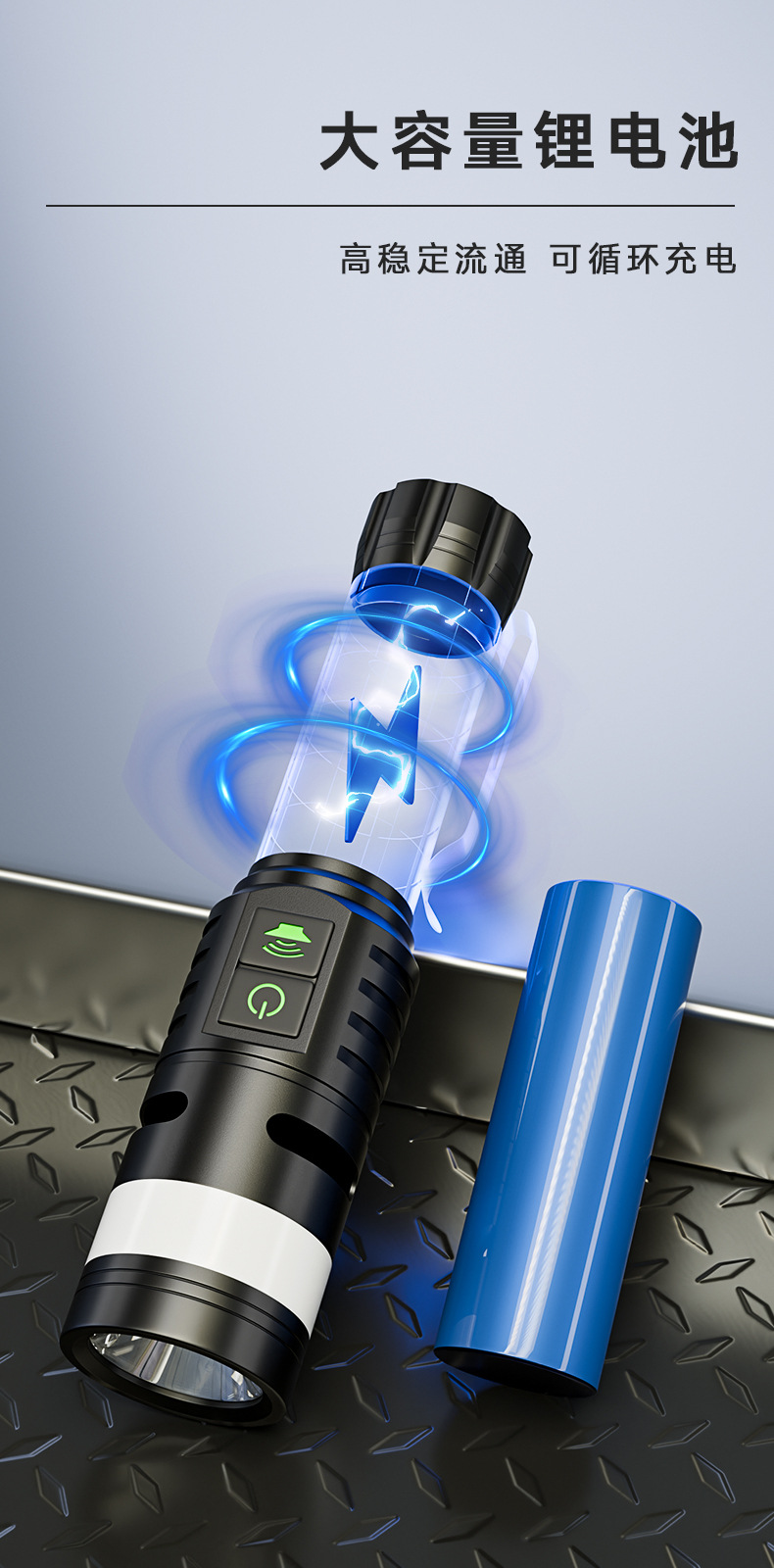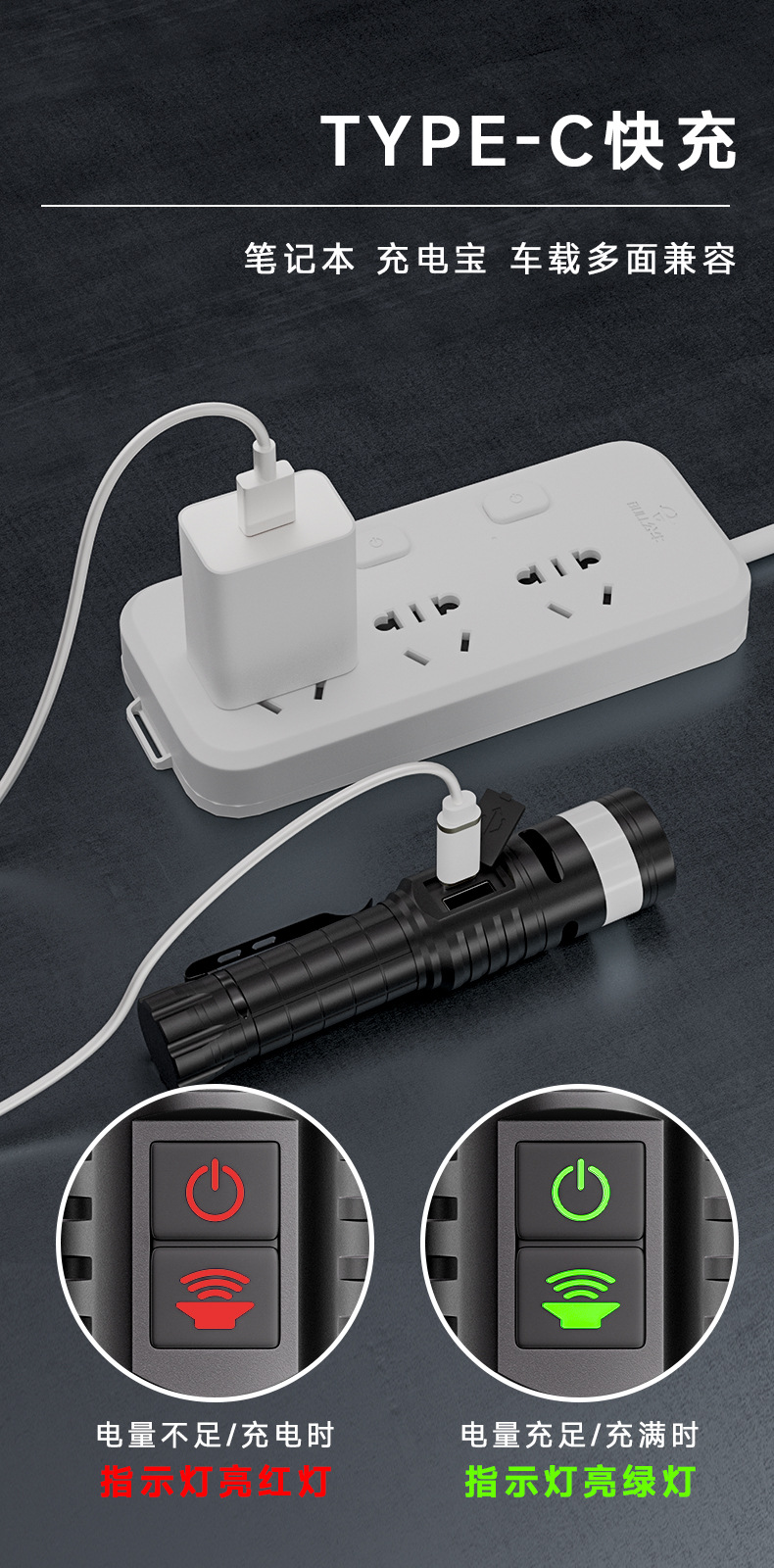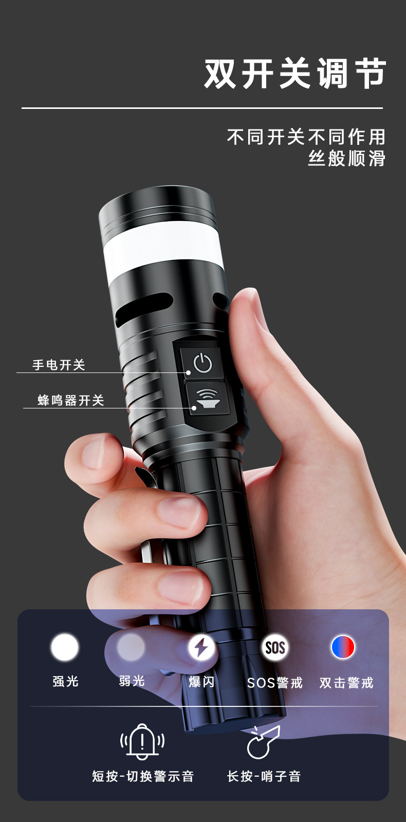 Ruibao 강한 빛 버스트 손전등 다기능 측면 충전식 빨간색과 파란색 경고등 작업 조명 야외 손전등