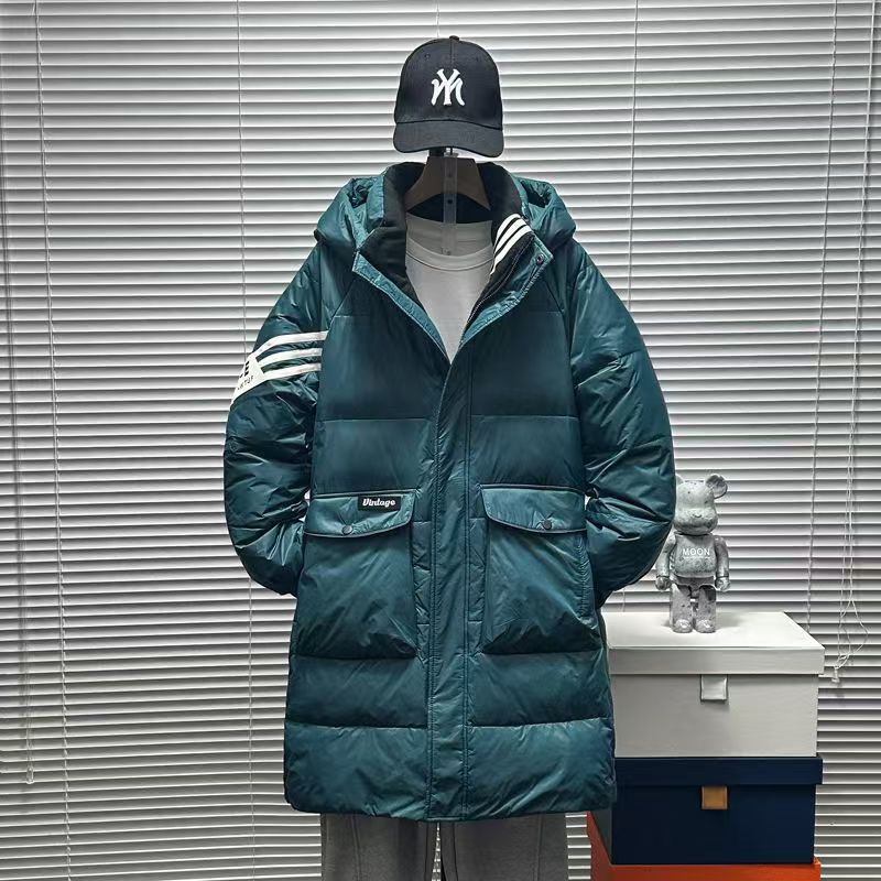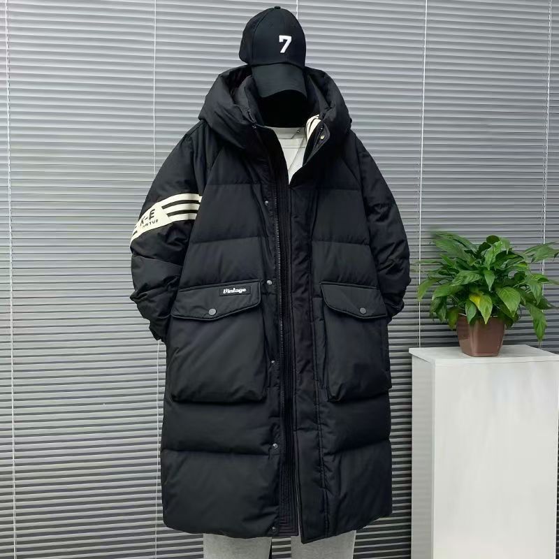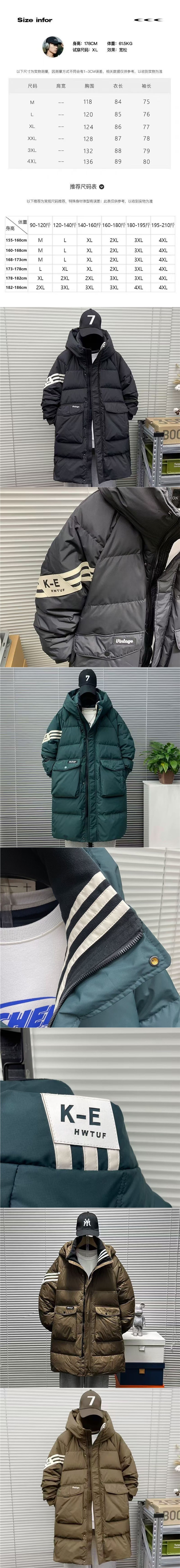 다운 재킷 남자의 중간 길이 2024 겨울 새로운 십대 패션 브랜드 스트라이프 화이트 덕 다운 루즈 두꺼운 재킷스토어 가기