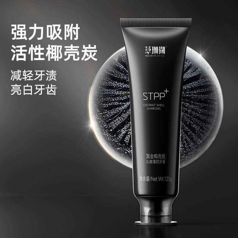 산호 검은 금 코코넛 껍질 숯 치약 밝은 흰색 신선한 호흡으로 얼룩을 제거합니다. 노란색 치아스토어 가기