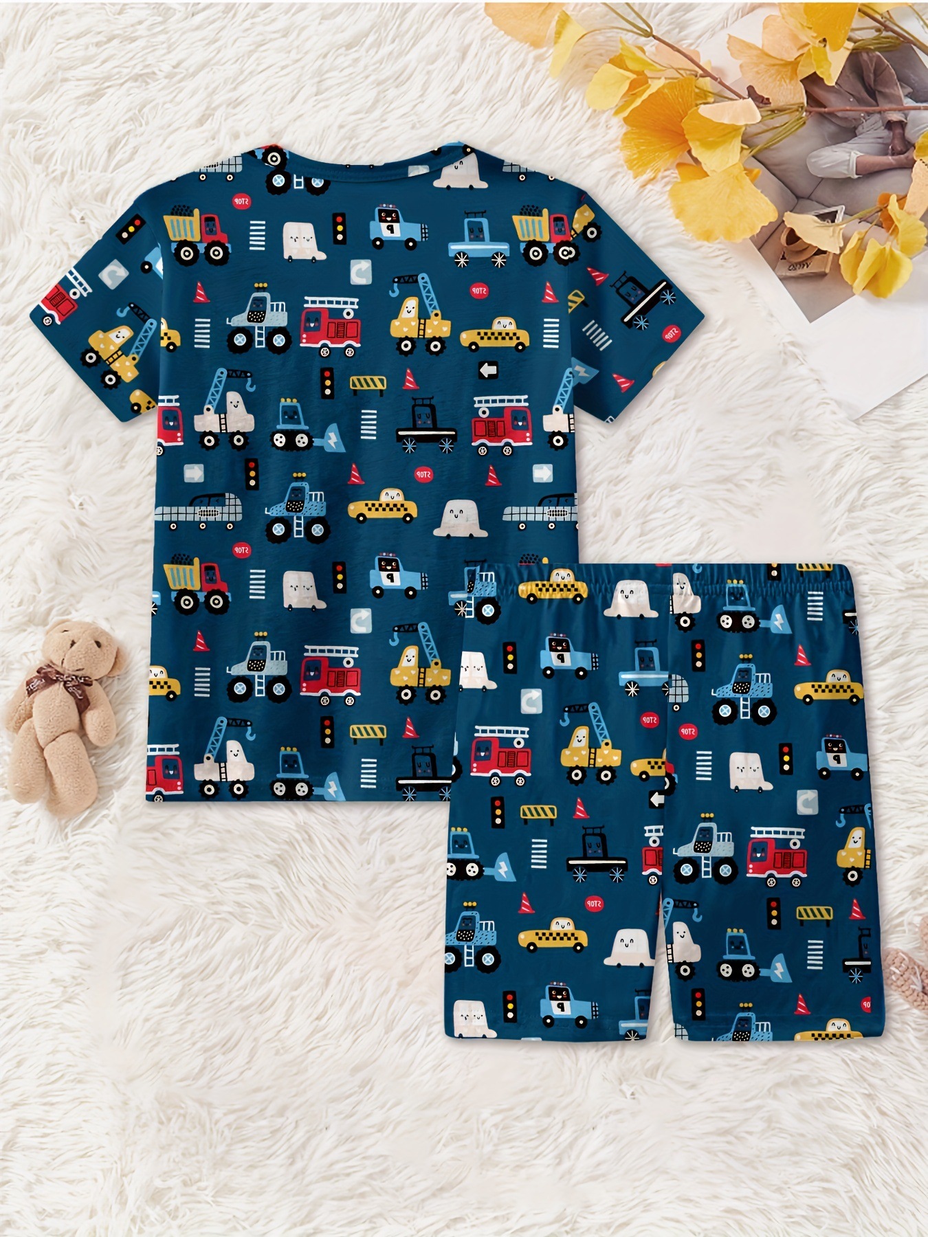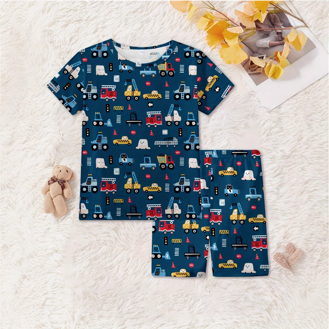 어린이 반팔 반바지 세트 대형 중소형 어린이 여름 아기 자동차 인쇄 속옷 소년 둥근 목 티셔츠 잠옷