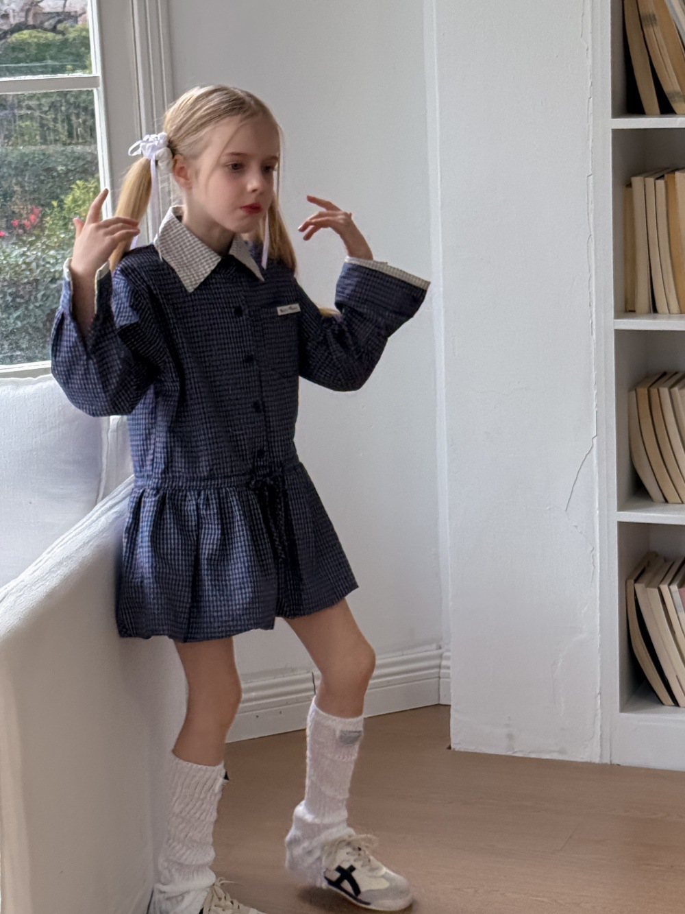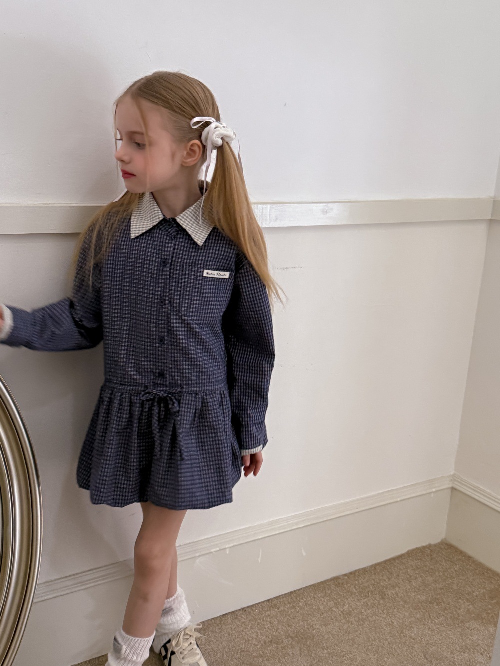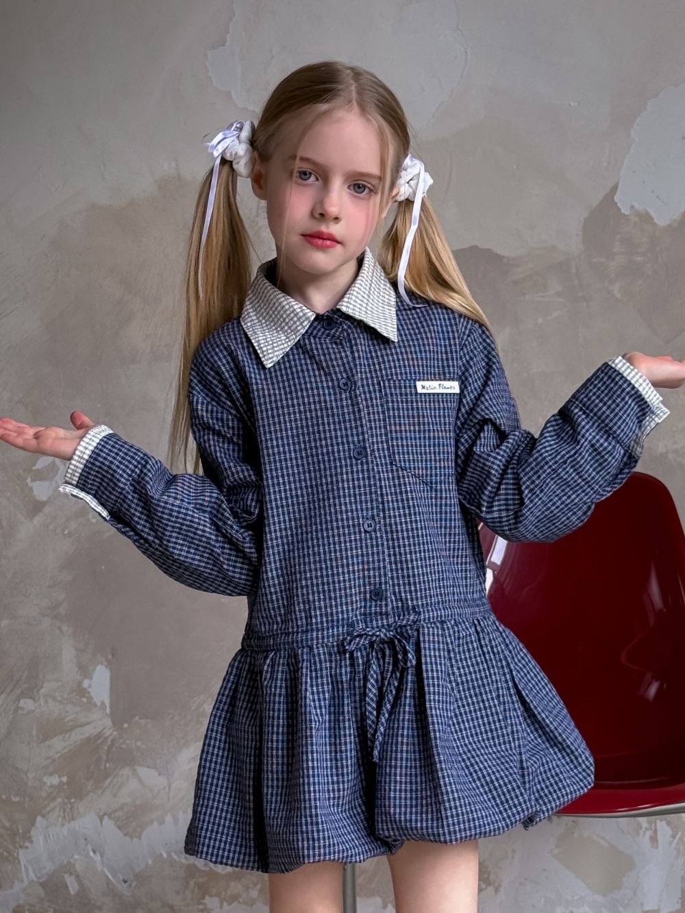 2025 여자 블루 격자 무늬 가을 새로운 한국어 버전 인형 칼라 긴 소매 드레스 어린이 복고풍 격자 무늬 셔츠 드레스