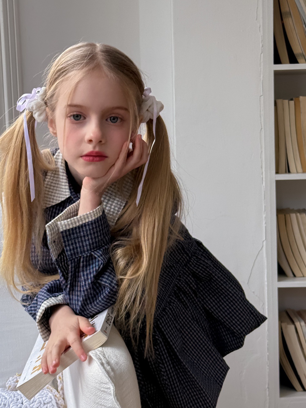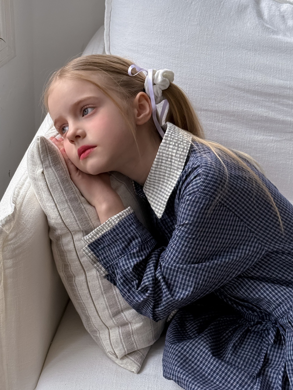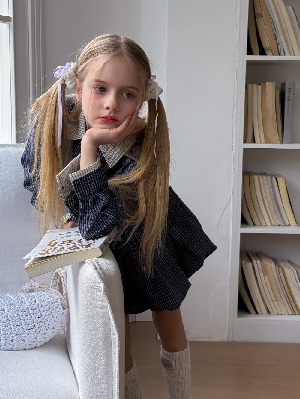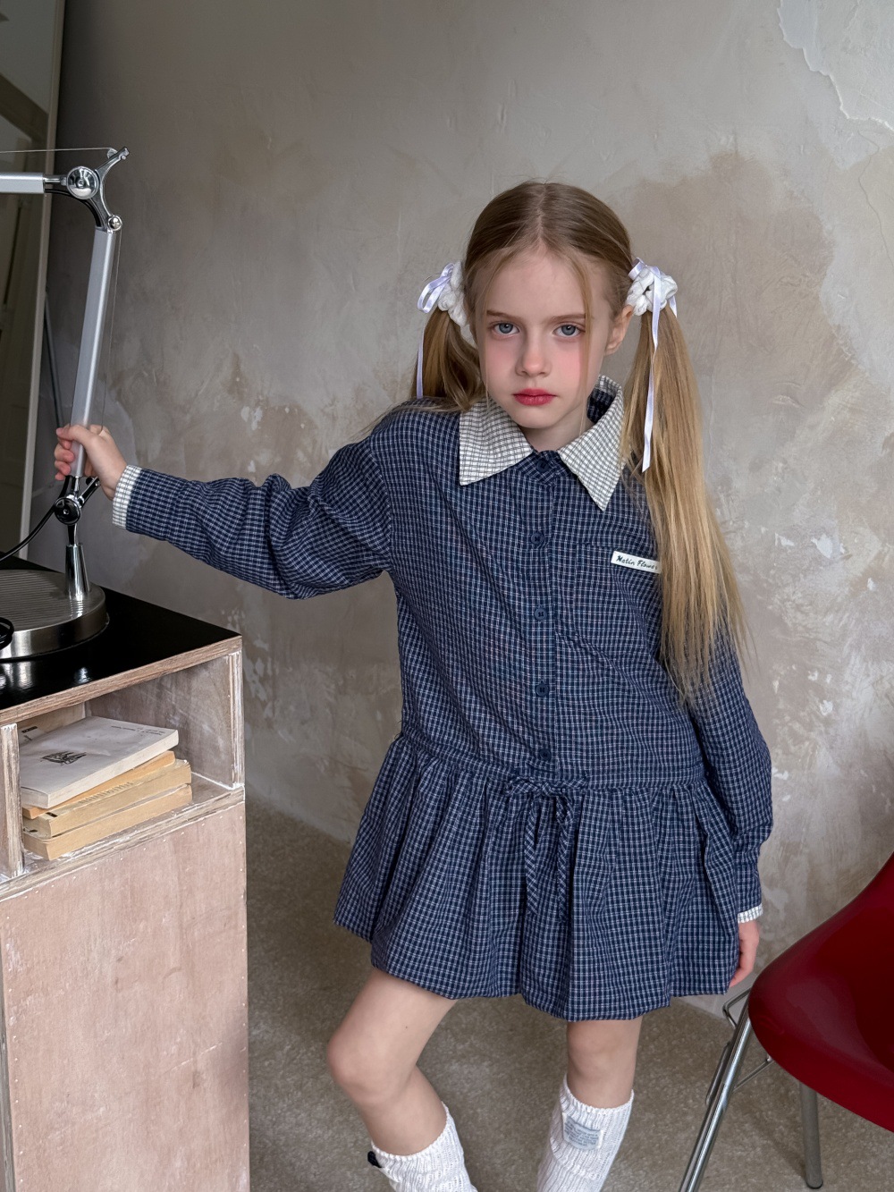 2025 여자 블루 격자 무늬 가을 새로운 한국어 버전 인형 칼라 긴 소매 드레스 어린이 복고풍 격자 무늬 셔츠 드레스