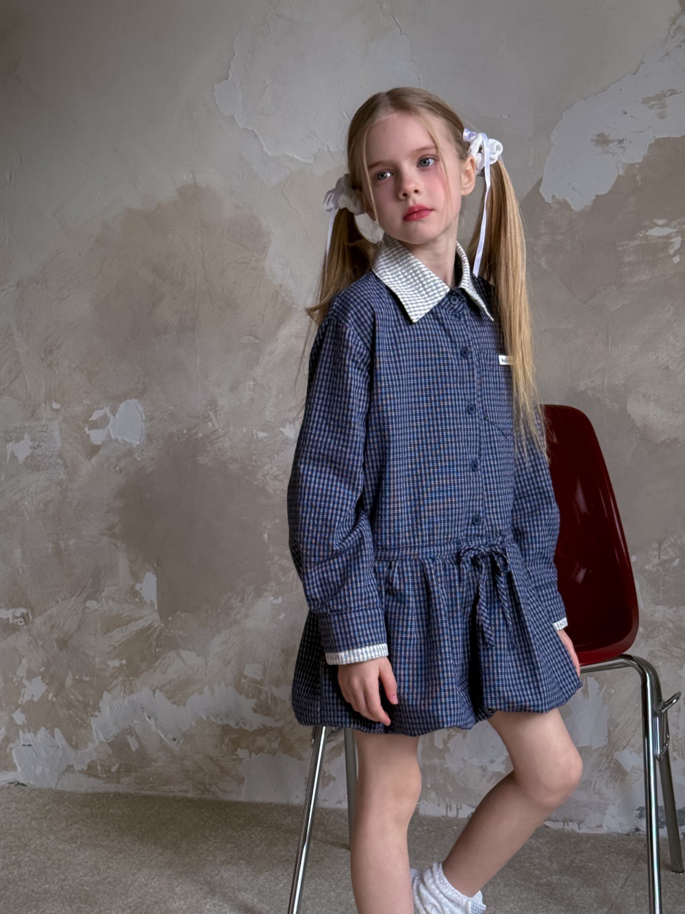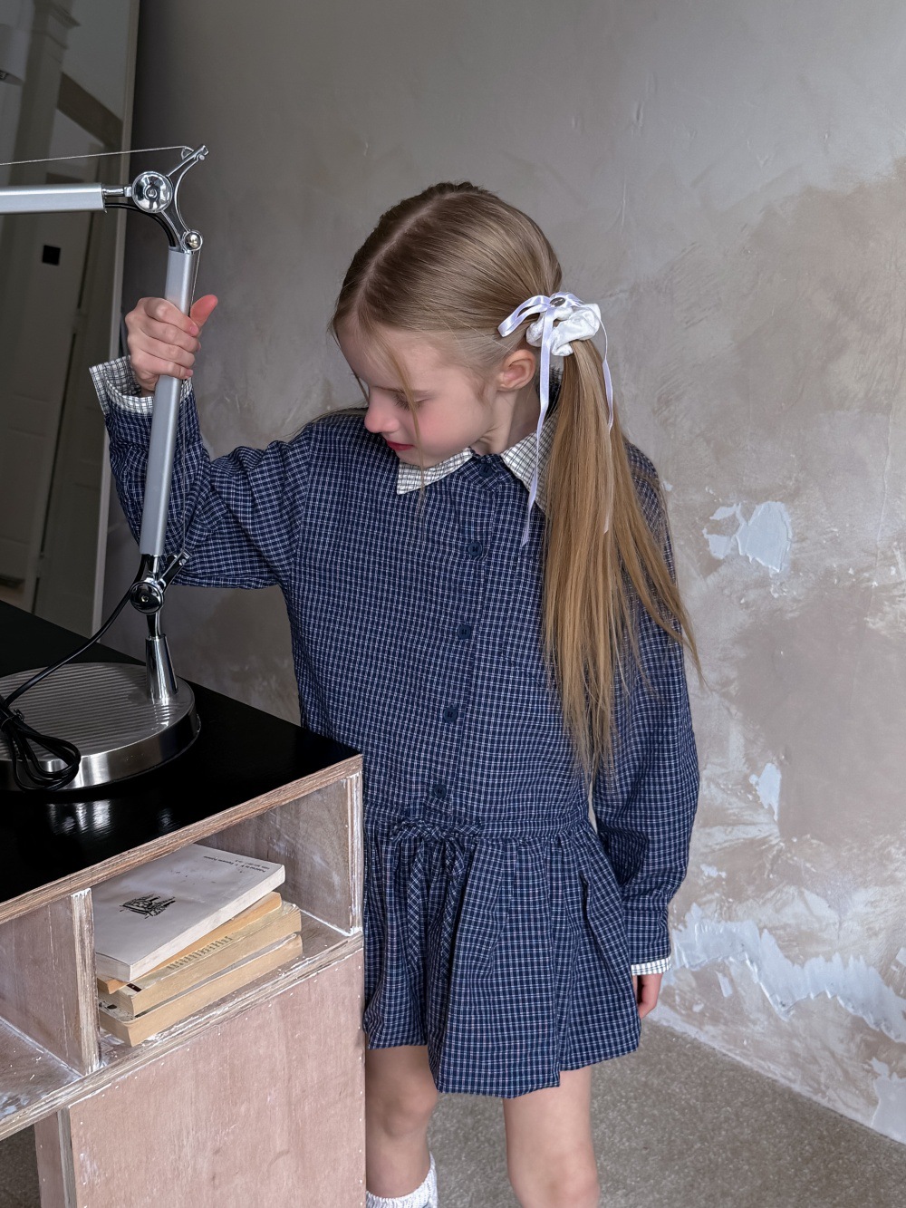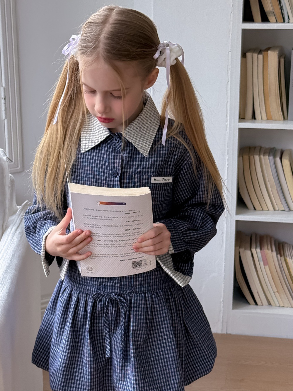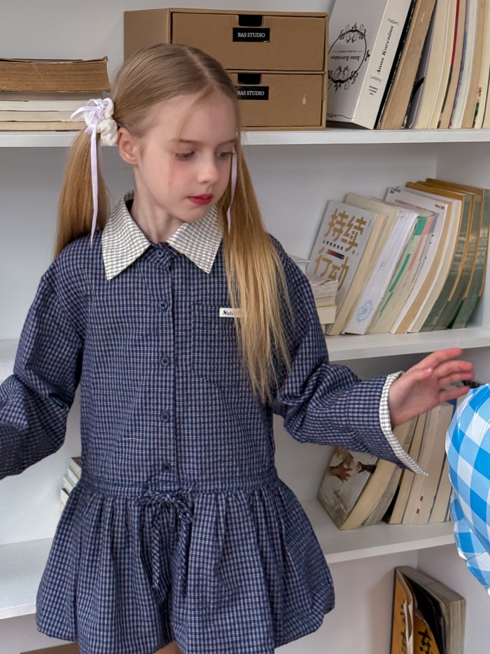 2025 여자 블루 격자 무늬 가을 새로운 한국어 버전 인형 칼라 긴 소매 드레스 어린이 복고풍 격자 무늬 셔츠 드레스스토어 가기