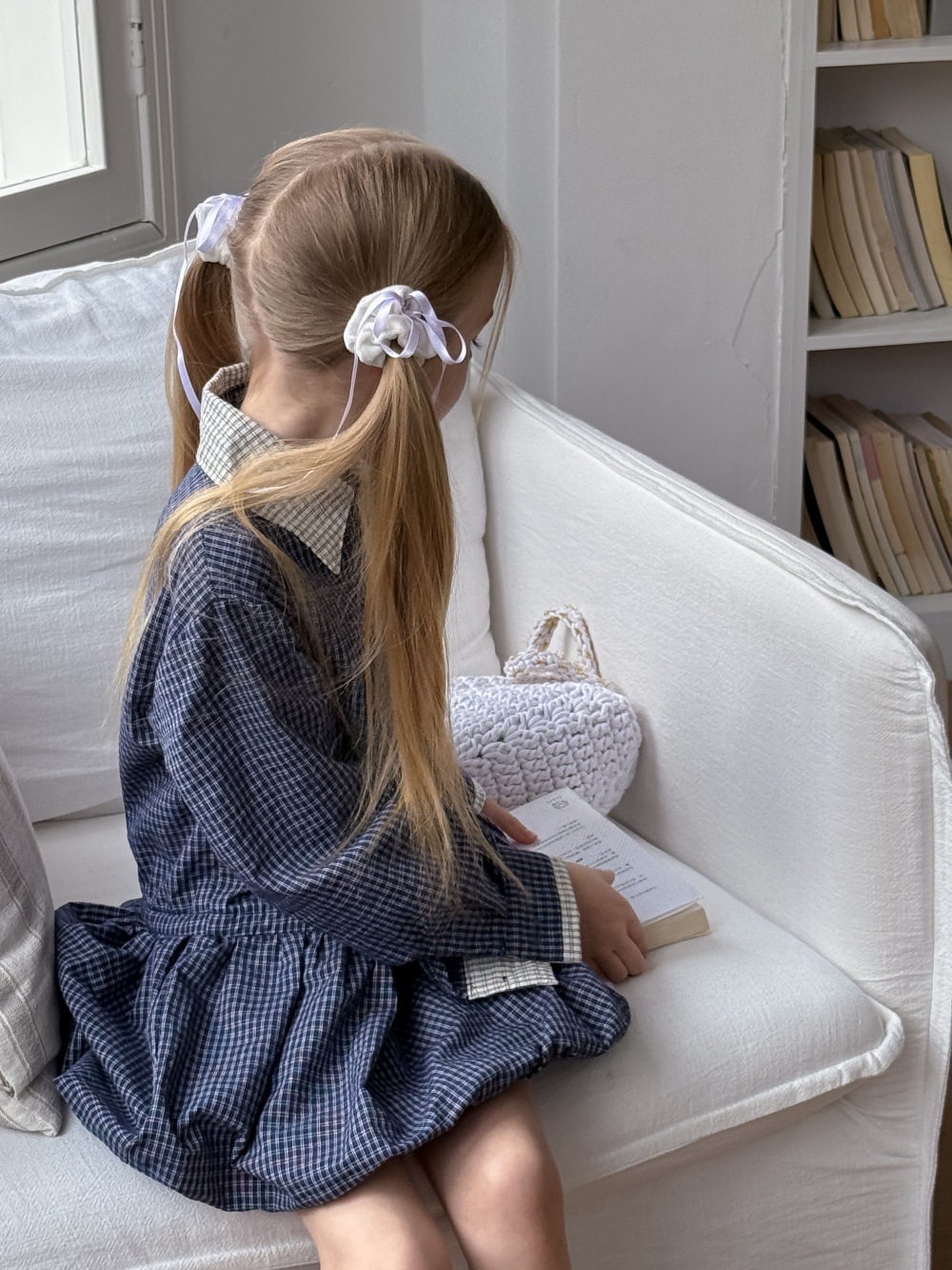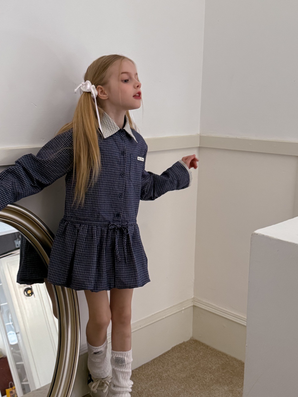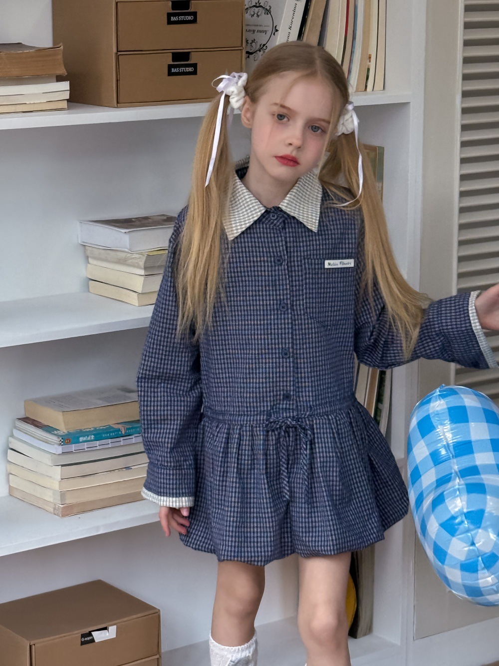 2025 여자 블루 격자 무늬 가을 새로운 한국어 버전 인형 칼라 긴 소매 드레스 어린이 복고풍 격자 무늬 셔츠 드레스스토어 가기