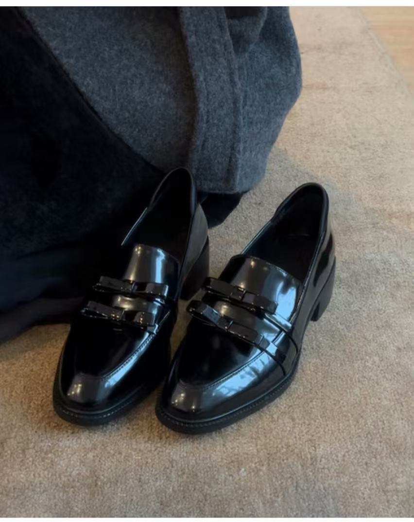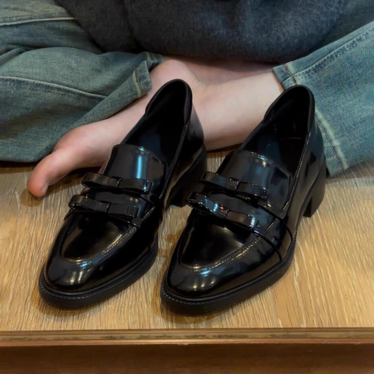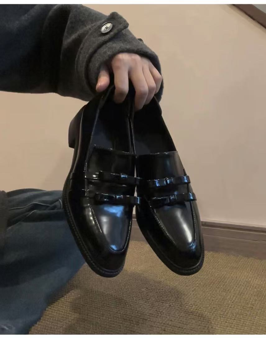 영국 스타일의 천연 가죽 로퍼 여성용 슬립온 통근화 프렌치 스타일 리본 굽이 두꺼운 작은 가죽 신발 통기성 좋고 편안함