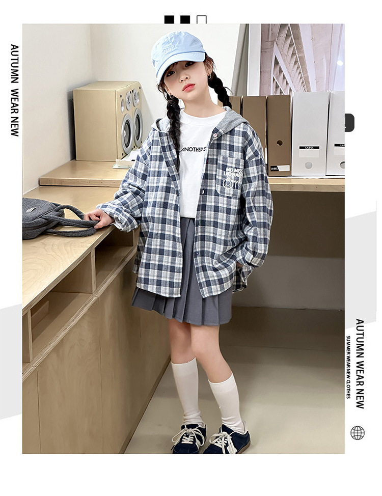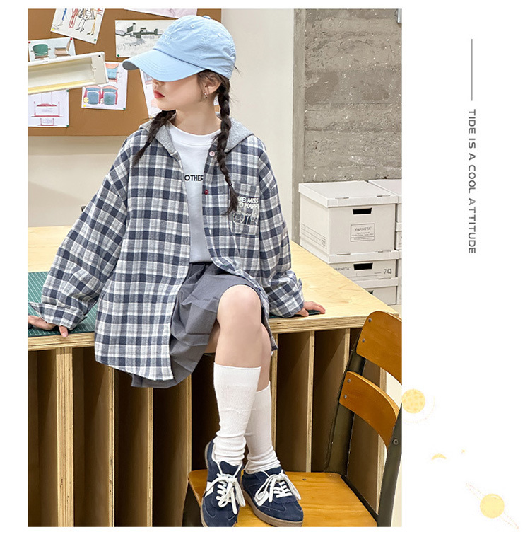 한국 버전의 아동복 도매 2025 새로운 소년 소녀 긴팔 셔츠 소녀 격자 무늬 후드 셔츠 헤어 세대스토어 가기