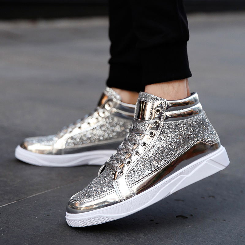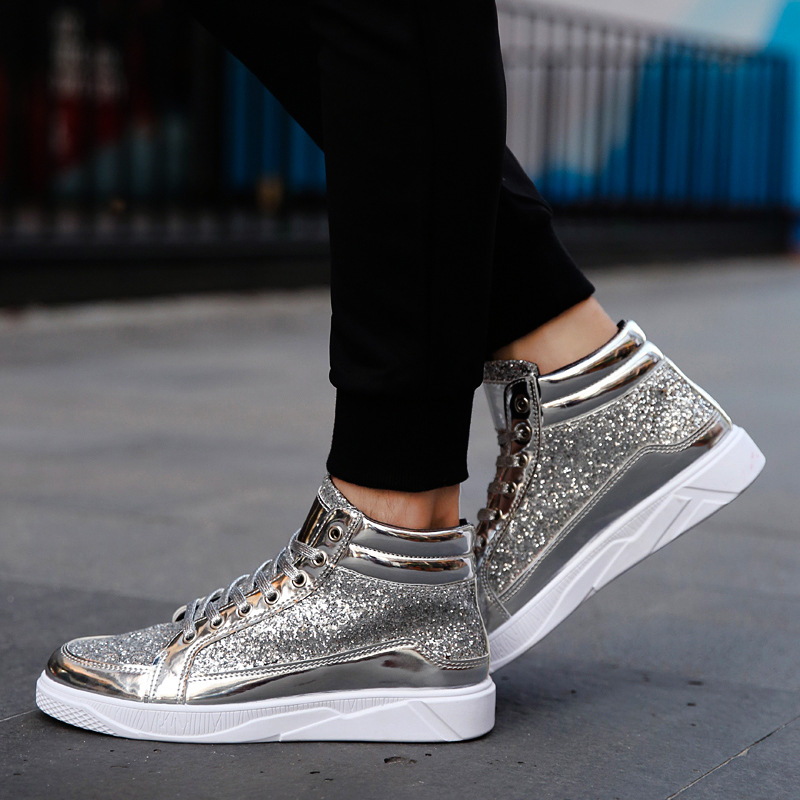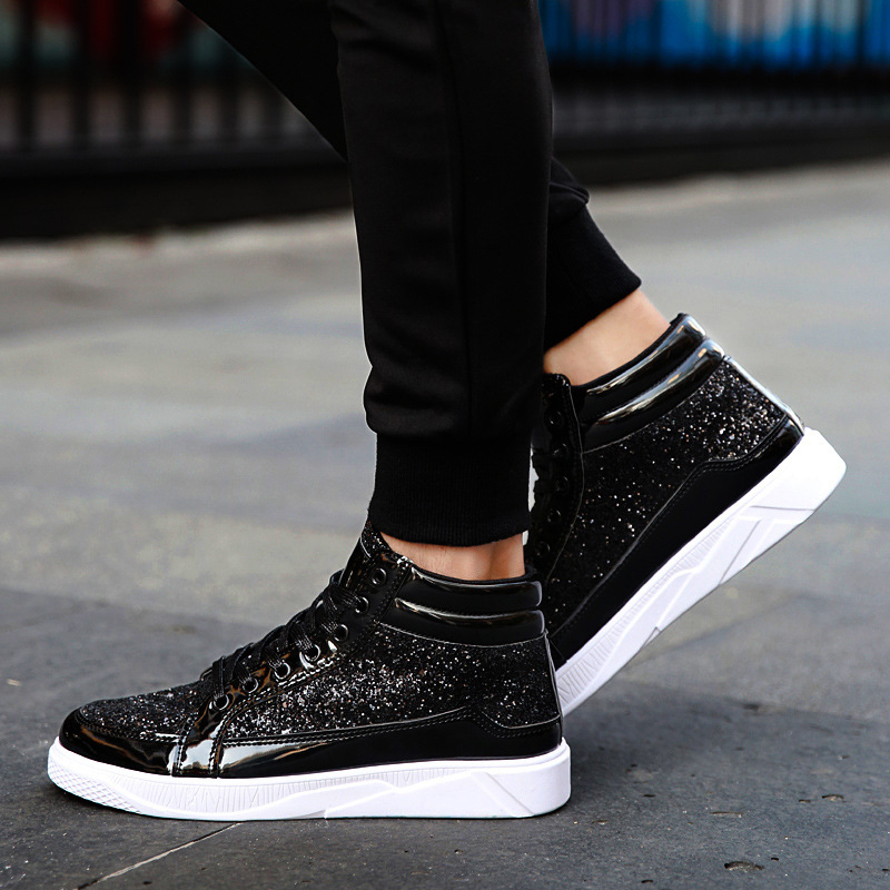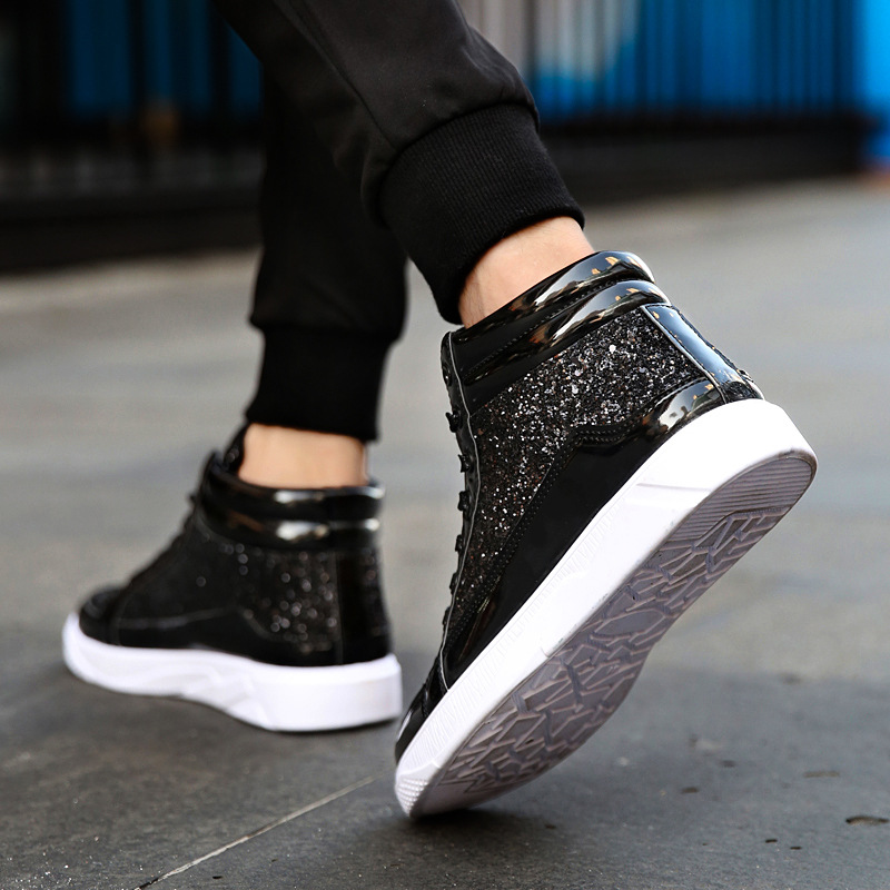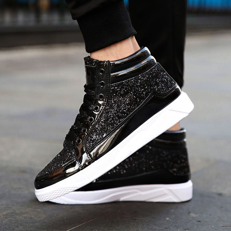 폭발성 남성 신발 사계절 한국 스타일 트렌디 한 캐주얼 신발 하이 탑 보드 신발 남성 나이트 필드 특허 가죽 반짝이는 얼굴 높이 증가 플러스 사이즈 트렌디 신발스토어 가기