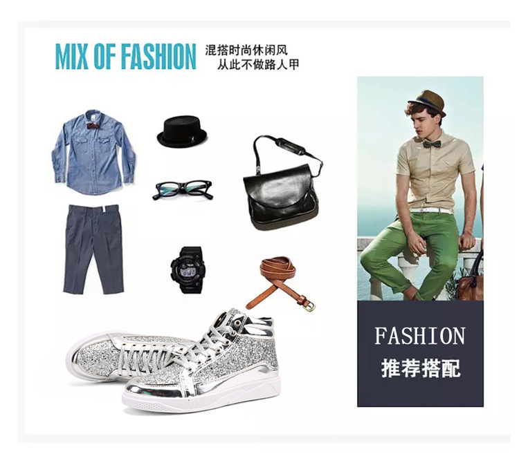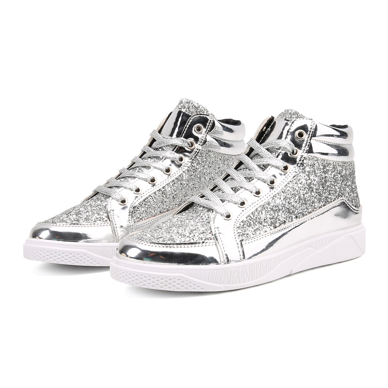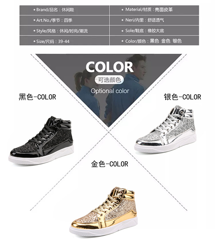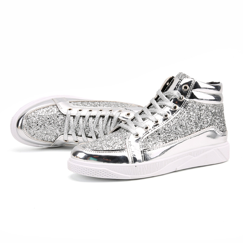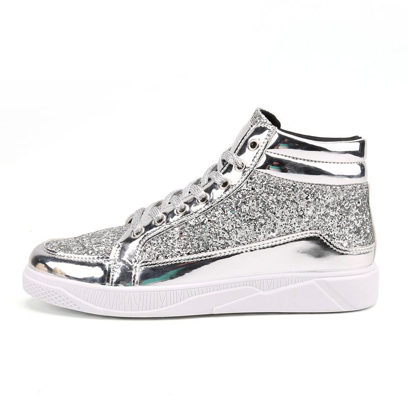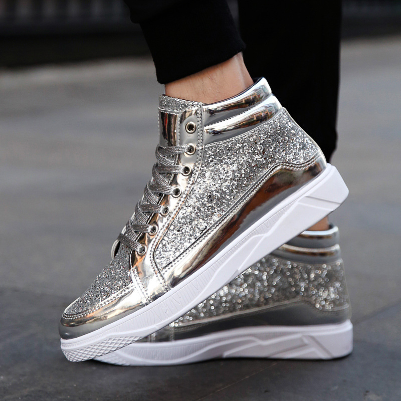폭발성 남성 신발 사계절 한국 스타일 트렌디 한 캐주얼 신발 하이 탑 보드 신발 남성 나이트 필드 특허 가죽 반짝이는 얼굴 높이 증가 플러스 사이즈 트렌디 신발스토어 가기