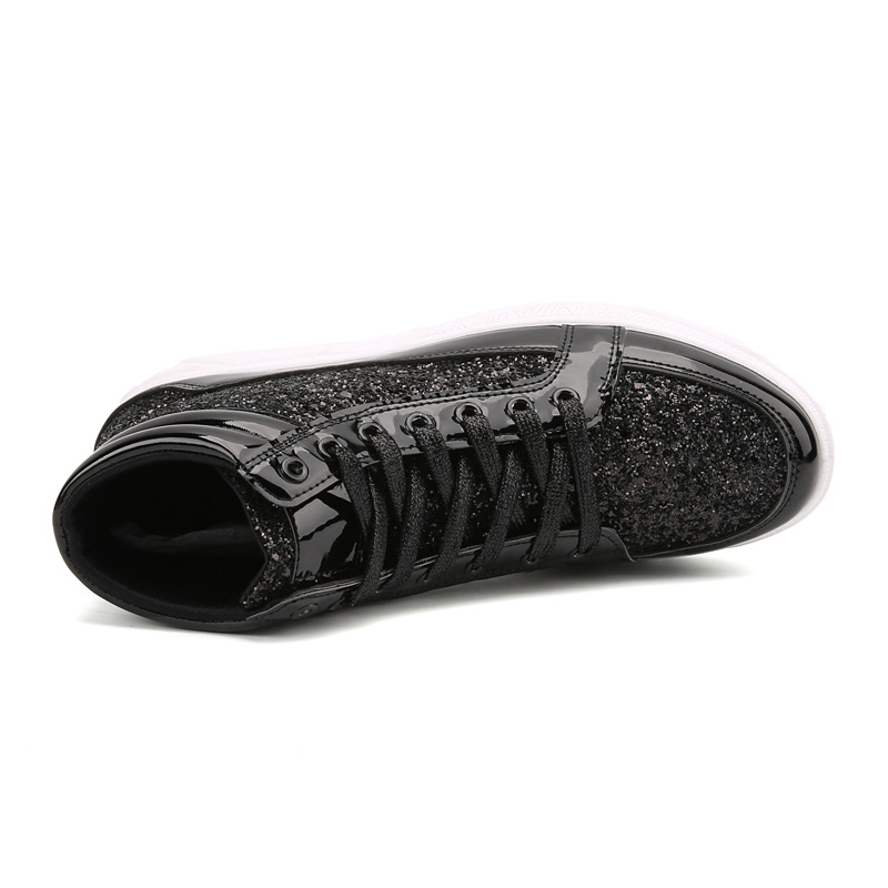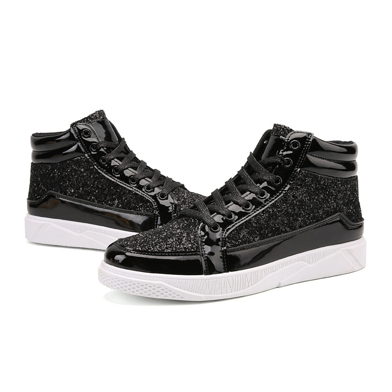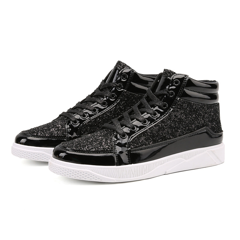 폭발성 남성 신발 사계절 한국 스타일 트렌디 한 캐주얼 신발 하이 탑 보드 신발 남성 나이트 필드 특허 가죽 반짝이는 얼굴 높이 증가 플러스 사이즈 트렌디 신발