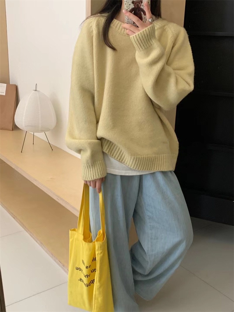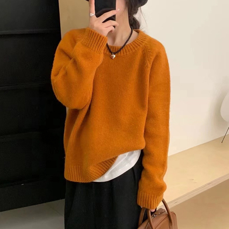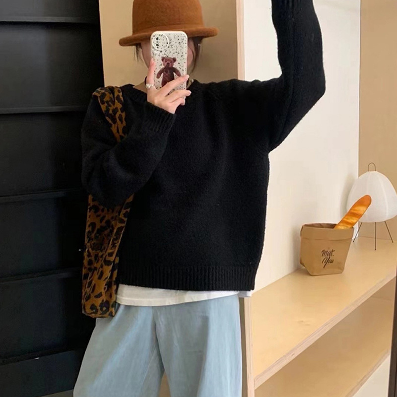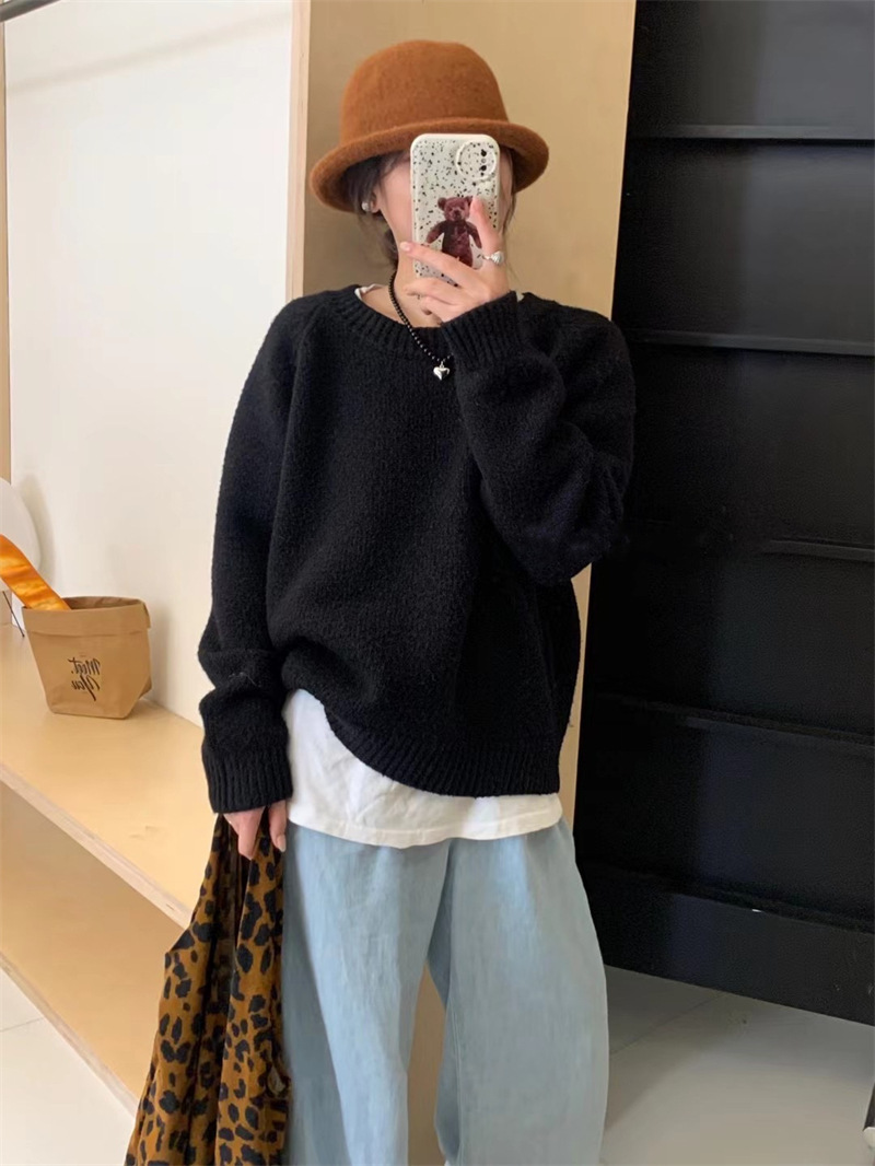페나 리치 올 매치 스웨터 여자 두꺼운 느슨한 가을과 겨울 새로운 라운드 넥 간단한 솔리드 컬러 한국 스타일 니트 탑