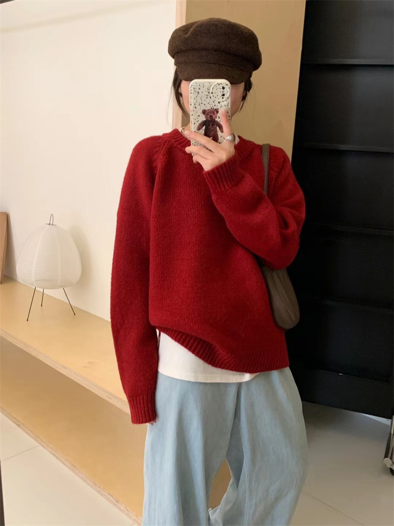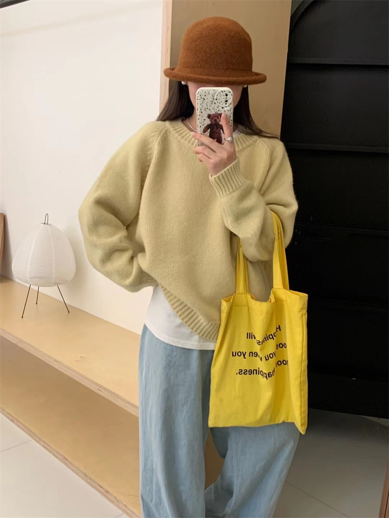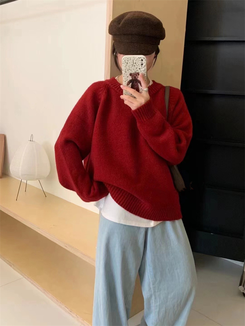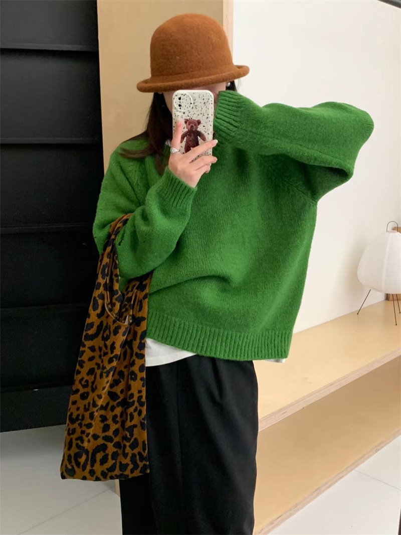페나 리치 올 매치 스웨터 여자 두꺼운 느슨한 가을과 겨울 새로운 라운드 넥 간단한 솔리드 컬러 한국 스타일 니트 탑