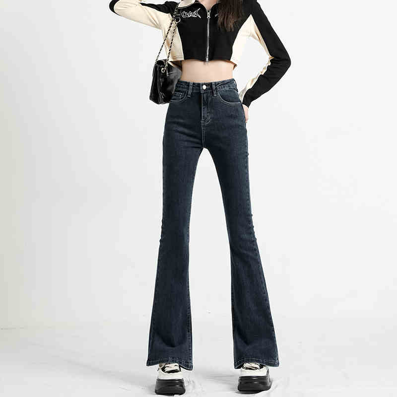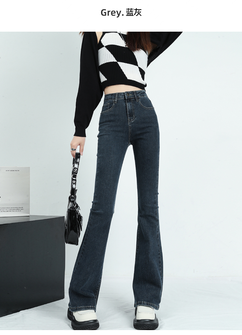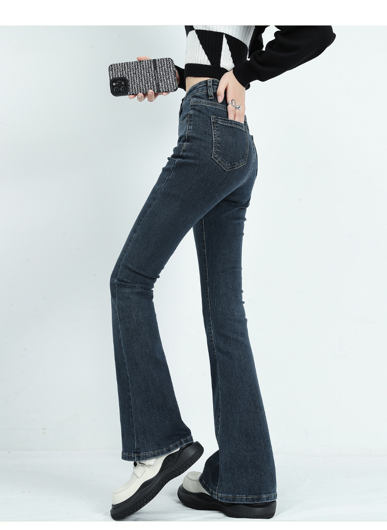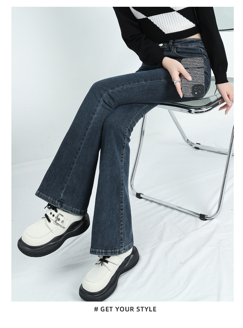 빈티지 기모 아마 청바지 여성의 가을과 겨울 새로운 높은 허리 슬림 핏 슬리밍 미국 말굽 플래 팬츠