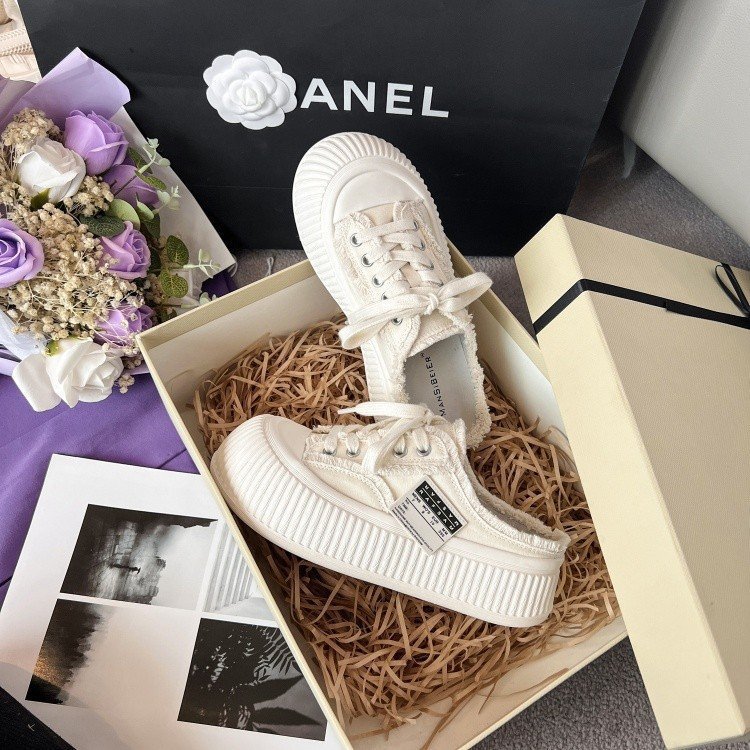 게으른 발가락 캔버스 신발 여성의 새로운 두꺼운 단독 여름 겉옷 샤넬 스타일 화이트 신발 한국 스타일 슬립 온 하프 슬리퍼스토어 가기