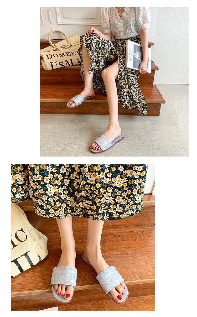 2025 여름 의상 여성 신발 플랫 하단 스퀘어 헤드 비치 여행 캐주얼 올 매치 슬리퍼 자수 편지