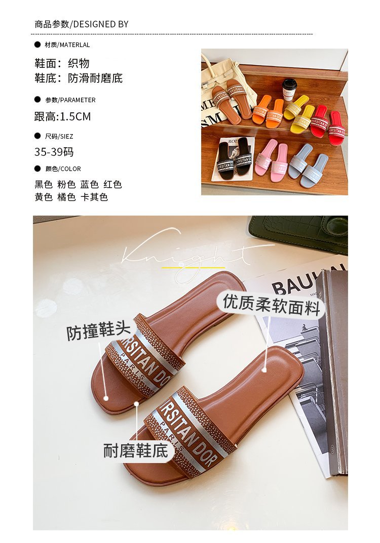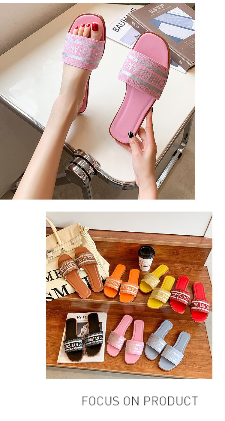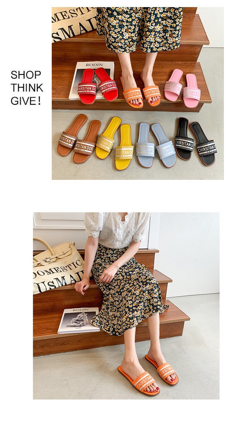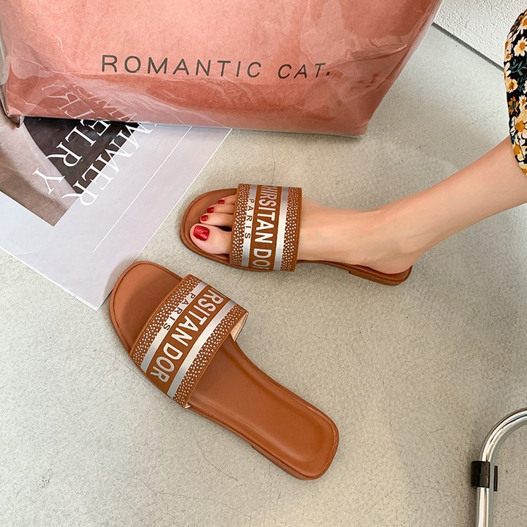 2025 여름 의상 여성 신발 플랫 하단 스퀘어 헤드 비치 여행 캐주얼 올 매치 슬리퍼 자수 편지스토어 가기