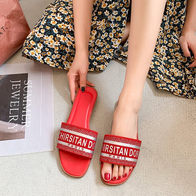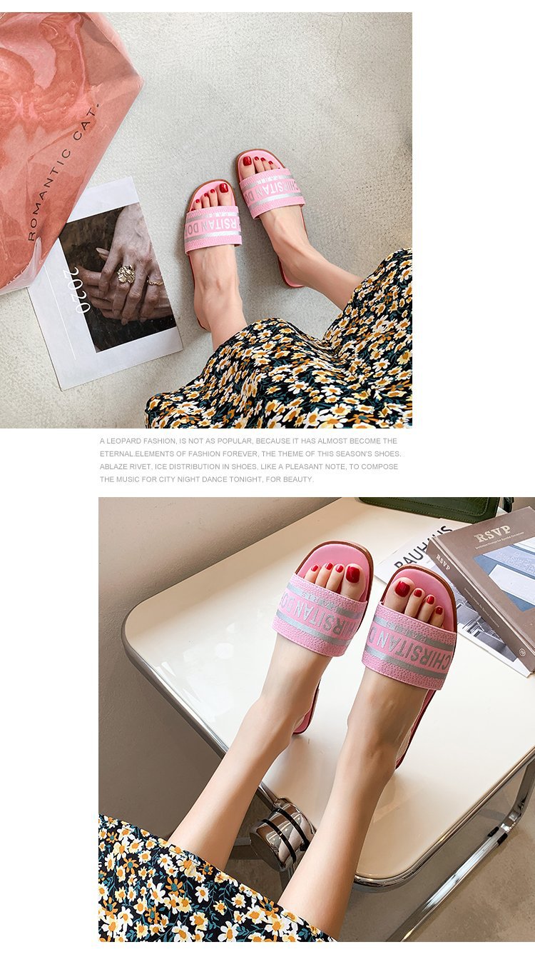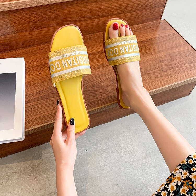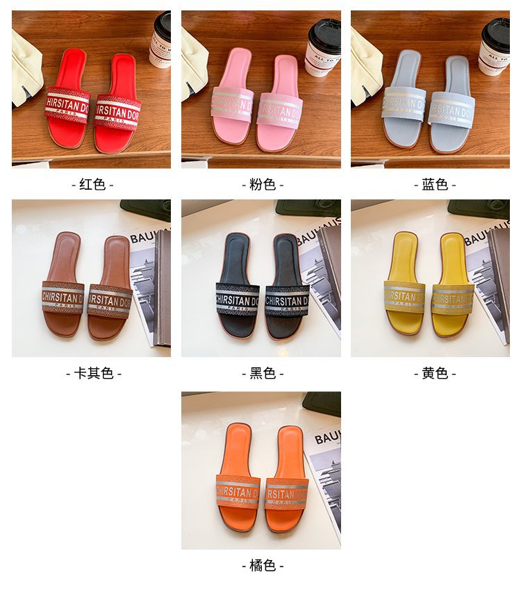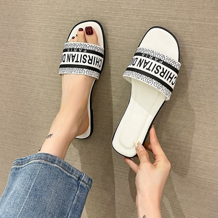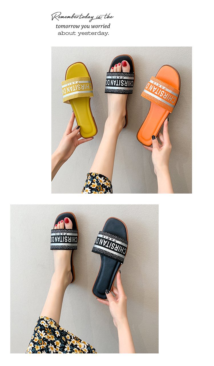 2025 여름 의상 여성 신발 플랫 하단 스퀘어 헤드 비치 여행 캐주얼 올 매치 슬리퍼 자수 편지스토어 가기