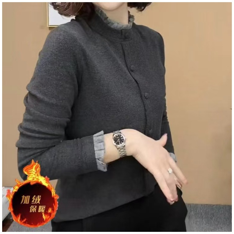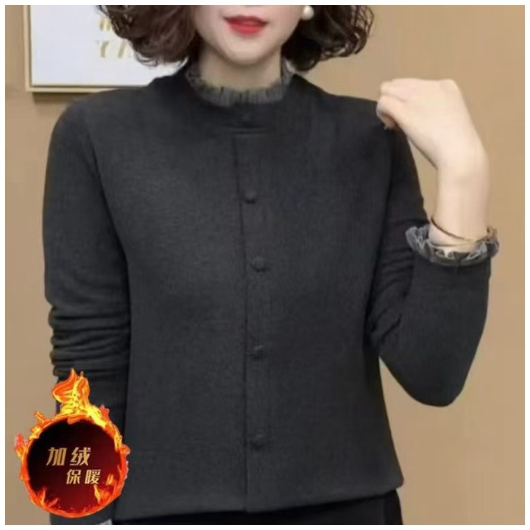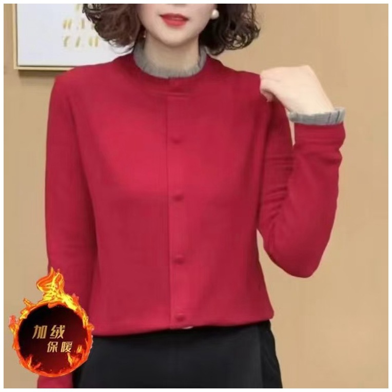 2024 년 겨울 새 바느질 긴 소매 서양 스타일 어머니의 작은 셔츠 육체 커버 대조 크루 넥 양면 양털 백킹 탑
