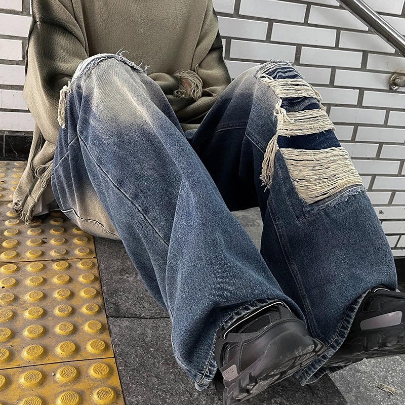 아메리칸 스타일 레트로 찢어진 청바지 남성용 여름 오래 된 느슨한 넓은 다리 스트레이트 튜브 트렌디 브랜드 하이 스트리트 팬츠스토어 가기