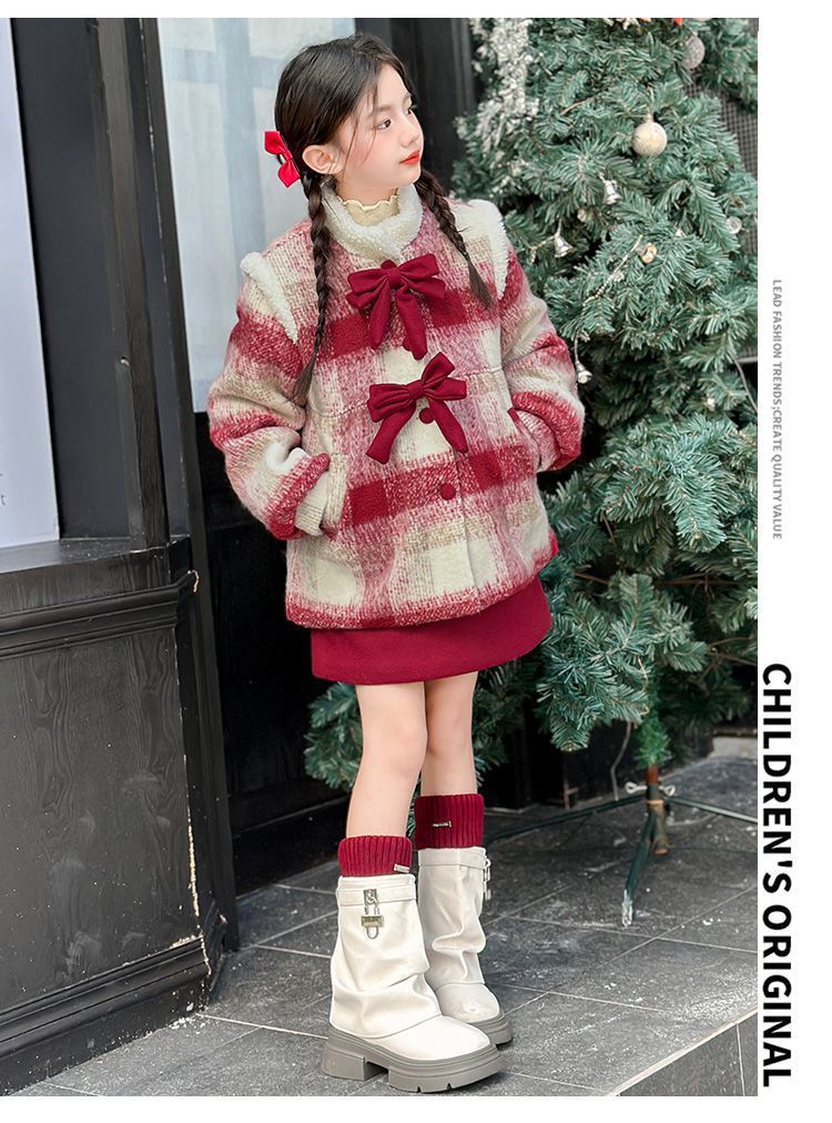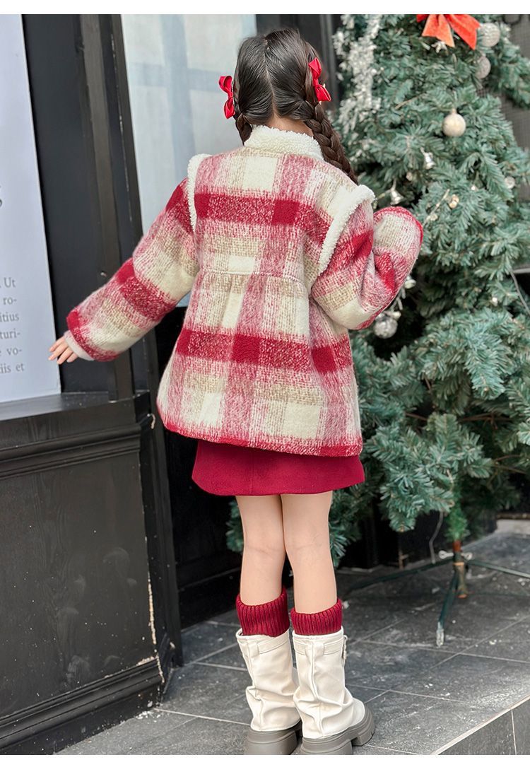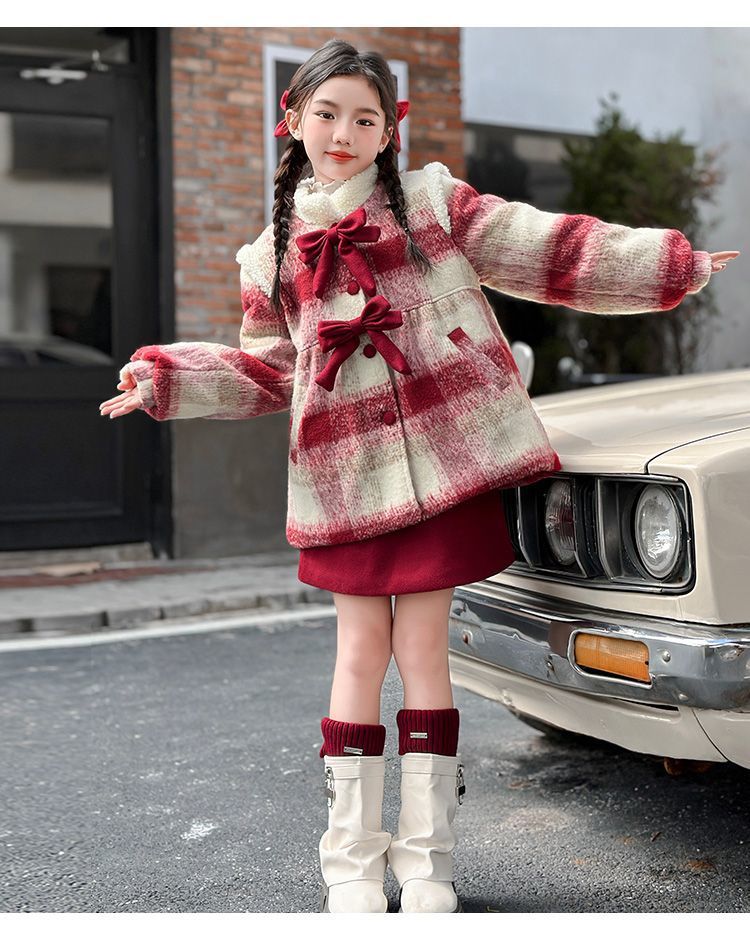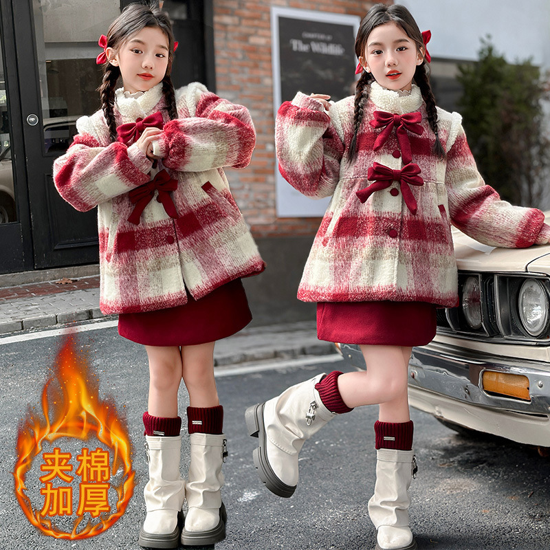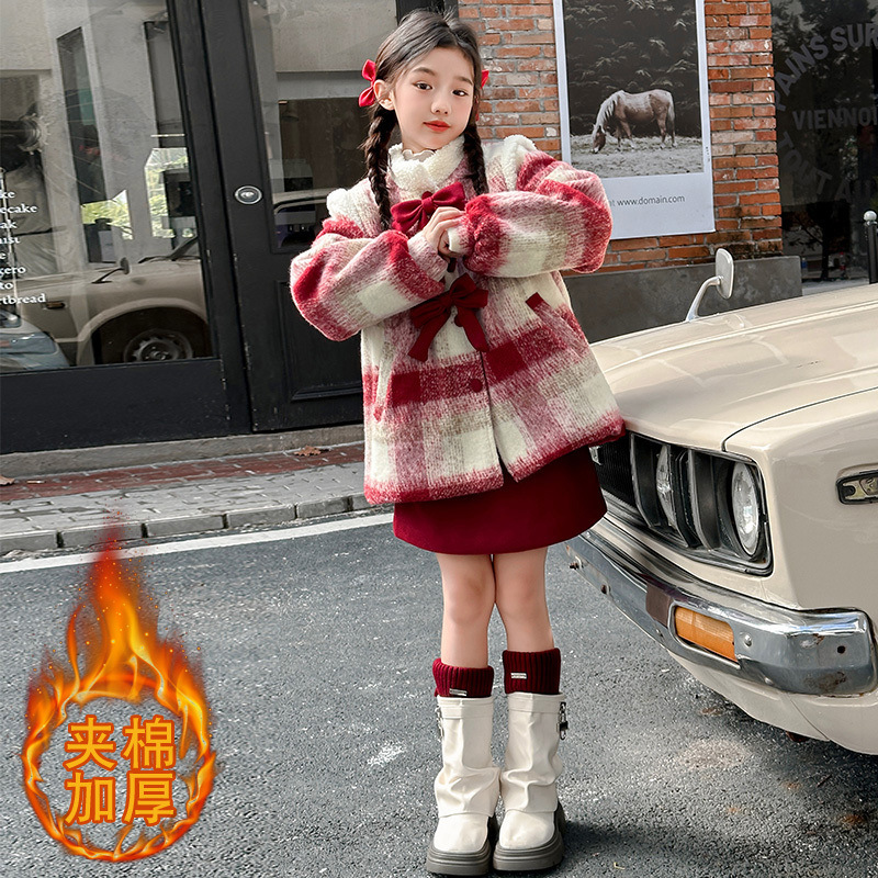 소녀의 겨울 치마 세트 가을과 겨울 2024 새로운 어린이 크리스마스 전쟁 가운 스커트 소녀 큰 어린이 샤넬 스타일 신년 옷