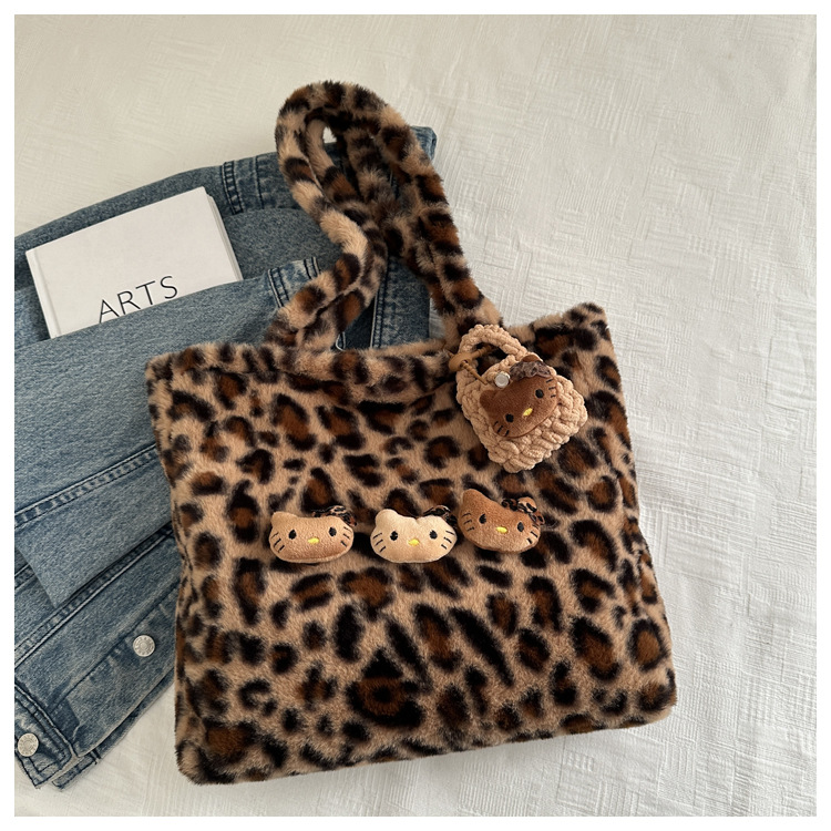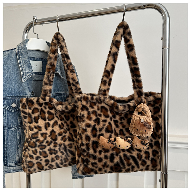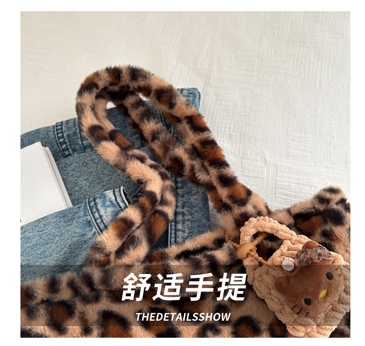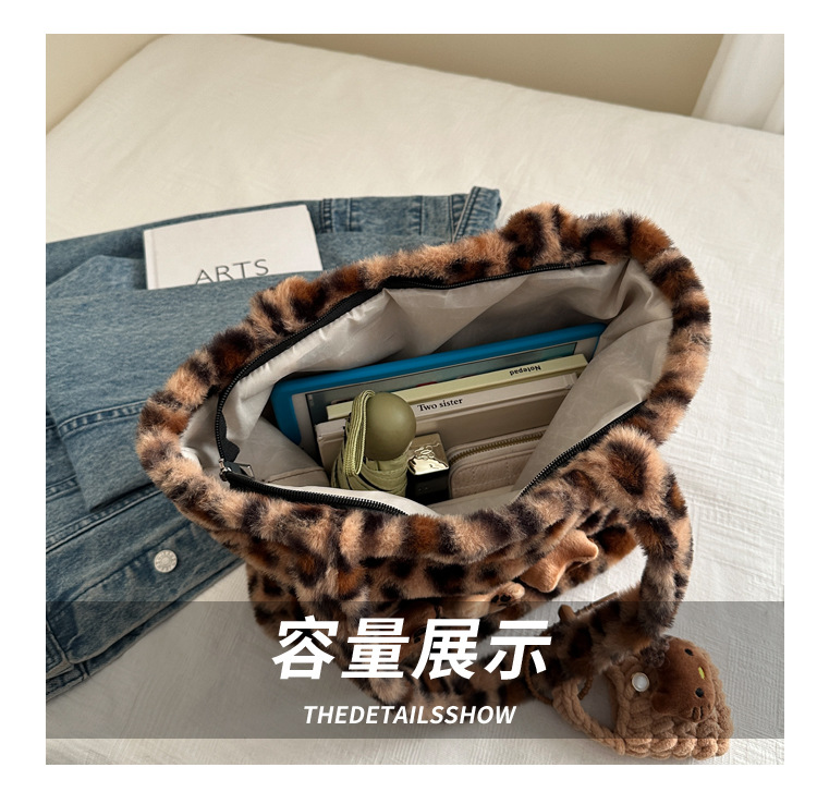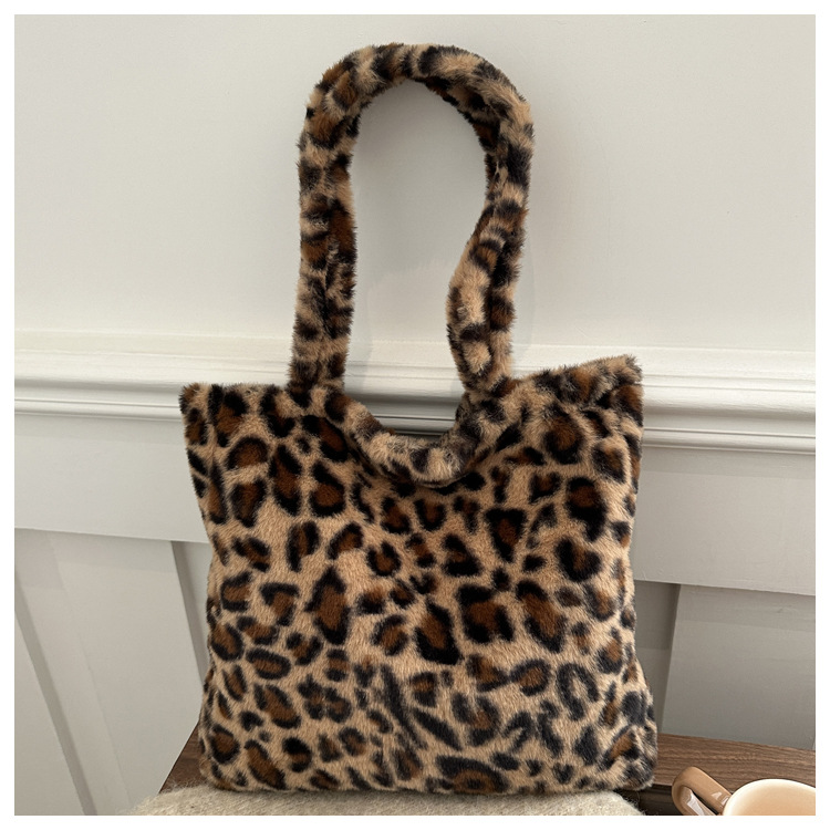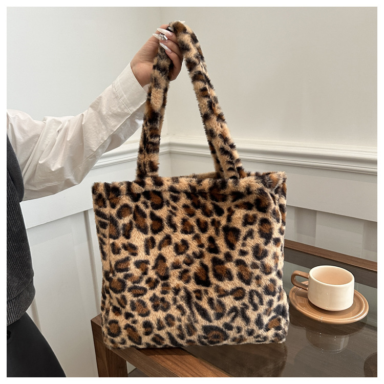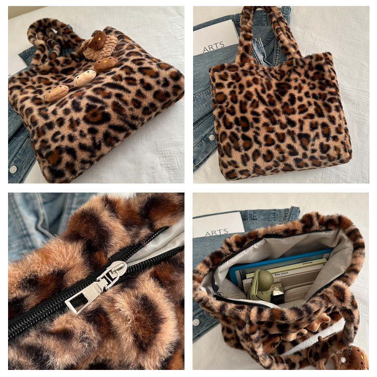 가을과 겨울 새로운 봉제 레오파드 토트 백 푹신한 대용량 어깨 가방 가을과 겨울 귀여운 게으른 스타일 속옷 가방