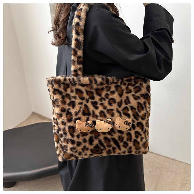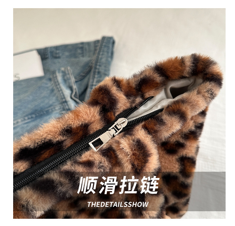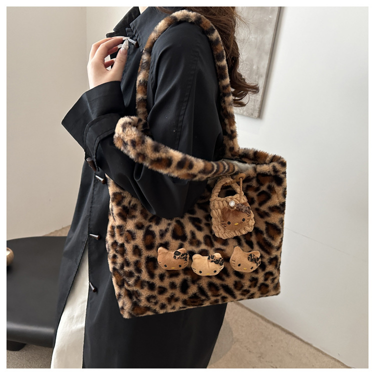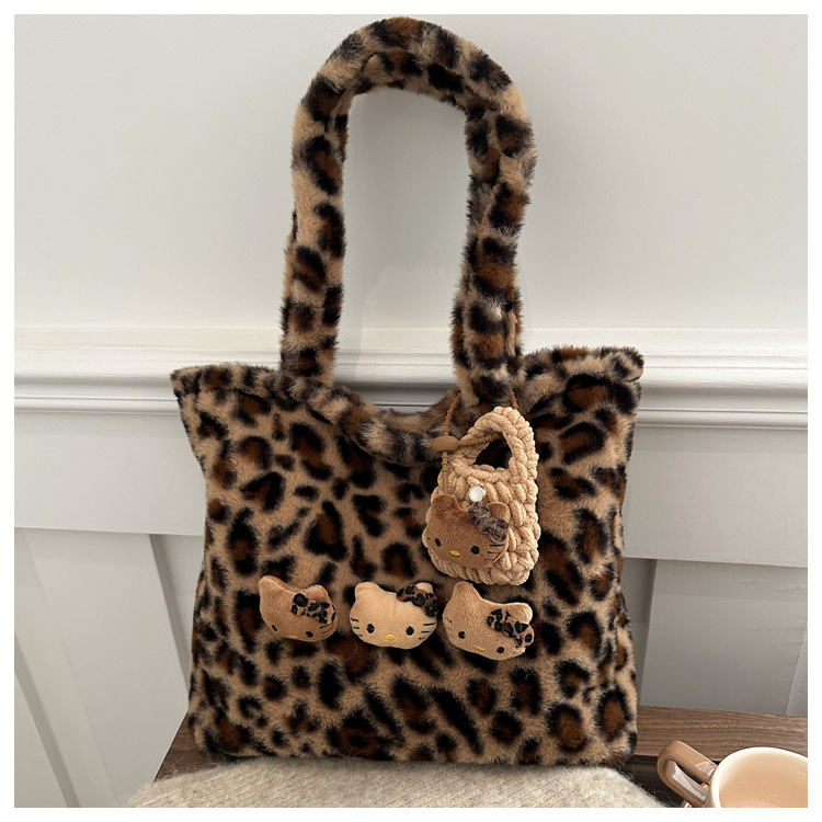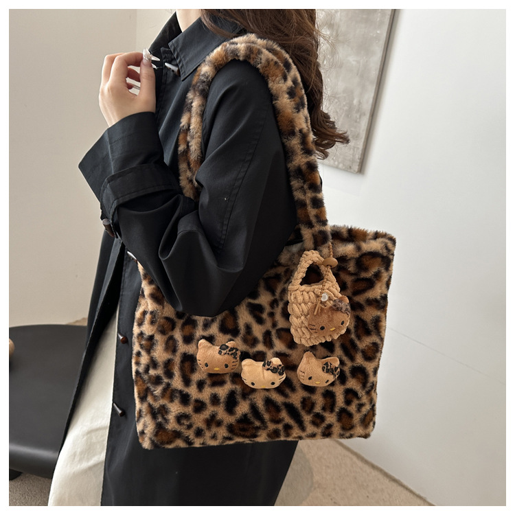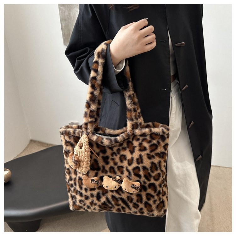 가을과 겨울 새로운 봉제 레오파드 토트 백 푹신한 대용량 어깨 가방 가을과 겨울 귀여운 게으른 스타일 속옷 가방
