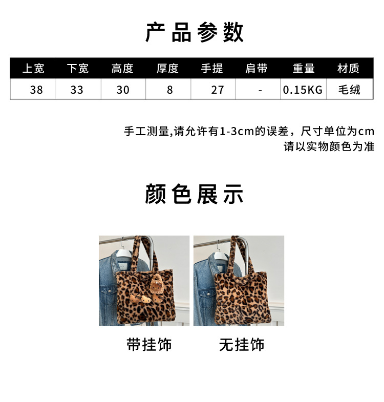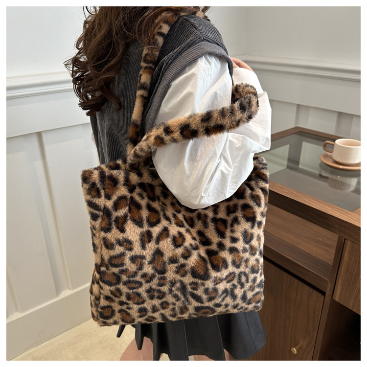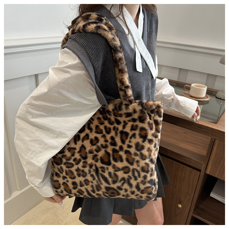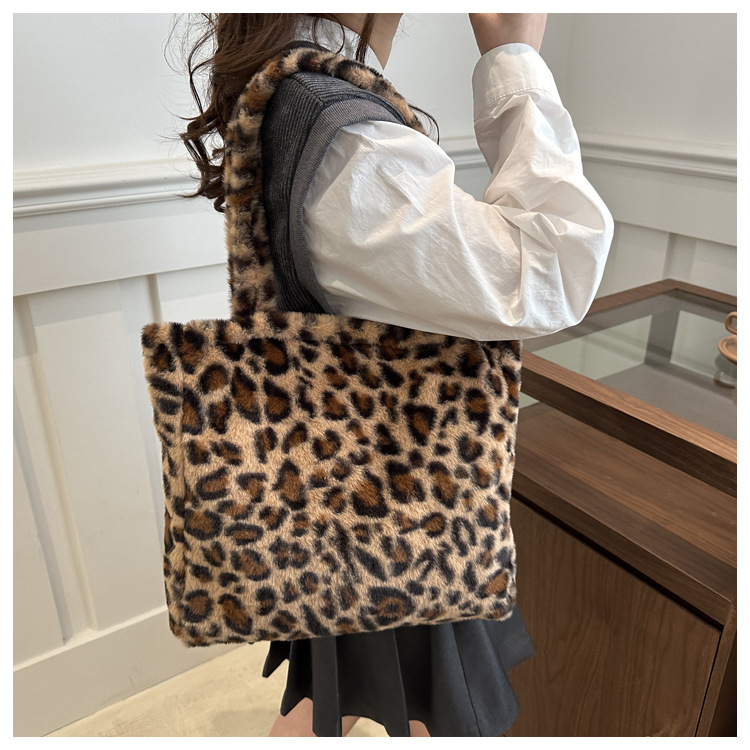 가을과 겨울 새로운 봉제 레오파드 토트 백 푹신한 대용량 어깨 가방 가을과 겨울 귀여운 게으른 스타일 속옷 가방스토어 가기
