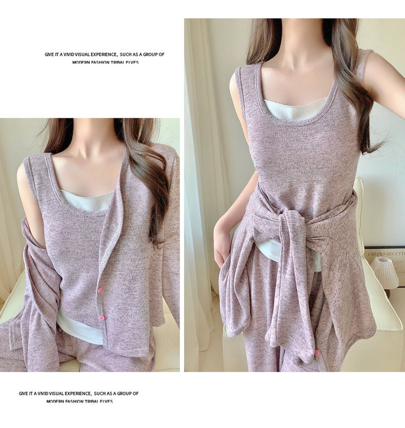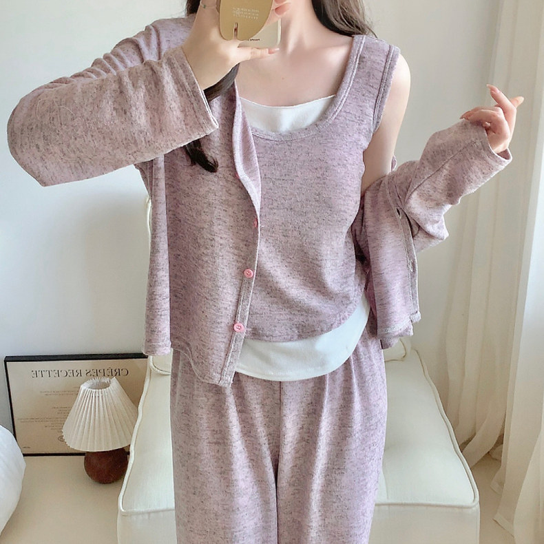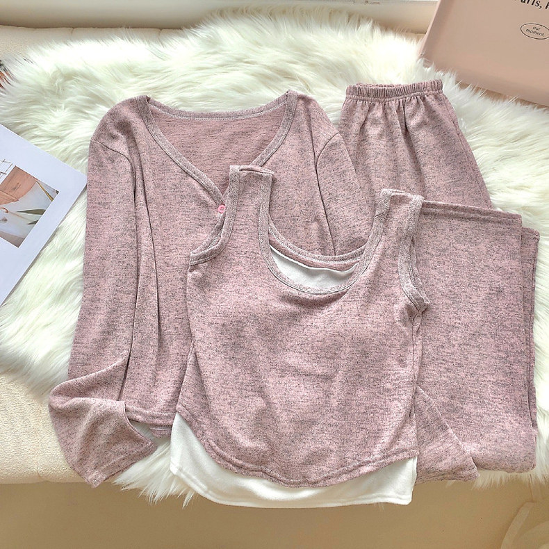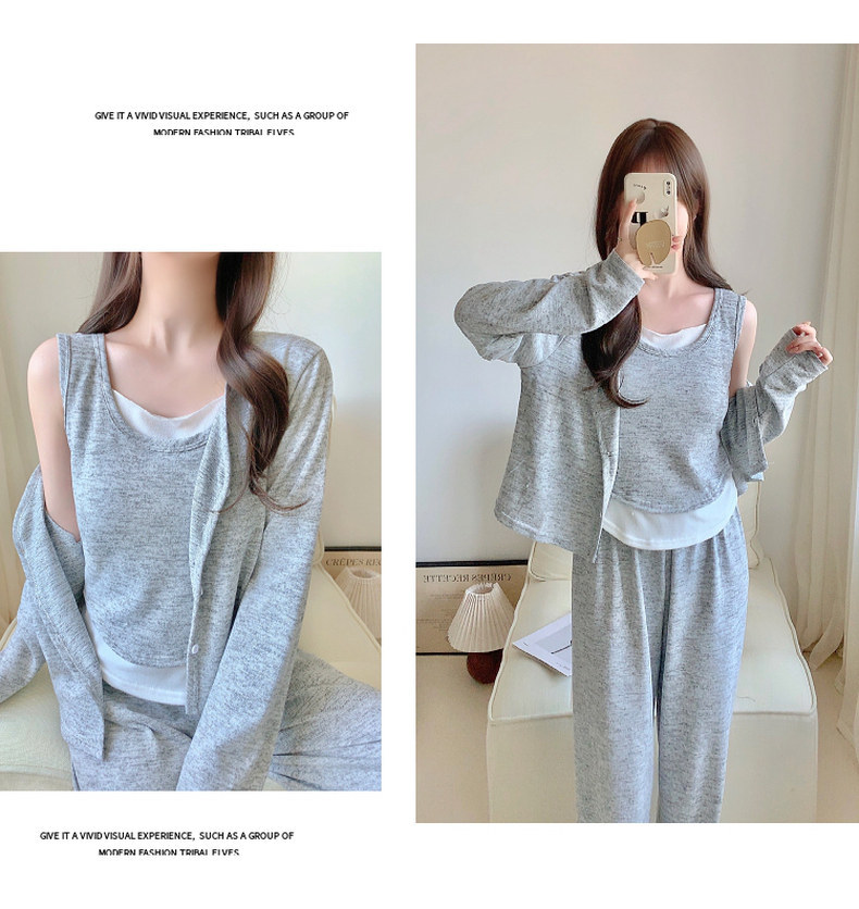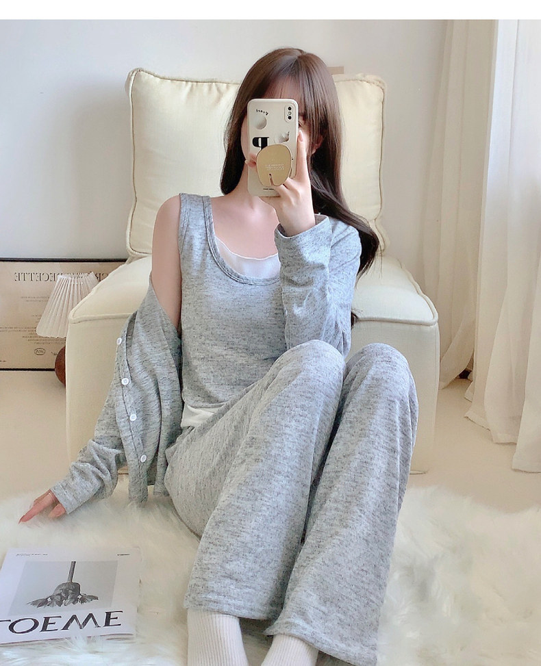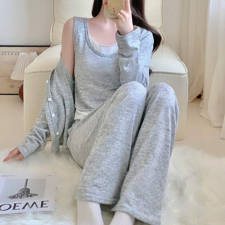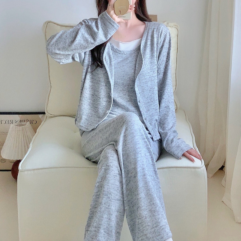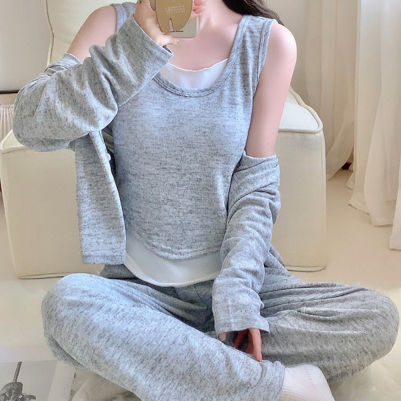 한국 스타일 Ins 스타일 파자마 여성 가을 및 겨울 샌딩 가슴 패드 슬링 긴 소매 바지 순수 3 피스 홈 의류