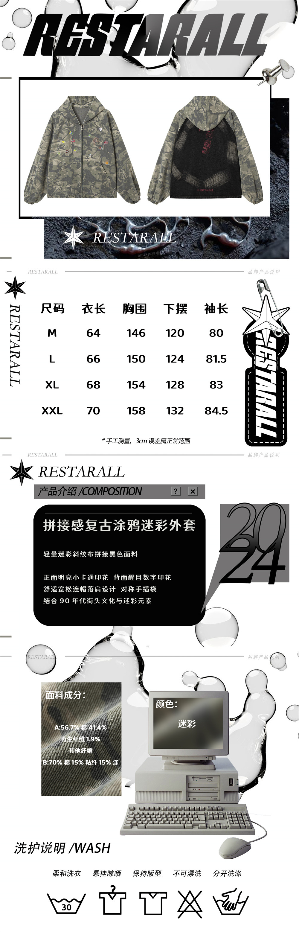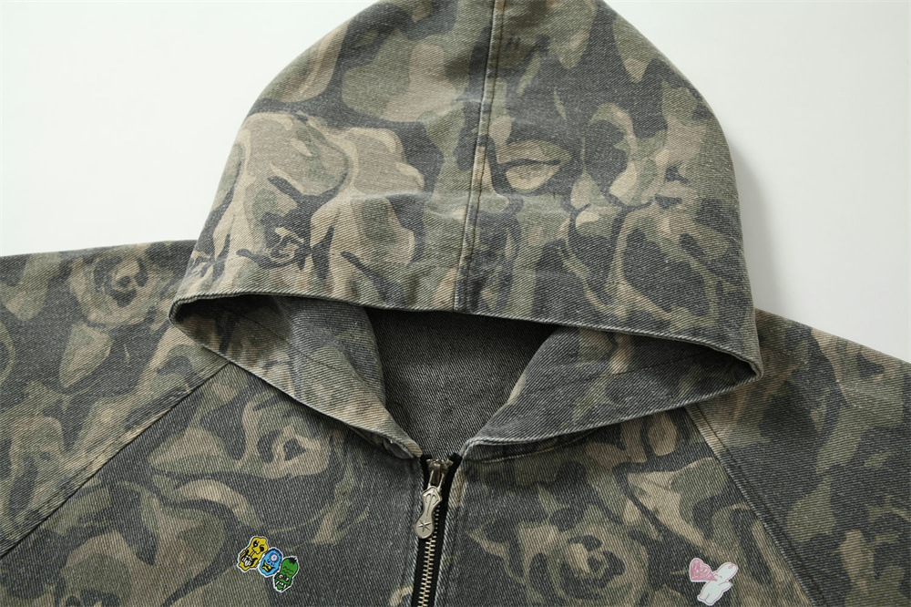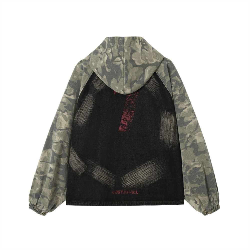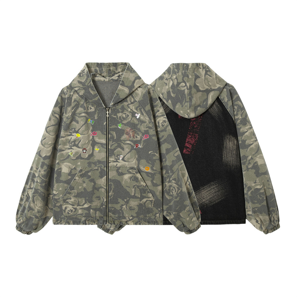유럽과 미국의 하이 스트리트 남성 코트 남성과 여성의 독특한 위장 후드 낙서 스티칭 새로운 루즈 트렌디 브랜드 남성 코트스토어 가기