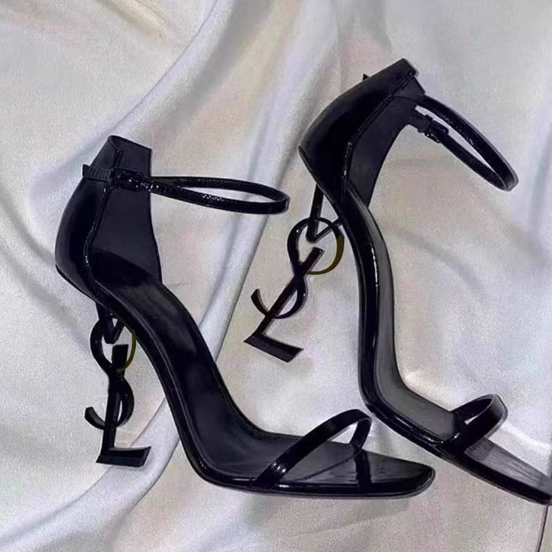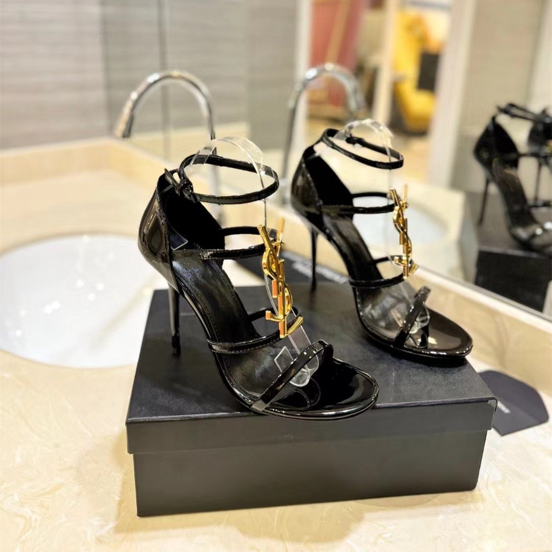YS 같은 스타일 여름 인터넷 연예인 우아한 섹시 스틸레토 힐 블랙 하이힐 다목적 오픈 발가락 가죽 스트랩 샌들 여성