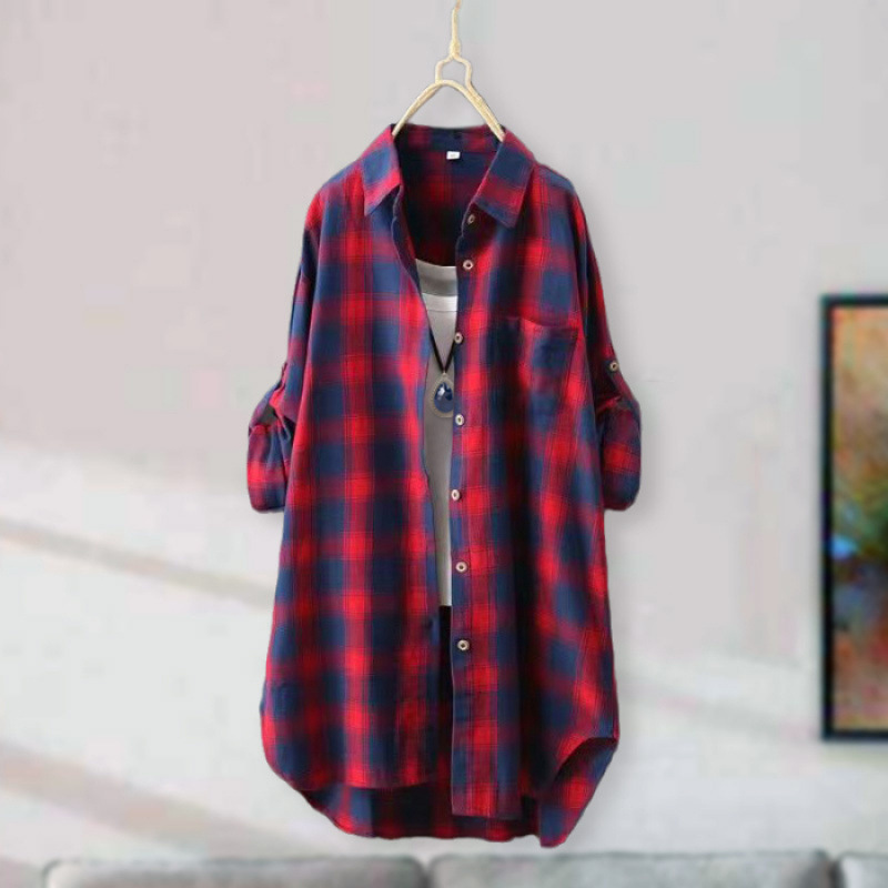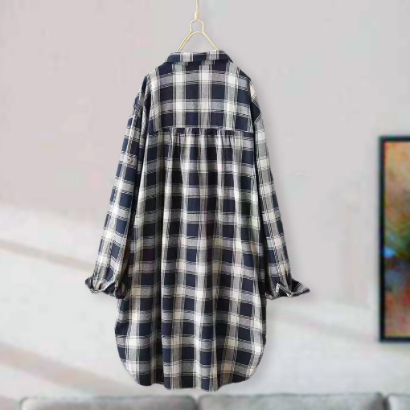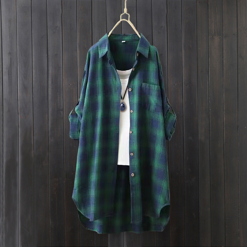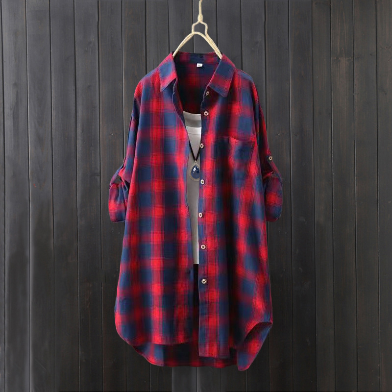 여성용 체크무늬 긴팔 셔츠, 레트로 스타일 중간 길이 상의, 루즈핏 얇은 코트, 봄 가을 셔츠, 컬러 직조 공법